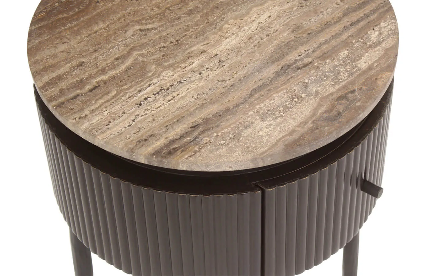 RUSSO BROWN е помощна маса от колекцията на нидерландския бранд Richmond Interiors. Основата и структурата са изработени от метал, MDF и Brass Plating – финиш Brown. Плотът е изработен от Travertine. Помощната маса е с размери см. Ø40/70H.