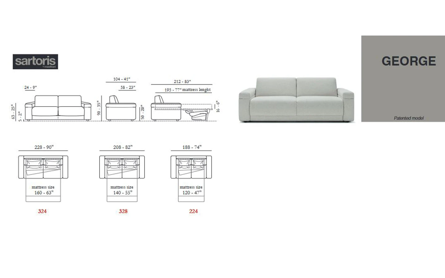 Разтегателният диван GEORGE от SARTORIS by Max Divani е модерен и функционален модел, създаден да допълва съвременните жилищни пространства. Този разтегателен диван въплъщава години на традиция, майсторска изработка и внимание към детайла, предоставяйки практичност и комфорт за пълноценна почивка по всяко време на деня и нощта. С едно просто накланящо движение на седалката GEORGE се трансформира в легло, осигуряващо пълноценен сън благодарение на матрак с височина 16 см.