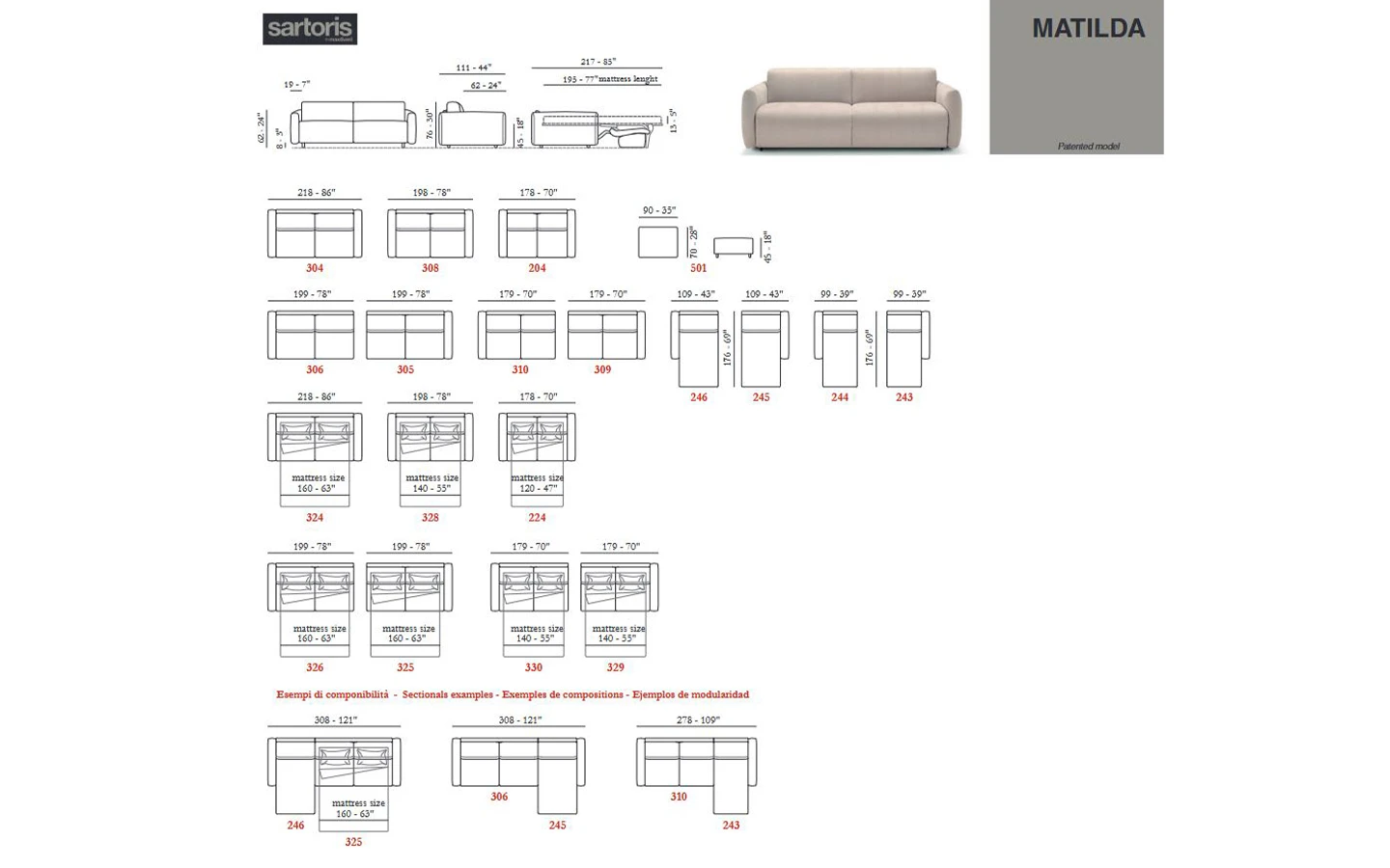 Разтегателният диван MATILDA от SARTORIS by Max Divani е олицетворение на съвременния дизайн, като хармонично съчетава естетика, функционалност и комфорт, същевременно запазвайки прецизната занаятчийска изработка. Този модел предлага разнообразие от композиции, включително варианти с лежанка, което позволява адаптиране към различни пространства и индивидуални предпочитания. Освен че служи като елегантно решение за сядане, MATILDA лесно се трансформира в двойно легло. Разтегателният диван MATILDA е пример за ангажимента на SARTORIS към качествена изработка и иновативен дизайн, предлагайки перфектен баланс между стил, удобство и практичност за съвременния дом.