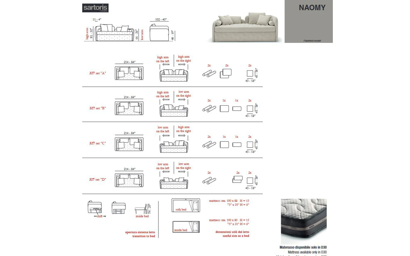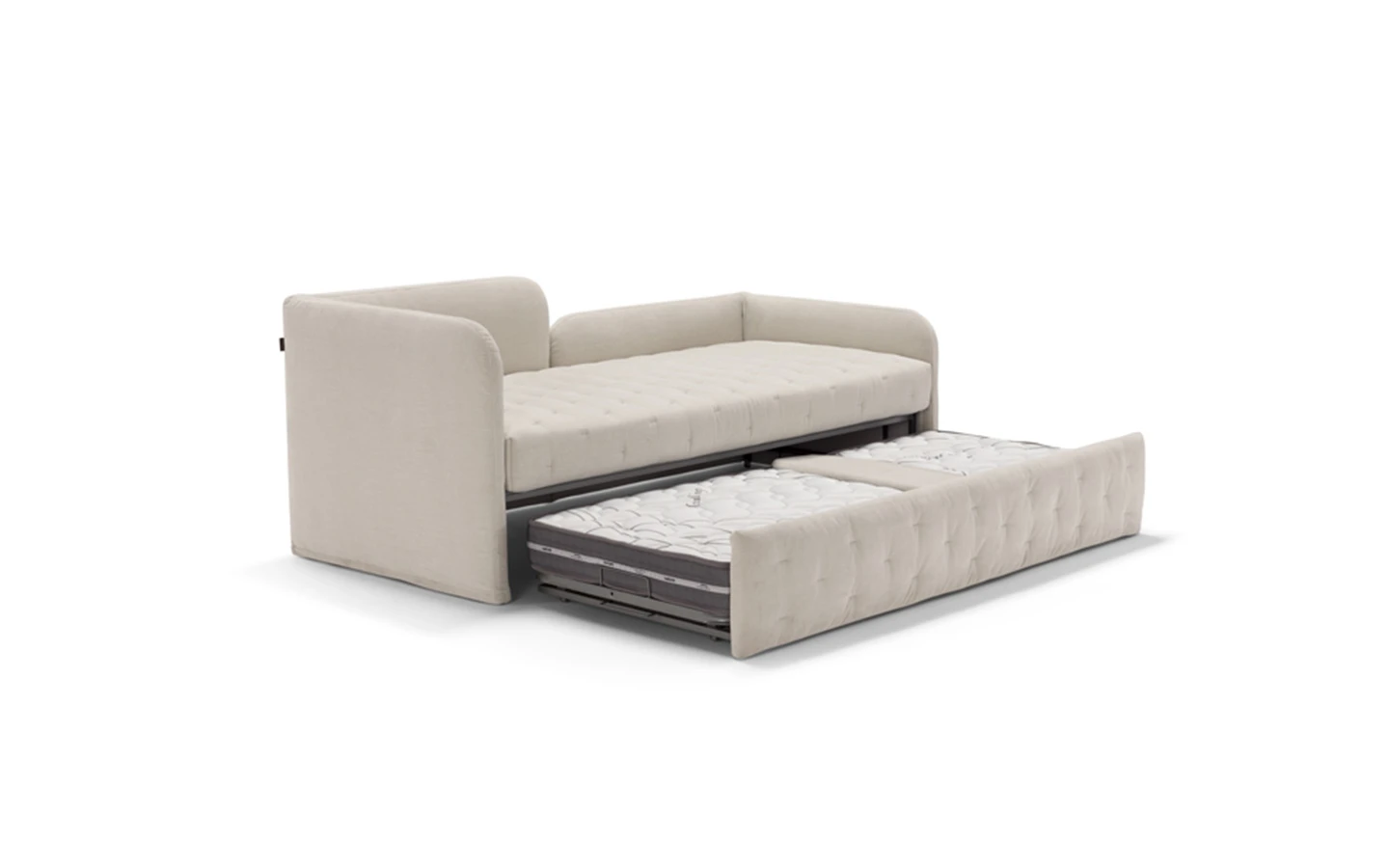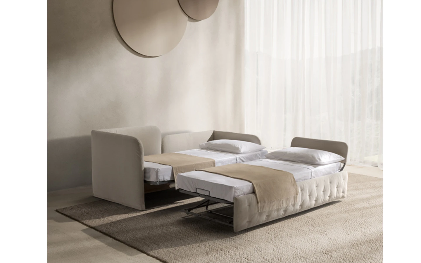 Разтегателният диван NAOMY от SARTORIS by Max Divani е многофункционален модел, създаден да осигури максимална практичност в компактни пространства. Моделът NAOMY е не само визуално атрактивен, но и изключително удобен по всяко време на деня, с допълнителен бонус – възможност за трансформиране в две единични легла. Първото легло се образува от зоната за сядане, докато друго единично легло се получава чрез изтегляне на втора основа, която се повдига до височината на другото легло с просто натискане на лост.