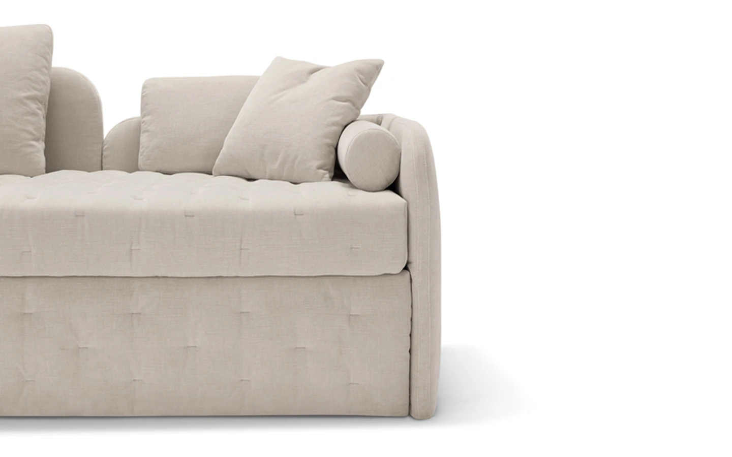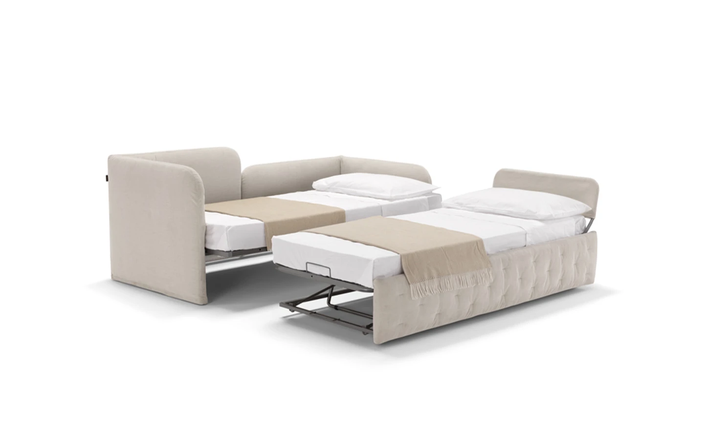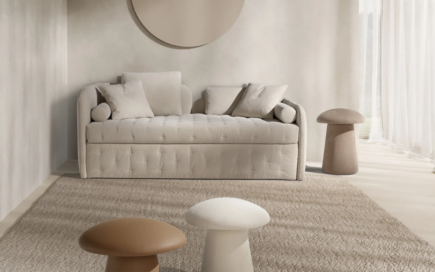 Разтегателният диван NAOMY от SARTORIS by Max Divani е многофункционален модел, създаден да осигури максимална практичност в компактни пространства. Моделът NAOMY е не само визуално атрактивен, но и изключително удобен по всяко време на деня, с допълнителен бонус – възможност за трансформиране в две единични легла. Първото легло се образува от зоната за сядане, докато друго единично легло се получава чрез изтегляне на втора основа, която се повдига до височината на другото легло с просто натискане на лост.