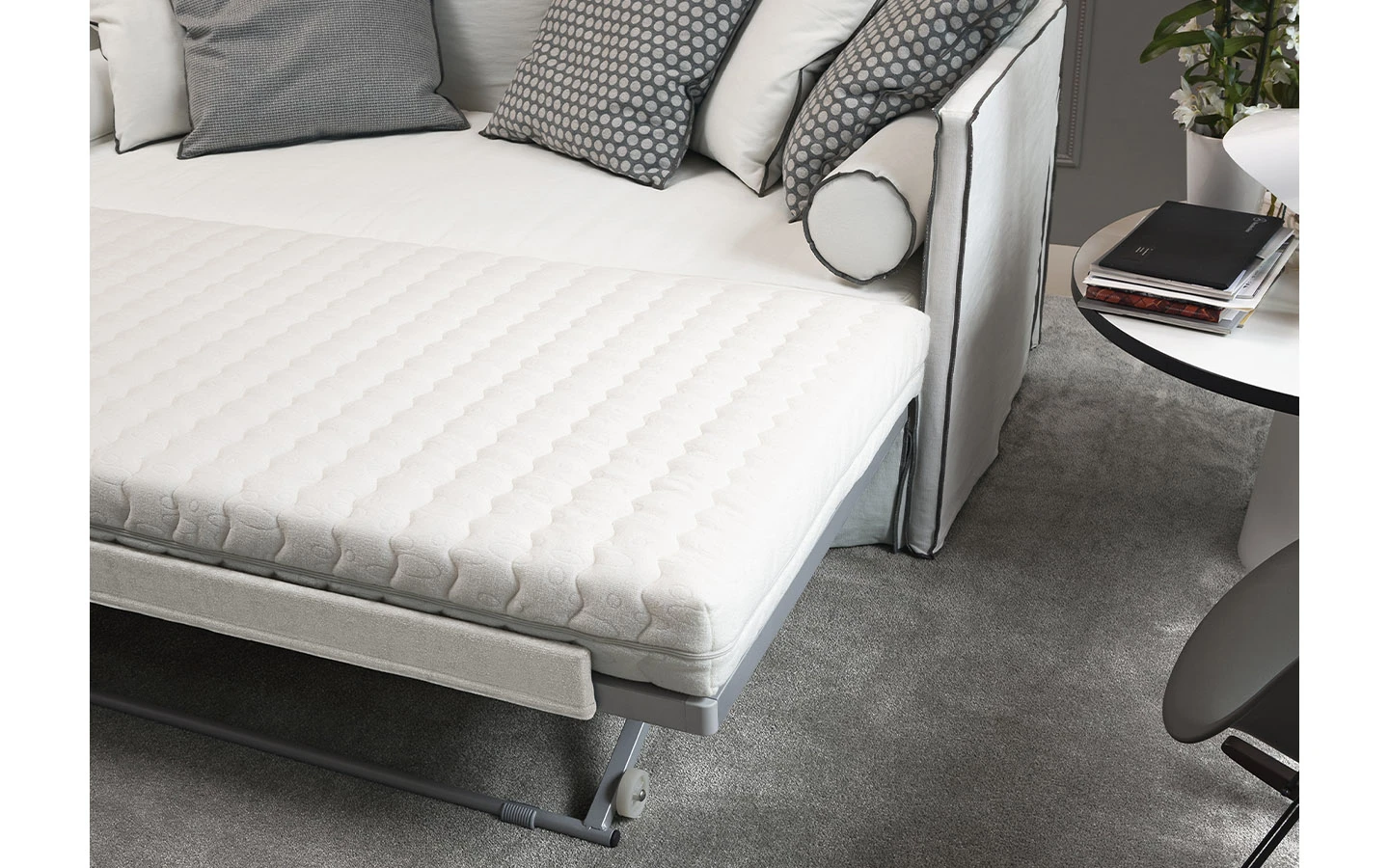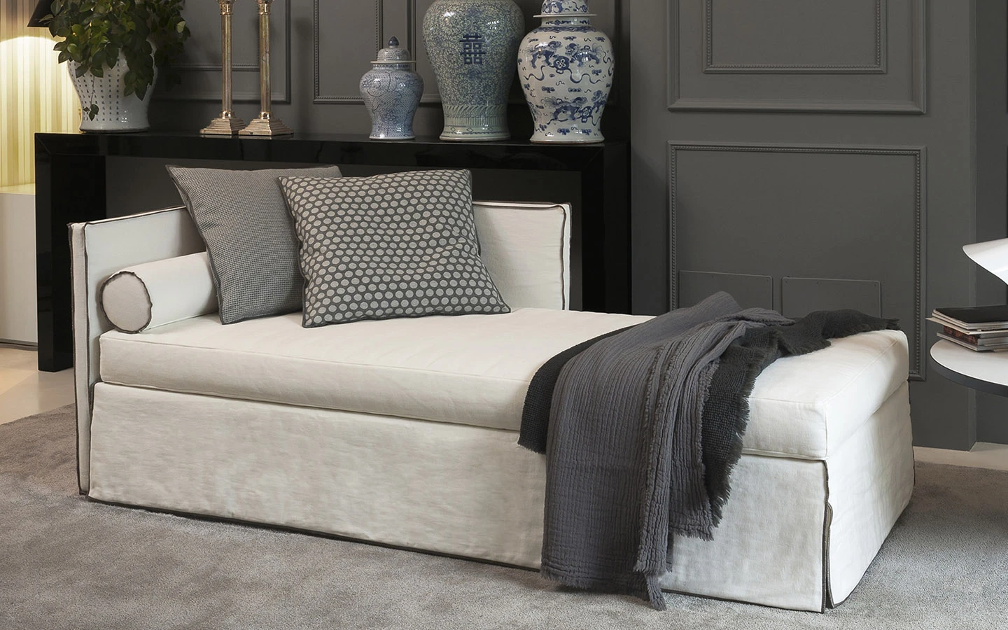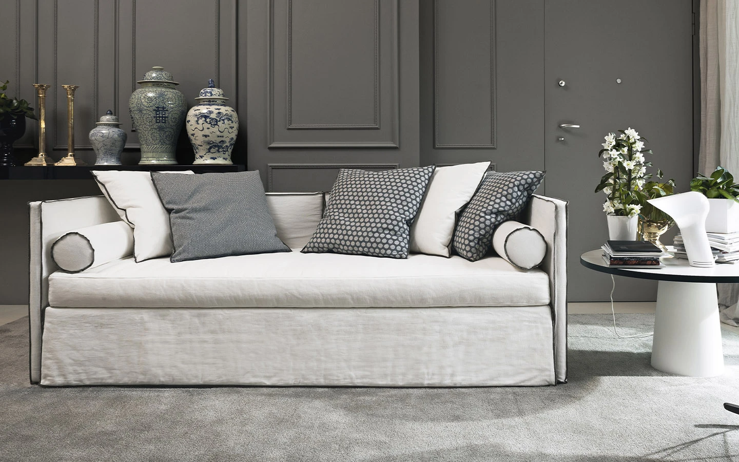 STEP DAY BED от Flexteam е практичен и стилен разтегателен диван, проектиран както за функционалност, така и за комфорт. Разтегателният диван включва допълнителни аксесоари като възглавници рола и три възглавници за допълнителен комфорт.