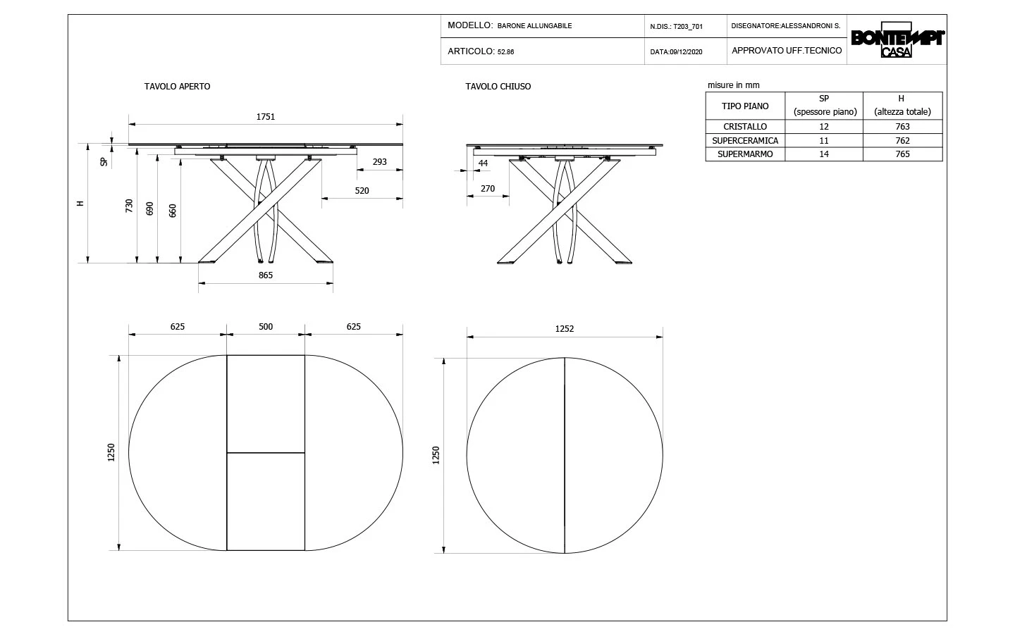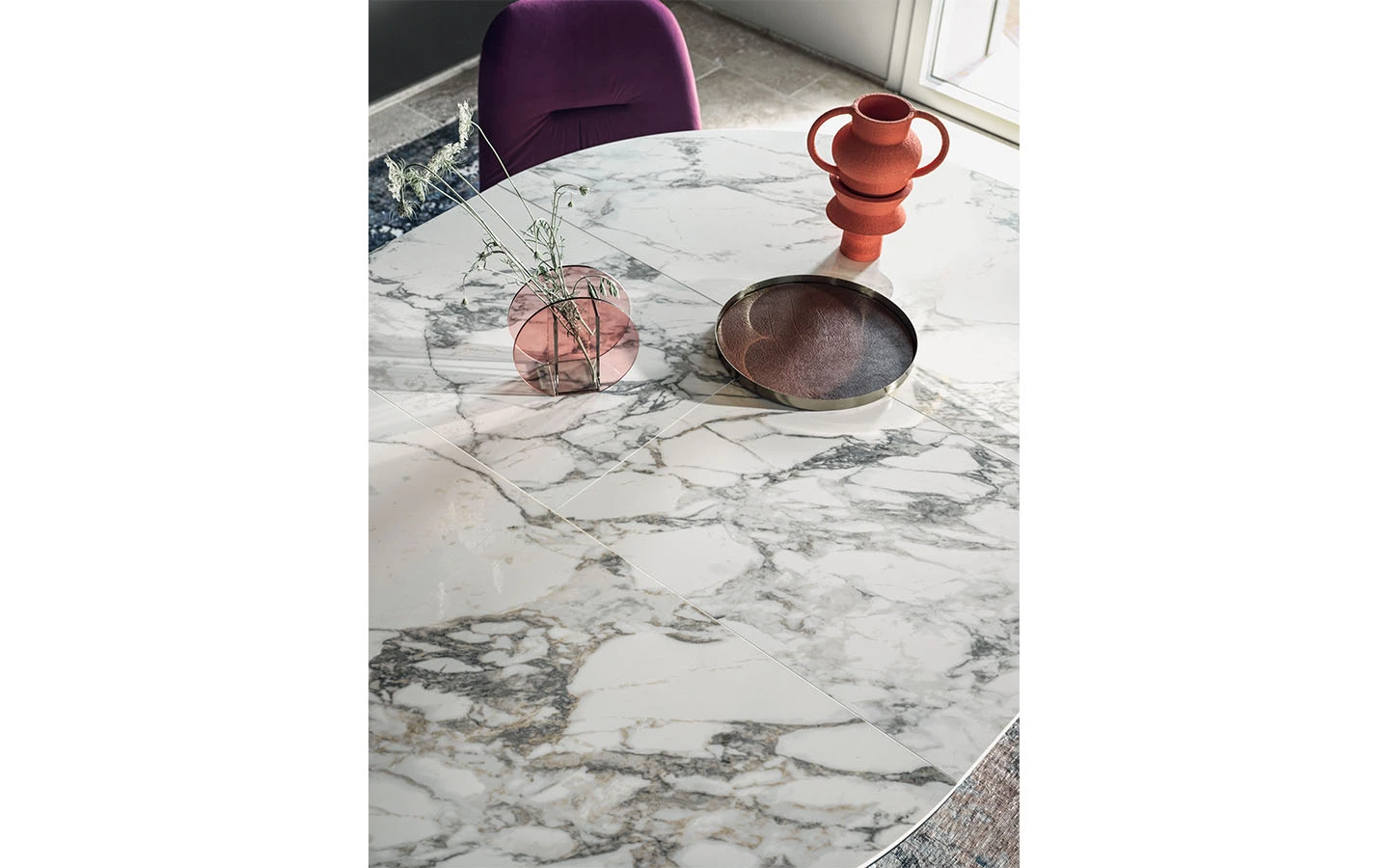 Посочената цена е за разтегателна маса с размери см. Ø 125/76H.-175/125/76H., в начална категория материал и финиш на плота и финиш на основата.