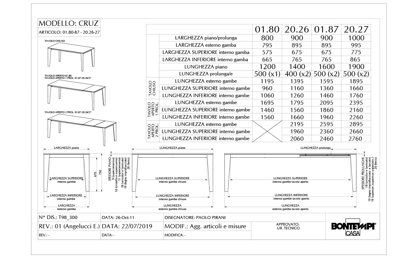 CRUZ е италианска разтегателна маса от колекцията на италианския производител Bontempi Casa. Плотът на масата може да бъде изработен от фурнировано дърво, меламин, Unicolor с покритие против надраскване, лъскаво стъкло, матово стъкло с покритие против надраскване или керамика – материал и финиш по избор. Удълженията могат да бъдат изработени от фурнировано дърво, меламин, Unicolor с покритие против надраскване, дърво или керамика – материал и финиш по избор на клиента. Основата е изработена от метал – финиш по избор на клиента. Цената на масата се формира на база избора на размер, материал и финиш на плота и финиш на основата.