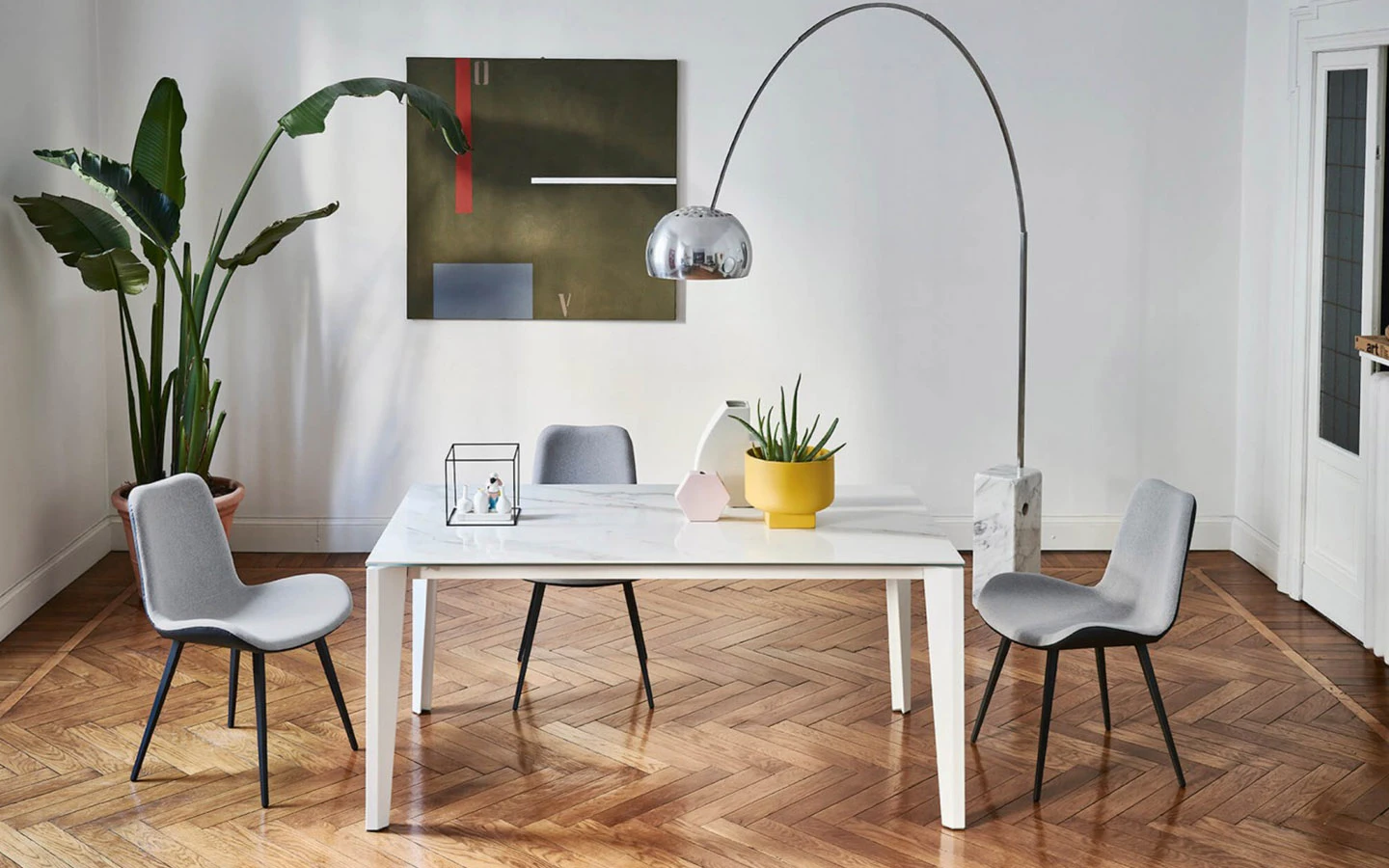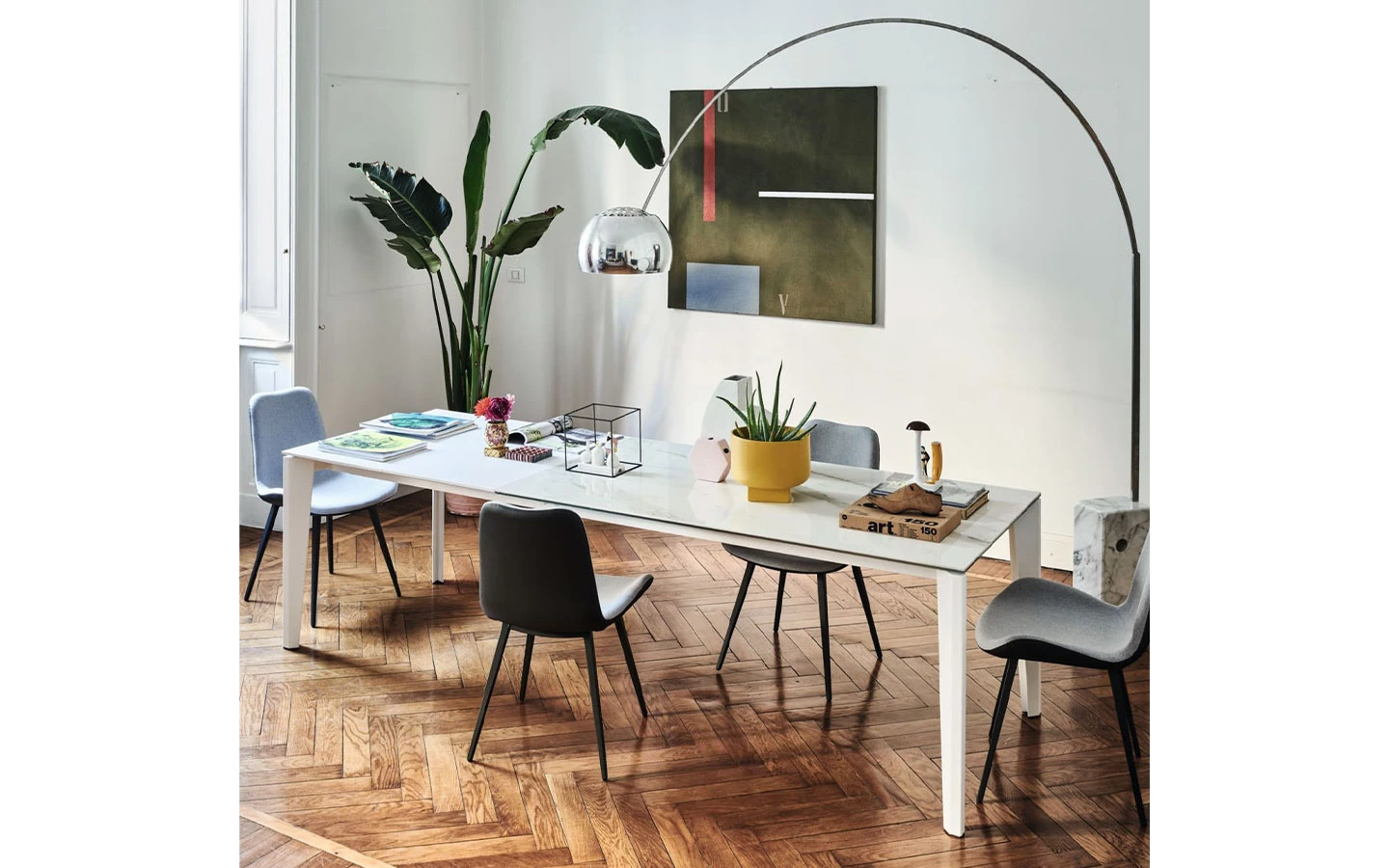Разтегателната трапезна маса DIAMANTE от MIDJ е създадена от Studio Kappa и комбинира минималистичен и елегантен дизайн с практичен разтегателен механизъм, при който едната страна се издърпва, за да освободи място за удължения. Масата се предлага в няколко размера с възможност за разтягане до 3 метра. Тя е подходяща за съвременни домове, осигурявайки стил и функционалност.