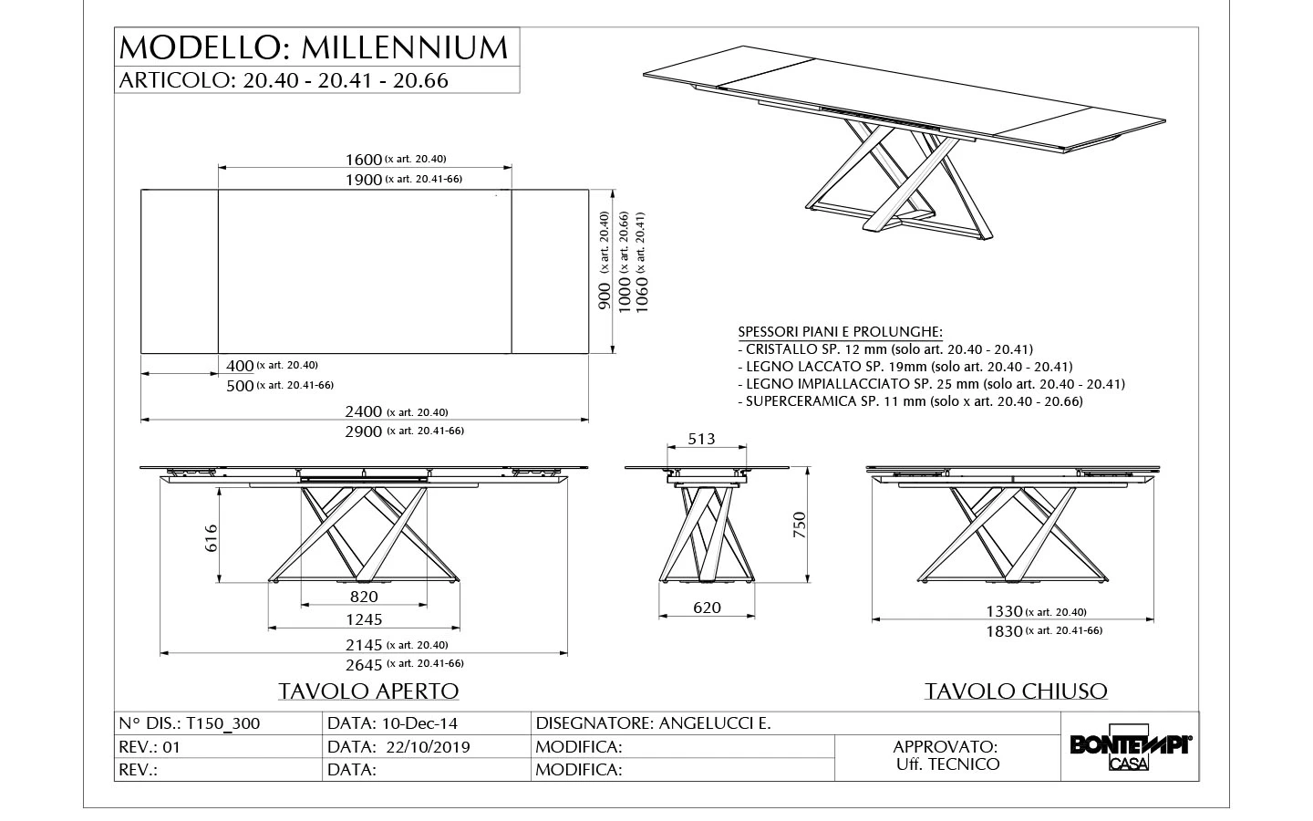 MILLENNIUM е италианска разтегателна маса от колекцията на италианския производител Bontempi Casa. Плотът и удълженията на масата могат да бъдат изработени от фурнировано дърво, лъскаво стъкло, арт стъкло, матово стъкло с покритие против надраскване или керамика – материал и финиш по избор. Основата е изработена от метал – финиш по избор на клиента. Цената на масата се формира на база избора на размер, материал и финиш на плота и финиш на основата.