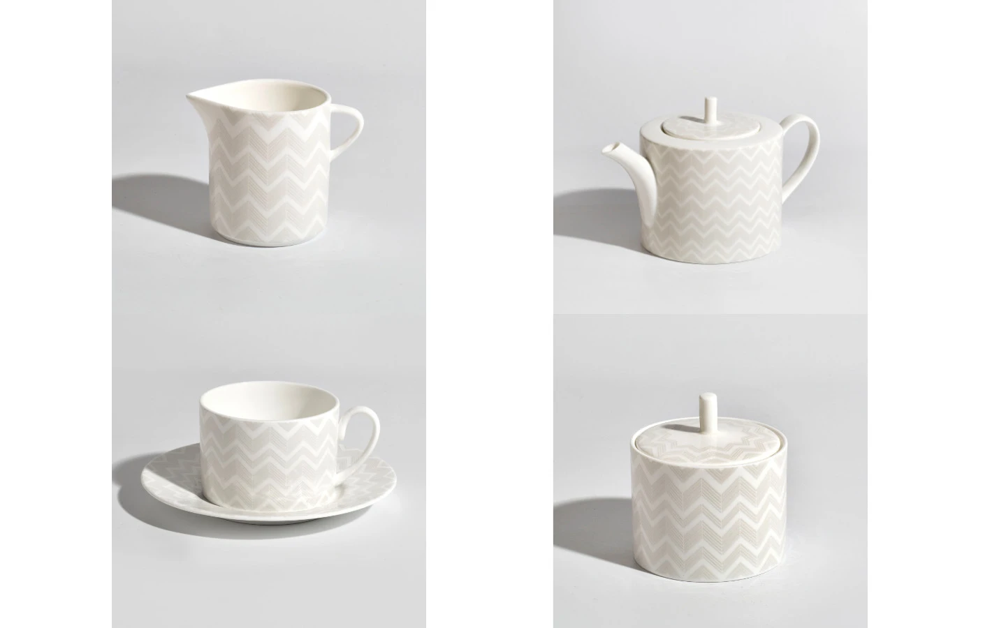 Сервиз за чай, Сет от 9 части от колекцията Zig Zag White на Missoni Home. Тази колекция е изработена от фин костен порцелан и се отличава с изчистен и елегантен дизайн.