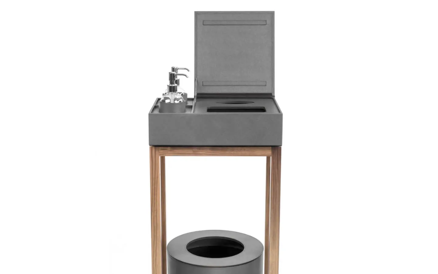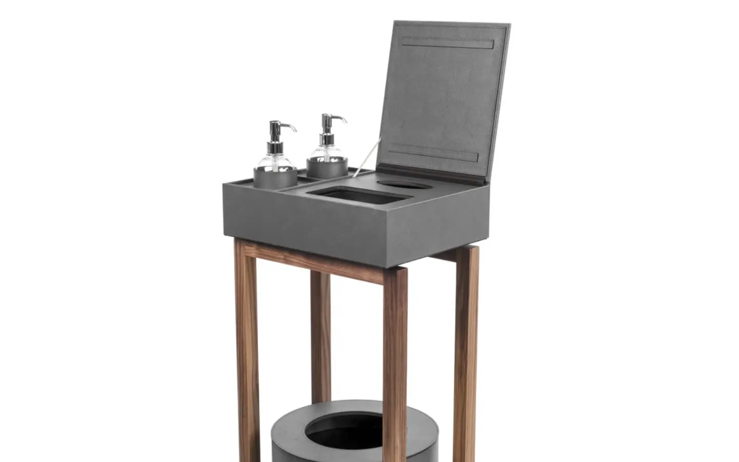 IGEA SANITIZING STAND WITH BOX на Pinetti е елегантна и практична стойка, която комбинира дезинфектант и стилно отделение за салфетки или мокри кърпички в една изчистена форма. Конструкцията е изработена от масивен орех, който придава естествена топлина и луксозно усещане, а кожените елементи добавят финес и характерната за марката изтънченост. Стойката е висока 115 см и с размери 40×29 см, което я прави впечатляваща, но и достатъчно компактна за рецепции, входни пространства, магазини, офиси и хотелски зони. Дозаторът осигурява удобство и хигиена при употреба, а вградената кутия поддържа всички необходими консумативи дискретно подредени. Всеки детайл е изработен ръчно, което гарантира качество и прецизност. Това е завършено, функционално и премиум решение за места, в които чистотата трябва да бъде поднесена със стил.
