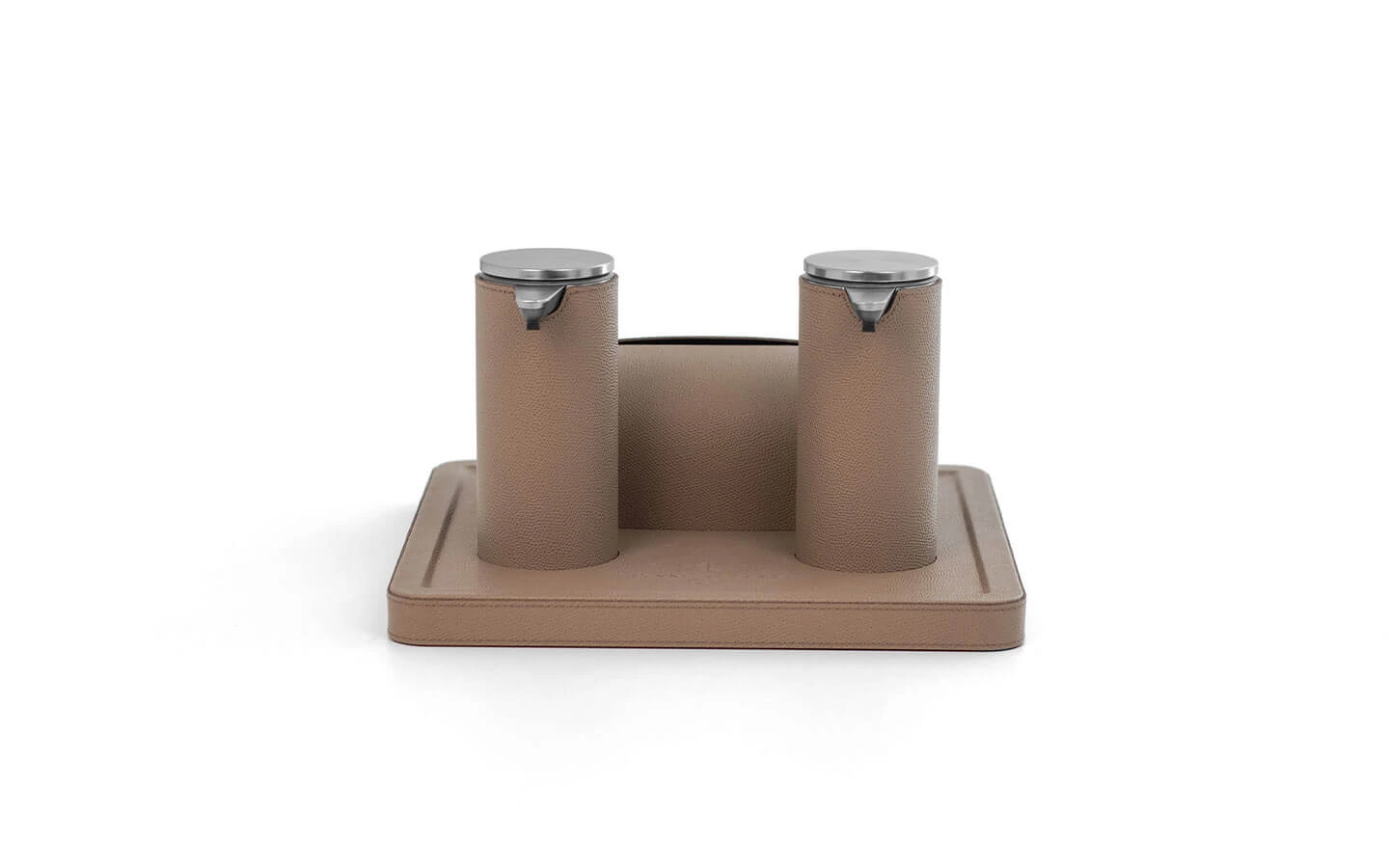 IGEA SANITIZING TRAY на Pinetti е изискан елемент, предназначен за пространство, където хигиената се среща с високата естетика. Представлява компактен поднос, изработен от кожа, която придава усещане за лукс. Устройството е оборудвано с презареждащи се сензорни дозатори за гел или сапун, които позволяват дозиране без контакт. Подносът е идеален за рецепции, магазини, шоуруми, хотели и яхти – места, където детайлът прави впечатление и където стилът не бива да се жертва за сметка на практичността. Изработва се ръчно, което е гаранция за внимание към материалите и финия завършък.