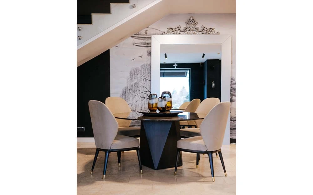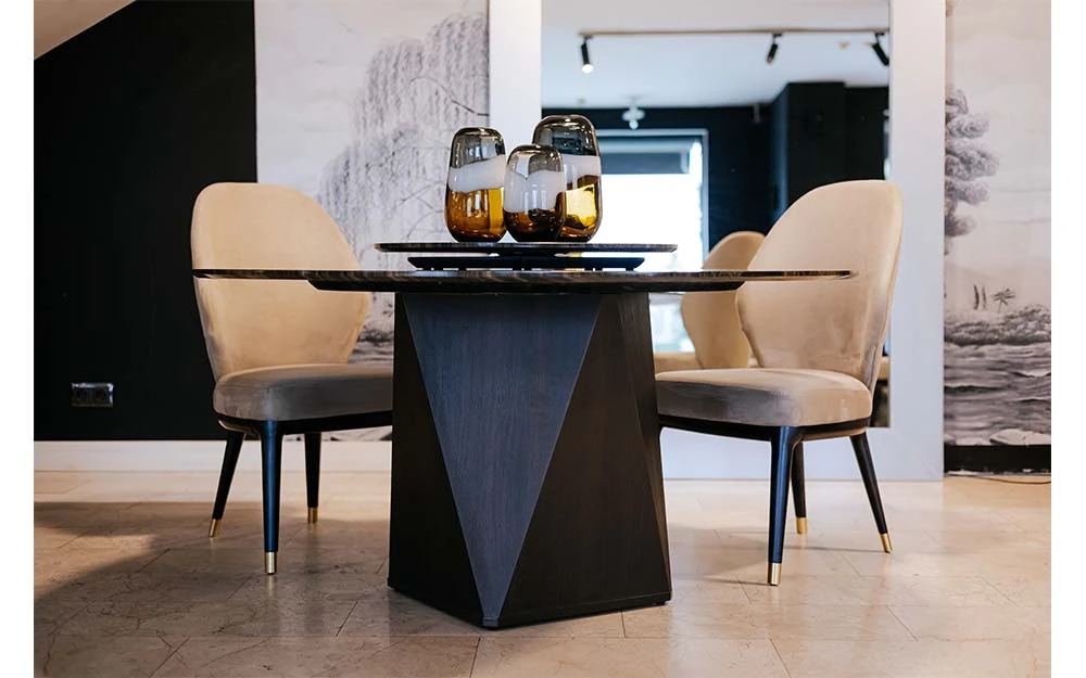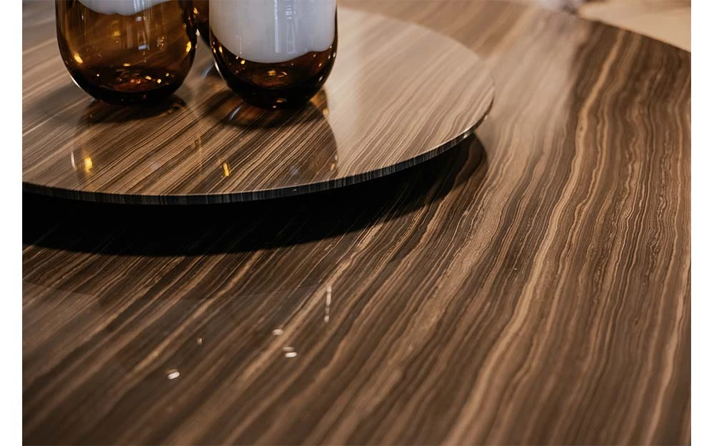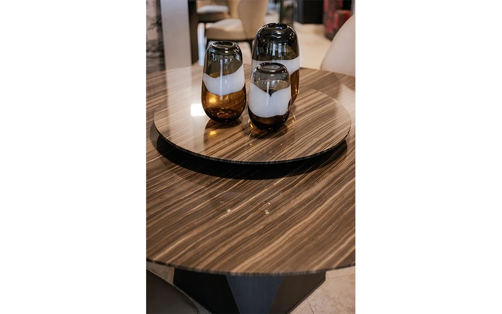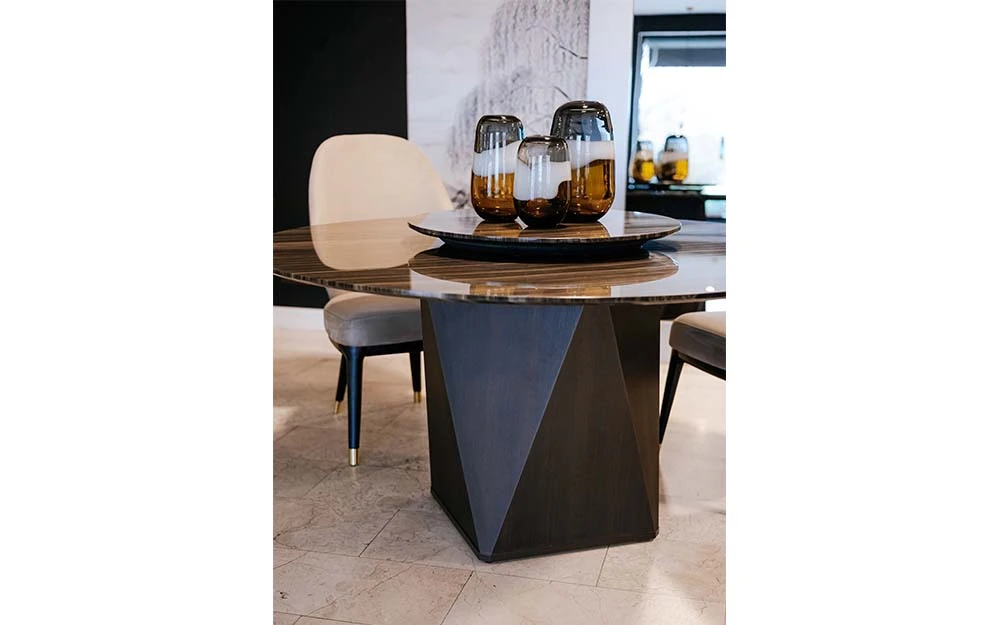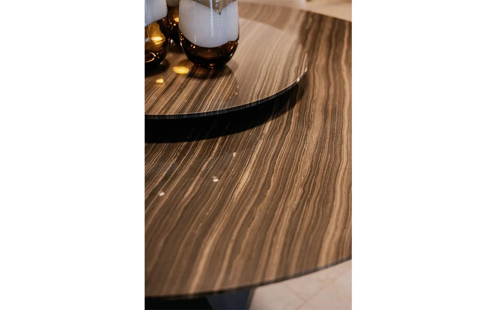 Трапезната маса DIAMOND е част от колекцията на италианския производител STONE INTERNATIONAL. Трапезната маса DIAMOND се отличава с впечатляващ модерен дизайн на основата и плота. Основата е със скулптурен дизайн. Кръгъл плот от естествен мрамор Eramosa. Lazy Susan от естествен мрамор Eramosa. Основа, покрита с естествен фурнир във финиш Wenge Amazon.