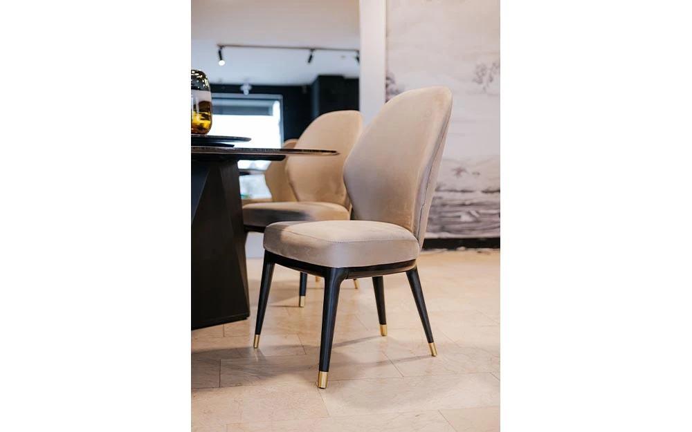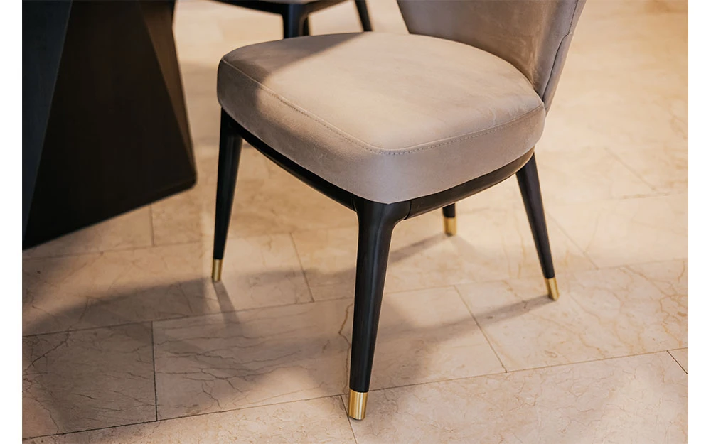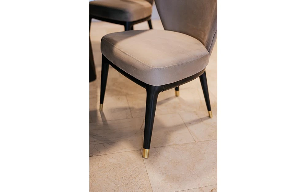 Трапезарният стол MAYA е част от колекцията на италианския производител STONE INTERNATIONAL. Много удобен стол с обгръщащ гръб за максимален комфорт. Тапициран е в еко набук в бежов цвят. Дървени крака от масив във финиш Sapphire Oak. Метални стъпчици на краката във финиш месинг.