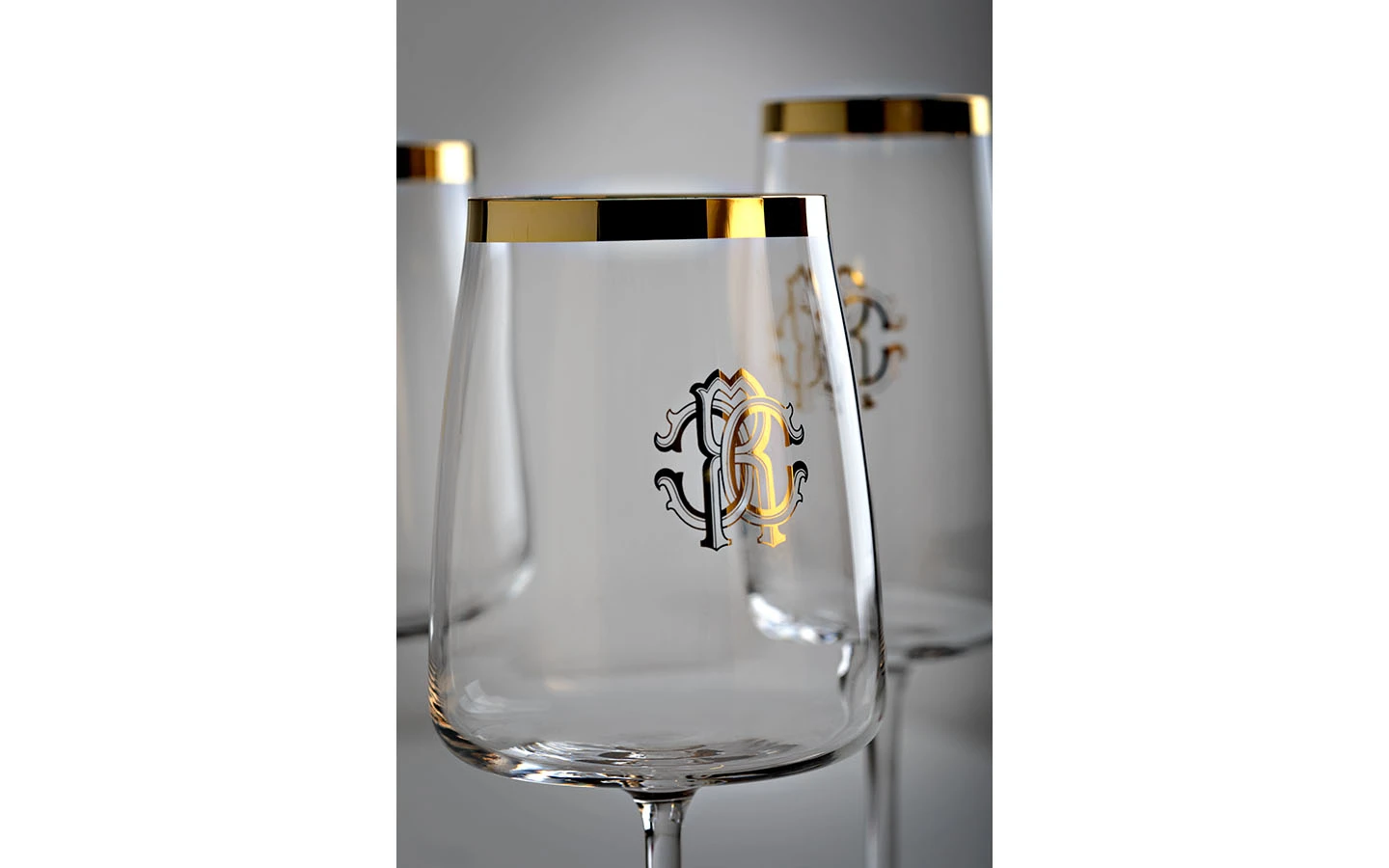 Сет от 2 чаши за уиски от колекцията New Monogram Gold на Roberto Cavalli Home Luxury Tableware. Изящно изработени от оловен кристал със златен кант и лого на бранда.
