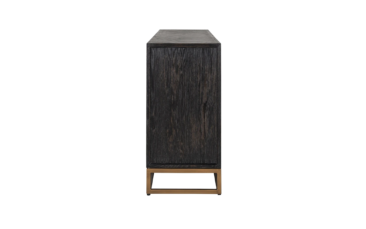 Шкафът BLACKBONE BRASS 4-DOORS на производителя Richmond Interiors е елегантно и функционално допълнение към съвременния интериор. Изработен е от висококачествен дъбов фурнир в черен цвят с рибена кост (herringbone) шарка, комбиниран с метална основа и дръжки в цвят четкано злато, което придава стилна и модерна визия. Шкафът разполага с четири врати, зад които се крият просторни отделения с рафтове, идеални за съхранение на посуда, текстил или други вещи. Централната част включва три открити рафта, подходящи за декоративни елементи или електроника.