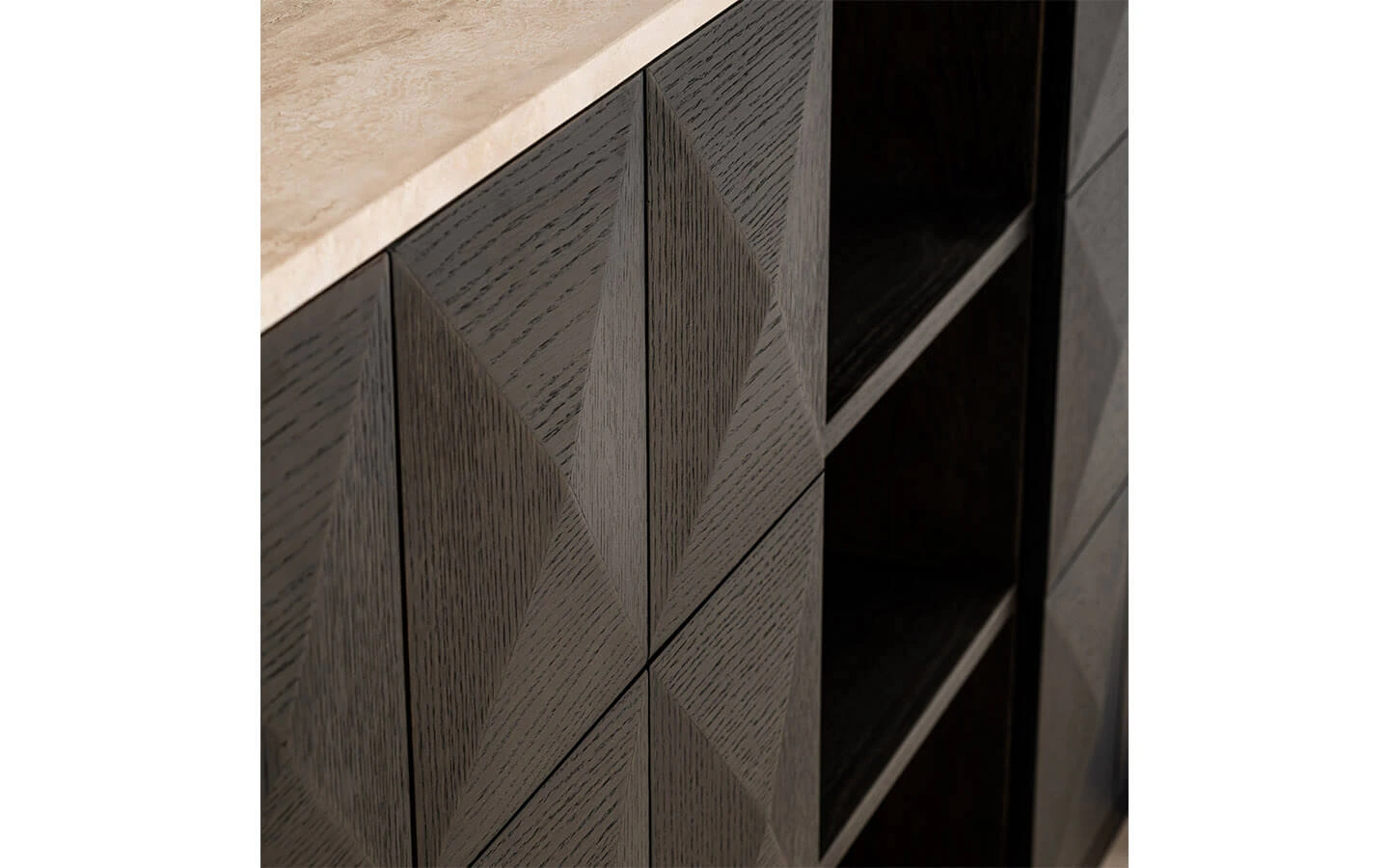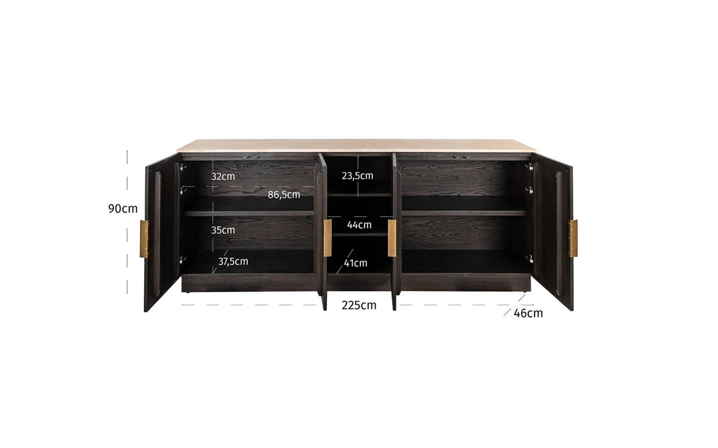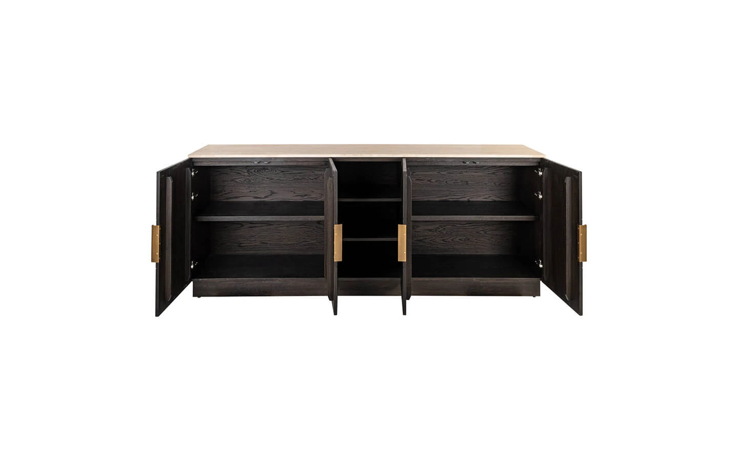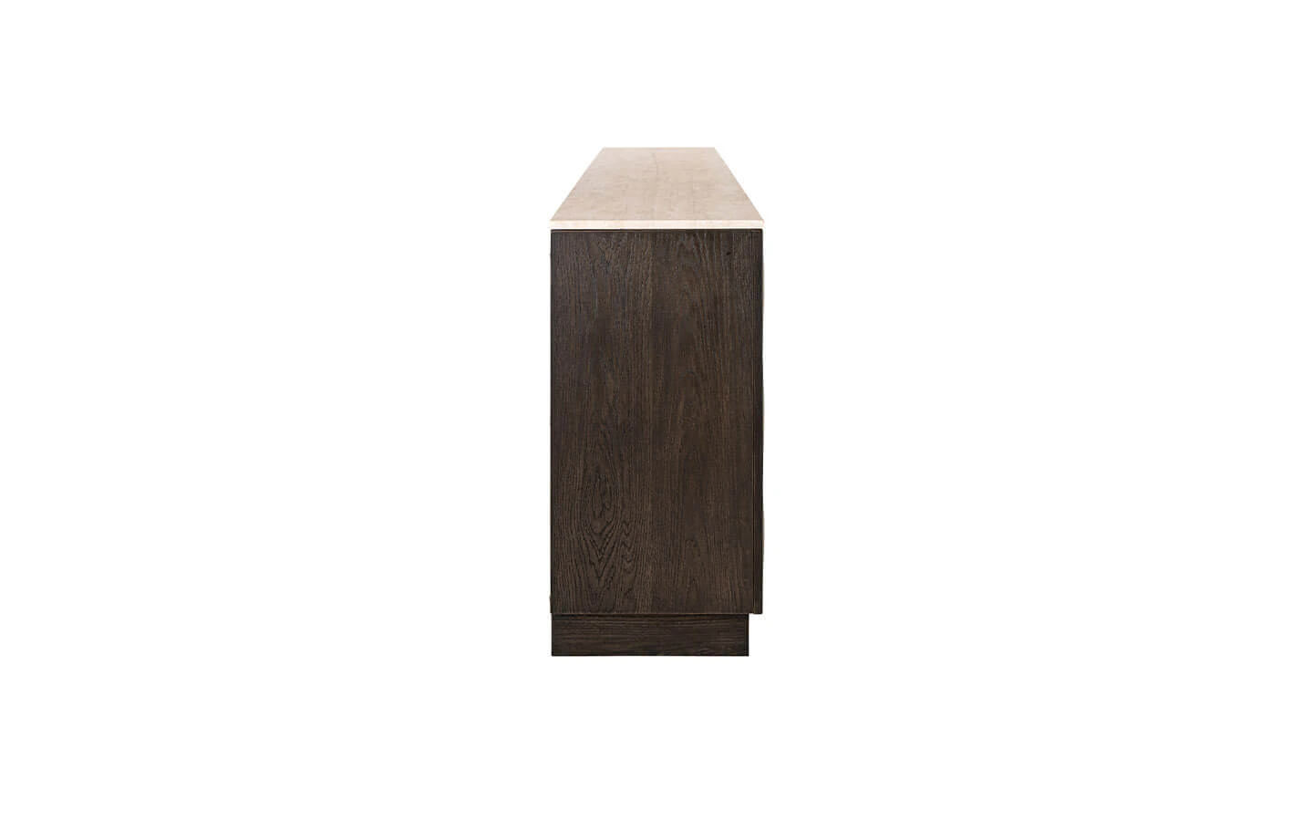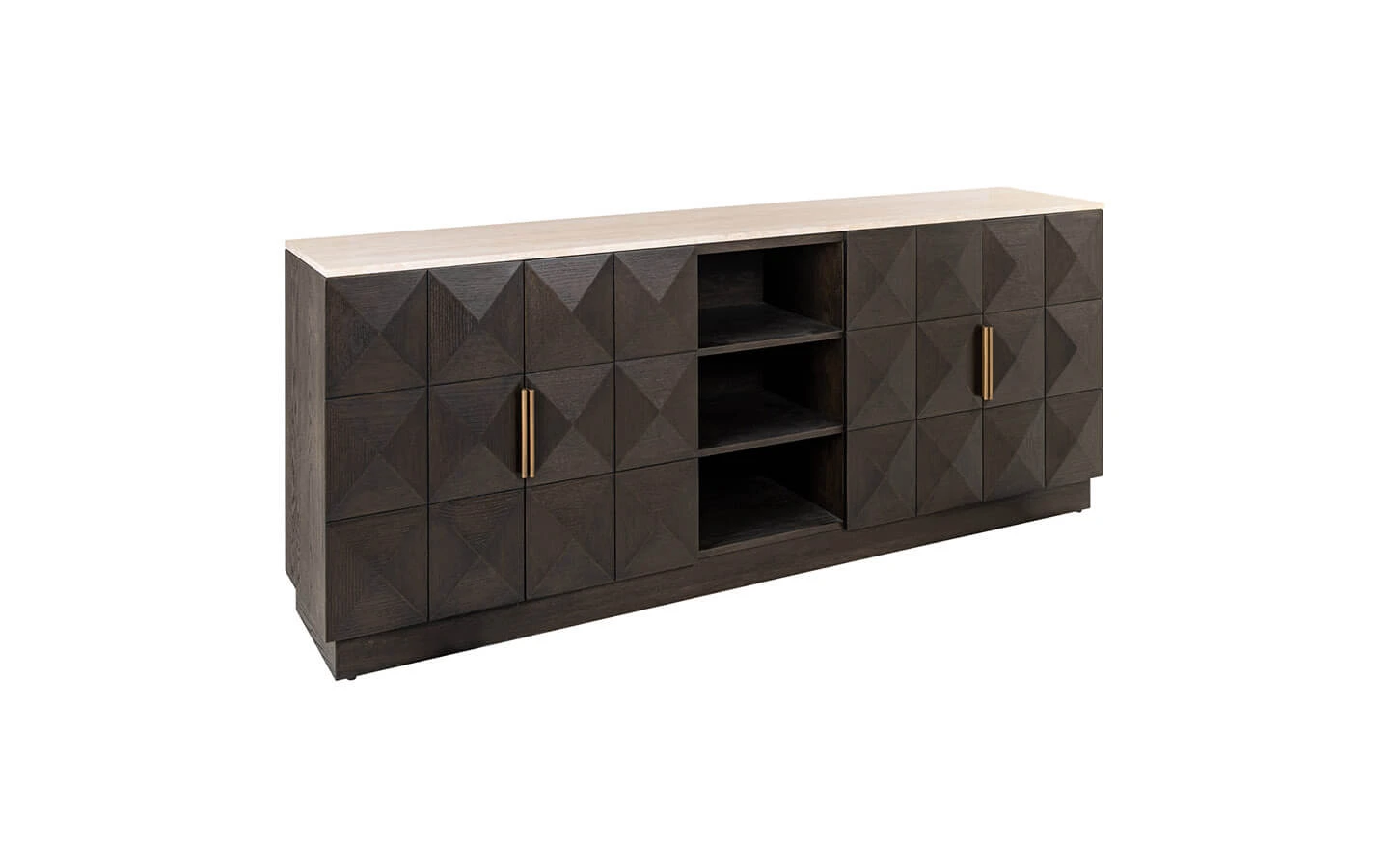CLAREMONT BROWN 4-DOORS 2-SHELVES е шкаф от колекцията на нидерландския бранд Richmond Interiors. Структурата и вратите са изработени от фурнировано дърво – финиш Brown. Плотът е изработен от естествен травертин.