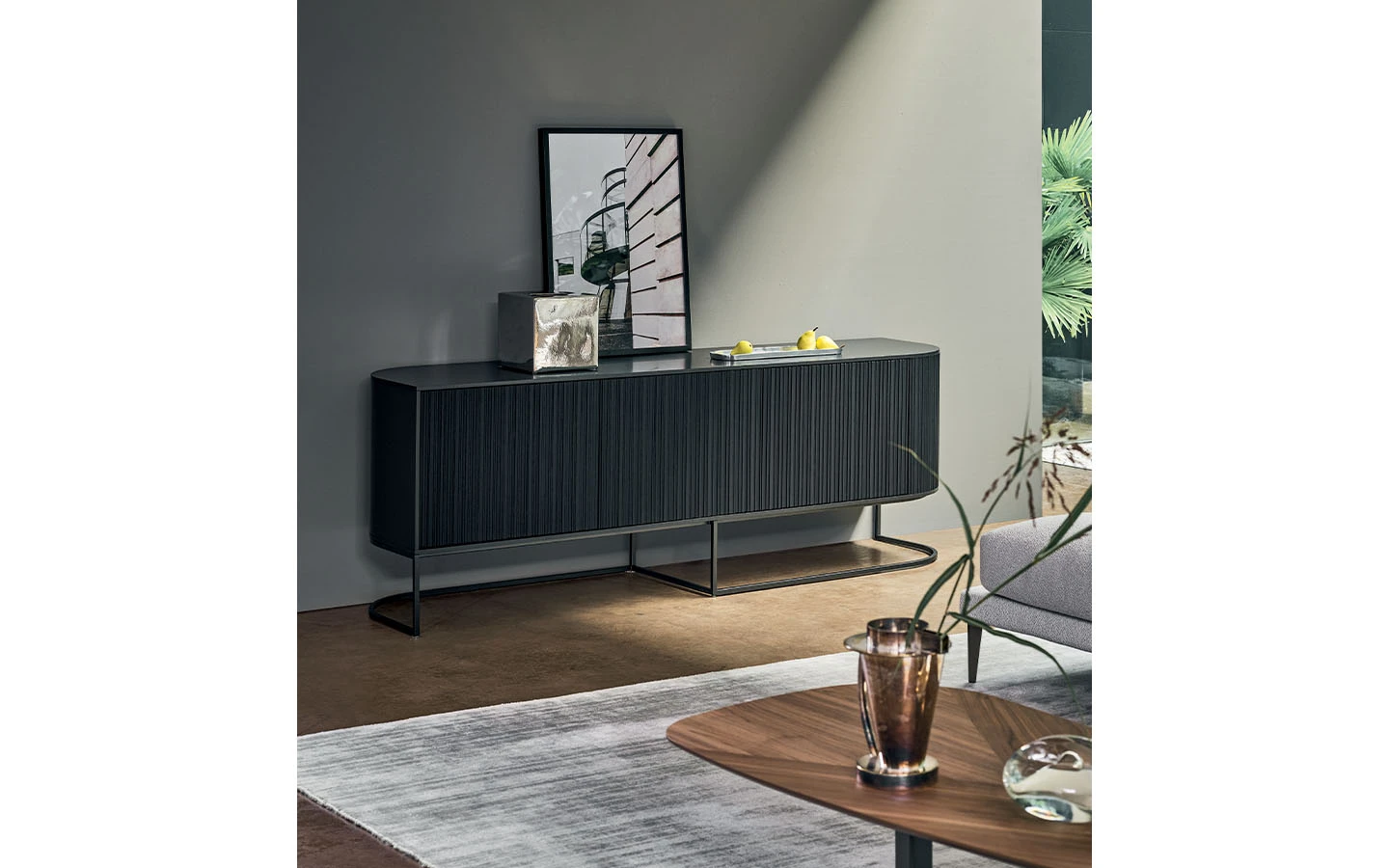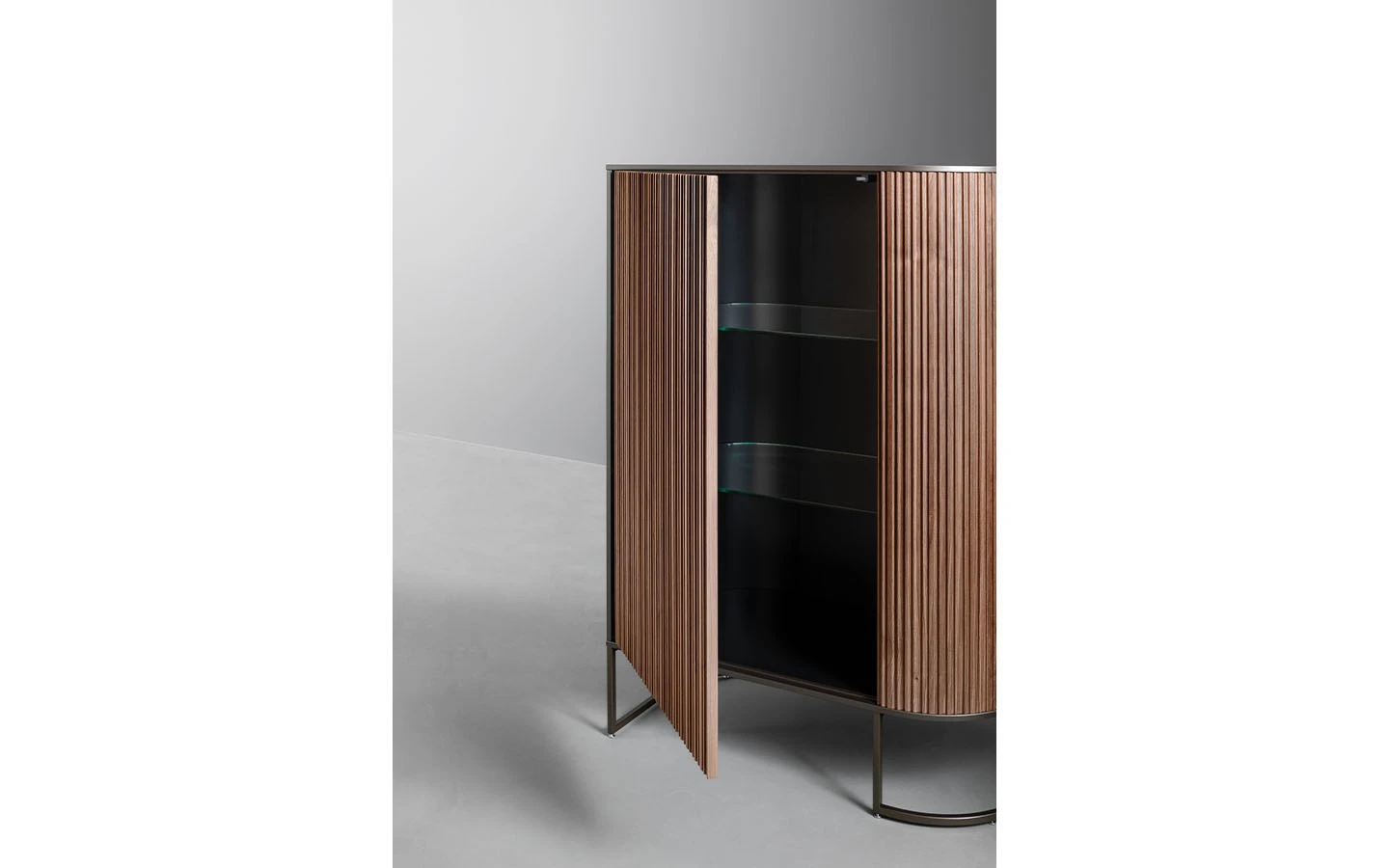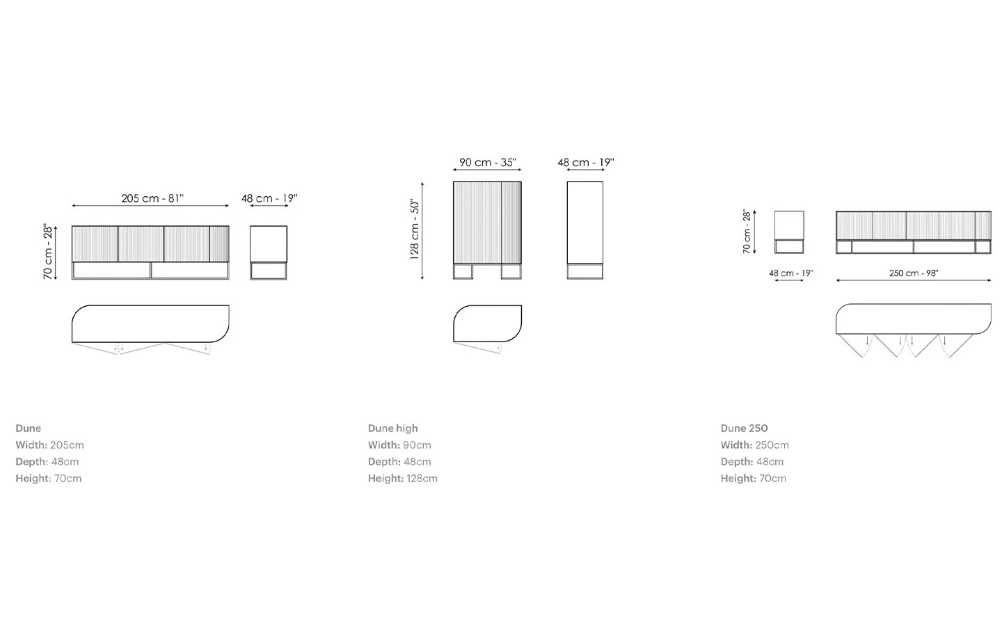 DUNE е дизайнерски дървен шкаф със строг стил, който също така е изключително елегантен и прецизно проектиран до последния детайл. Това е елемент, който се вписва перфектно както в частен дом, така и в офис. Дървените предни врати са с вълнообразна повърхност, която създава редуване на светлина и сянка, докато металната основа има асиметричен дизайн, който подчертава хоризонталната структура на секционния шкаф DUNE.