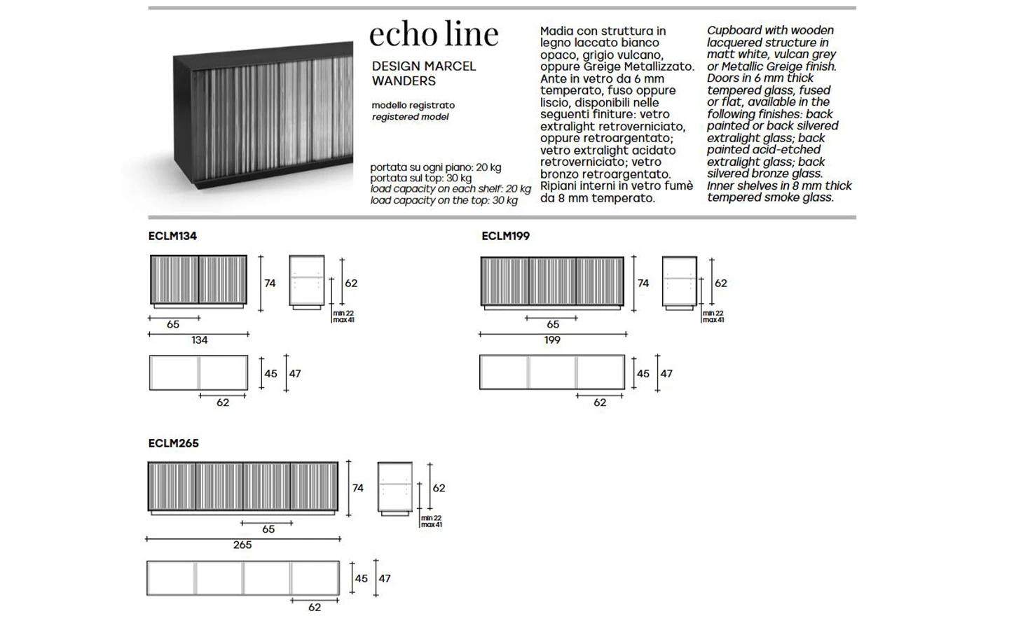 ECHO LINE е италиански шкаф от колекцията на италианския производител FIAM Italia. Структурата е изработена от дърво – финиш по избор. Вратите са изработени от закалено стъкло – гладко или с ръчно изработен дизайн от релефни елементи на райе – финиш по избор. Вътрешните рафтове са изработени от закалено опушено стъкло. Цената на шкафа се формира на база на избора на размер и финиш на вратите.