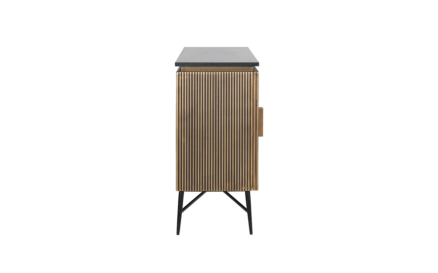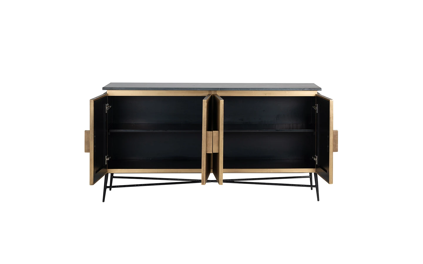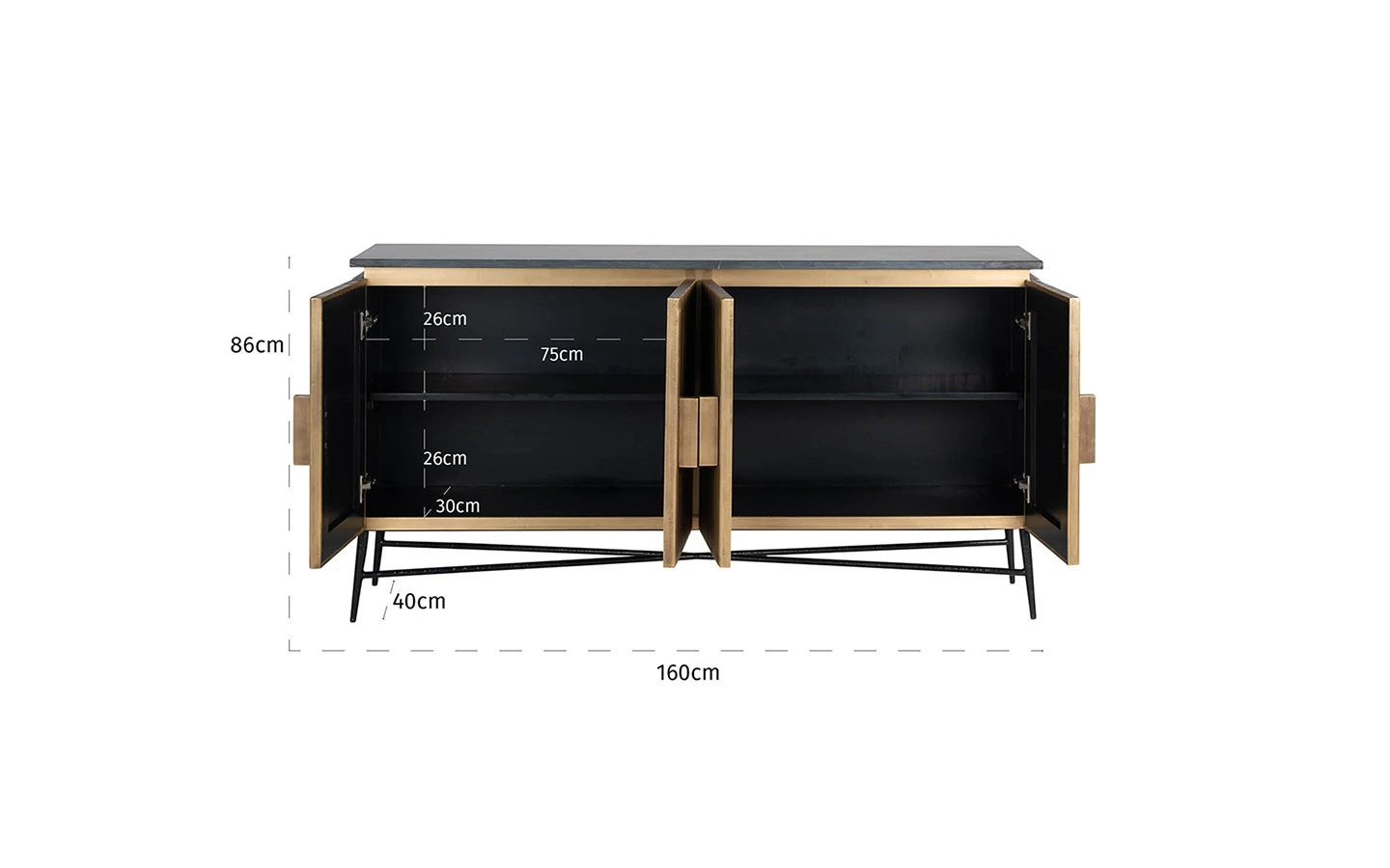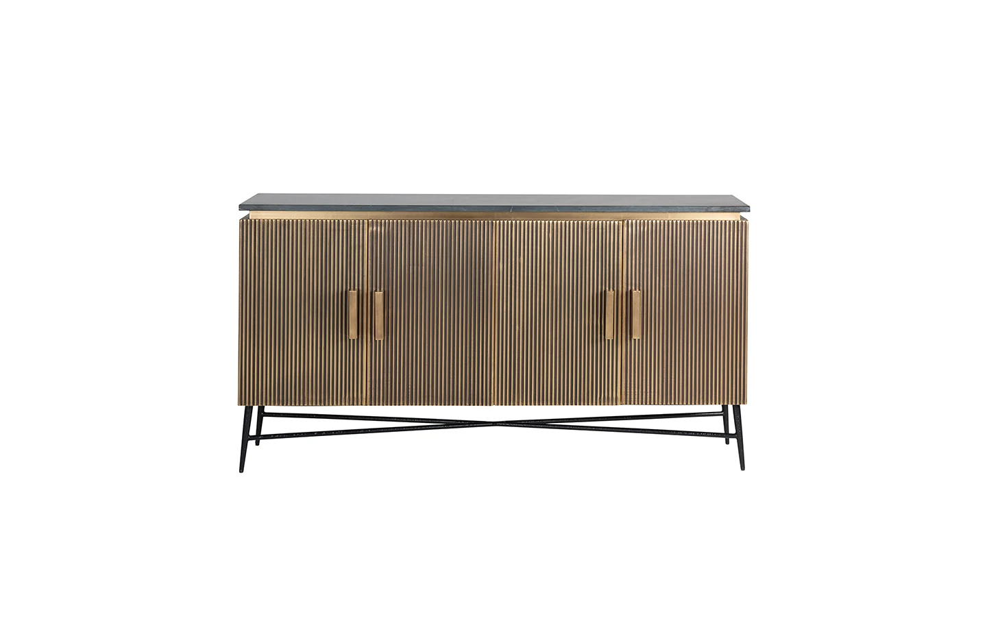 Шкафът IRONVILLE 4-DOORS на производителя Richmond Interiors е изискано и функционално допълнение към съвременния интериор. Съчетавайки модерен стил с луксозни материали, този шкаф придава елегантност и характер на всяко помещение. Шкафът разполага с четири врати, зад които се крият просторни отделения с рафтове, идеални за съхранение на посуда, текстил или други вещи. Релефната златиста повърхност и черният мраморен плот придават луксозен и модерен вид, вдъхновен от стила на 60-те години на миналия век.