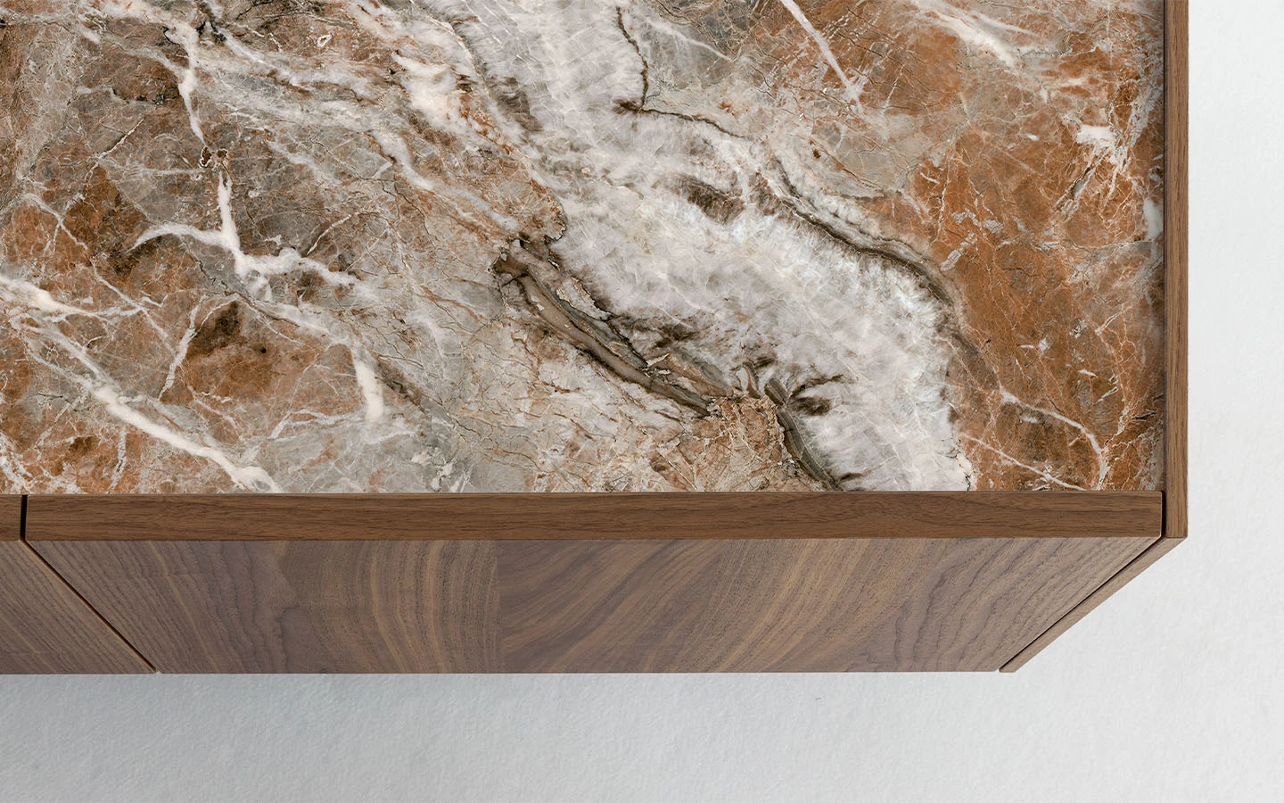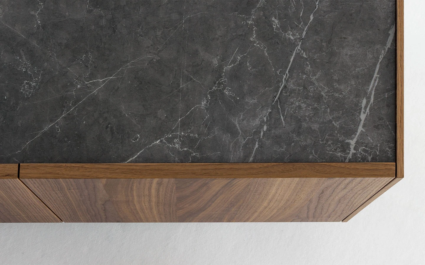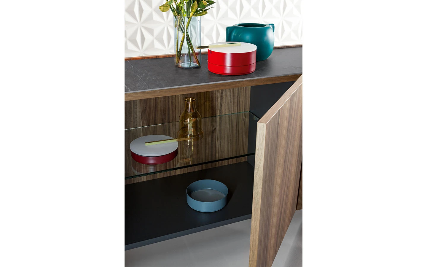 Отличителната характеристика на шкафа OUTLINE за дневна е дървото, по-конкретно топлият финиш на Canaletto орех, използван за целия корпус. Плотът, който е леко потопен, за да подчертае топлината и качеството на дървото, може да бъде изработен от два различни материала: Canaletto орех, като корпуса, или керамика, за да създаде елегантен контраст с дървения корпус. Основата е налична в две версии: с ниски крака, за тези, които предпочитат минималистични силуети, или с метални крака, за тези, които предпочитат мебели с изразителна личност. Наличен във версии с три или четири врати, OUTLINE се отличава с щедри пропорции и изискан, но дискретен дизайн, обогатен от избора на ценни материали.