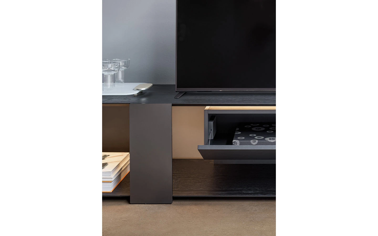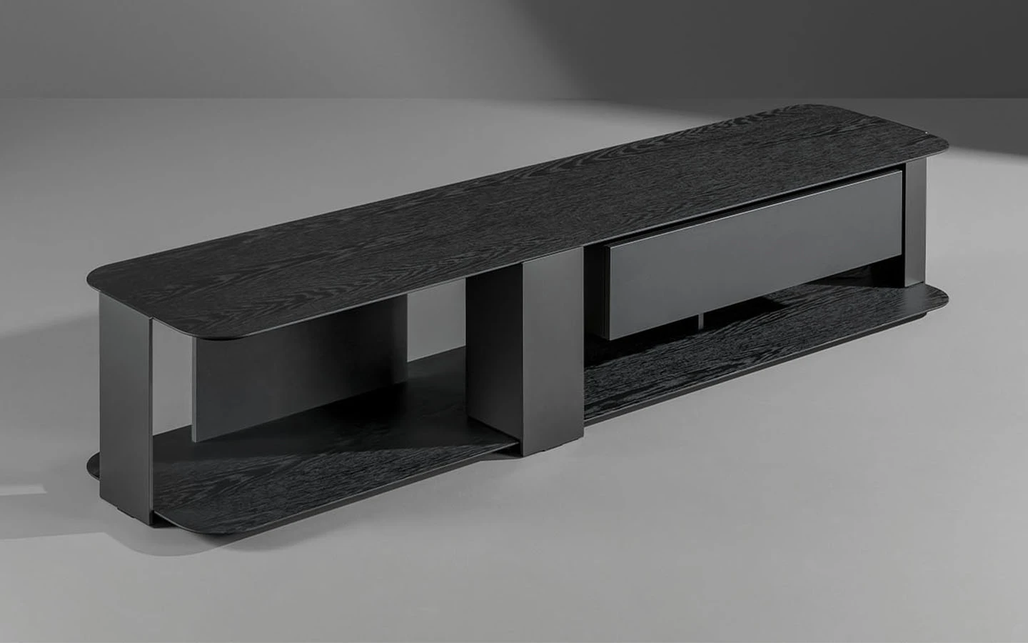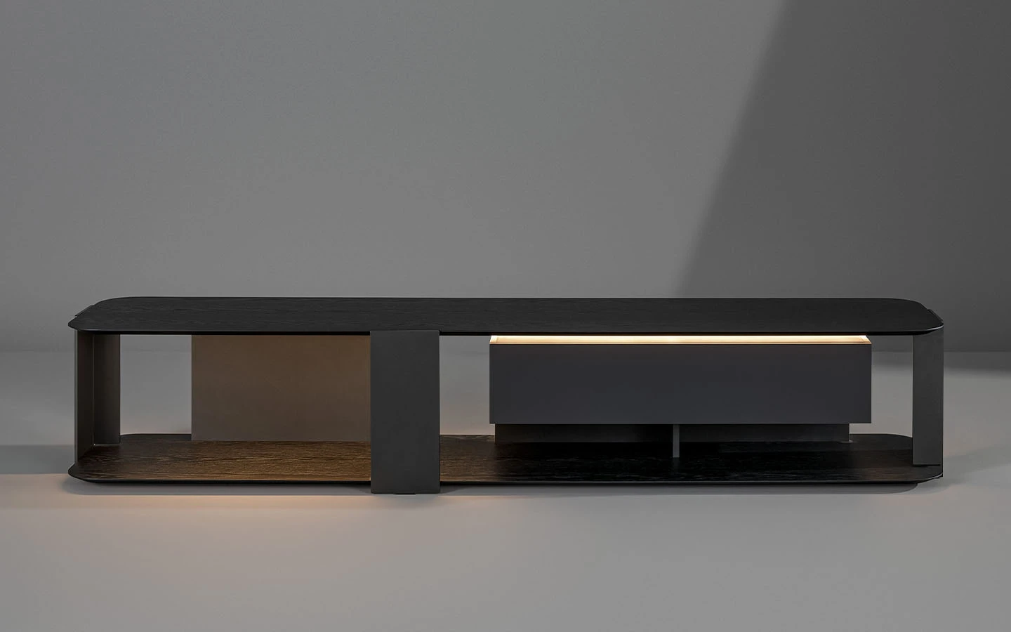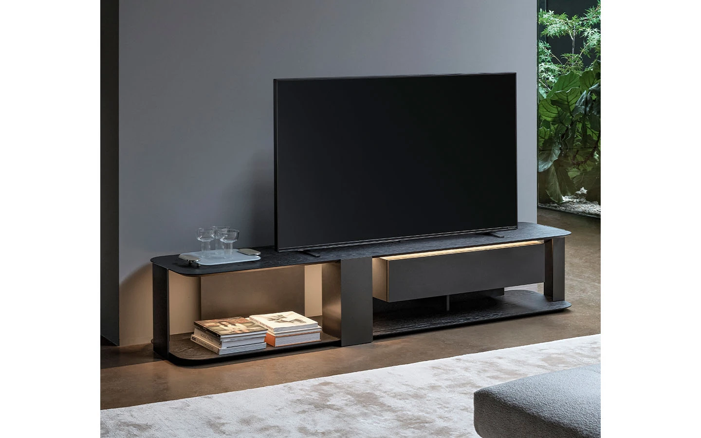 Телевизионният шкаф PADDLE привлича вниманието със своето визуално леко присъствие, зад което се крие значителна структурна здравина. Освен че може да се използва като ниска конзола, тази мебел може също да бъде монтирана на стената, предоставяйки голяма гъвкавост за интерпретация и вмъкване в различни пространства. Има също и версия на телевизионния шкаф PADDLE със светлина, която предлага интегрирана осветителна система (Paddle TV stand light).