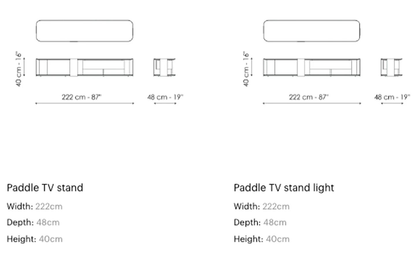 PADDLE TV STAND е италиански телевизионен шкаф от колекцията на италианския производител Bonaldo. Шкафът се предлага в две комбинации. Първата комбинация включва дървен горен и долен плот във финиш Canaletto walnut, чекмедже изработено от дърво – финиш Bronze и метална структура във финиш Bronze. Втората комбинация включва дървен горен и долен плот във финиш Coal oak, чекмедже изработено от дърво – финиш Lead и метална структура във финиш Lead. Цената на шкафът се формира на база на избора на това дали да бъде със скрито осветление по горния плот или без.