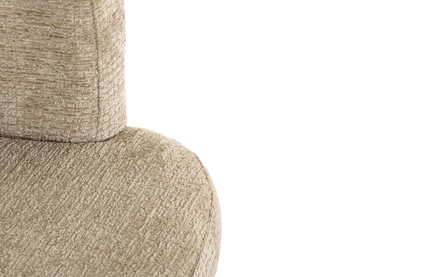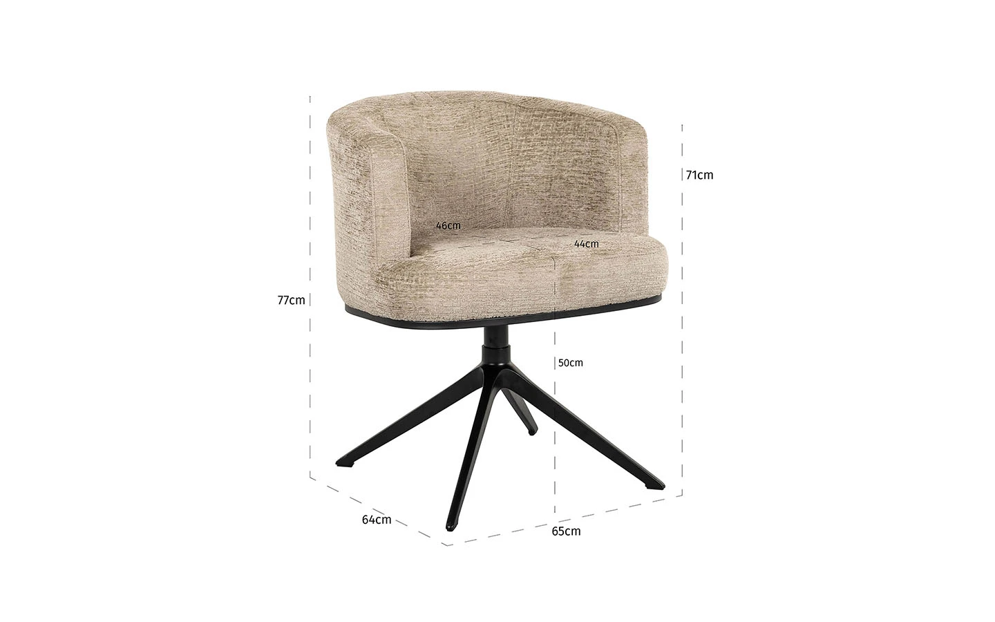 Въртящият се стол CHEYENNE DESERT FUSION от Richmond Interiors е стилен и удобен стол, който съчетава модерен дизайн с практичност. Тапициран е с плат Fusion 109 Desert – мек и издръжлив 100% полиестер в топъл пустинен нюанс, който лесно се вписва в различни интериорни стилове. Извитата облегалка плавно преминава в дискретни подлакътници, осигурявайки комфорт и естетика. Здравата метална основа е оборудвана с 360-градусов въртящ се механизъм, предоставящ гъвкавост при използване.