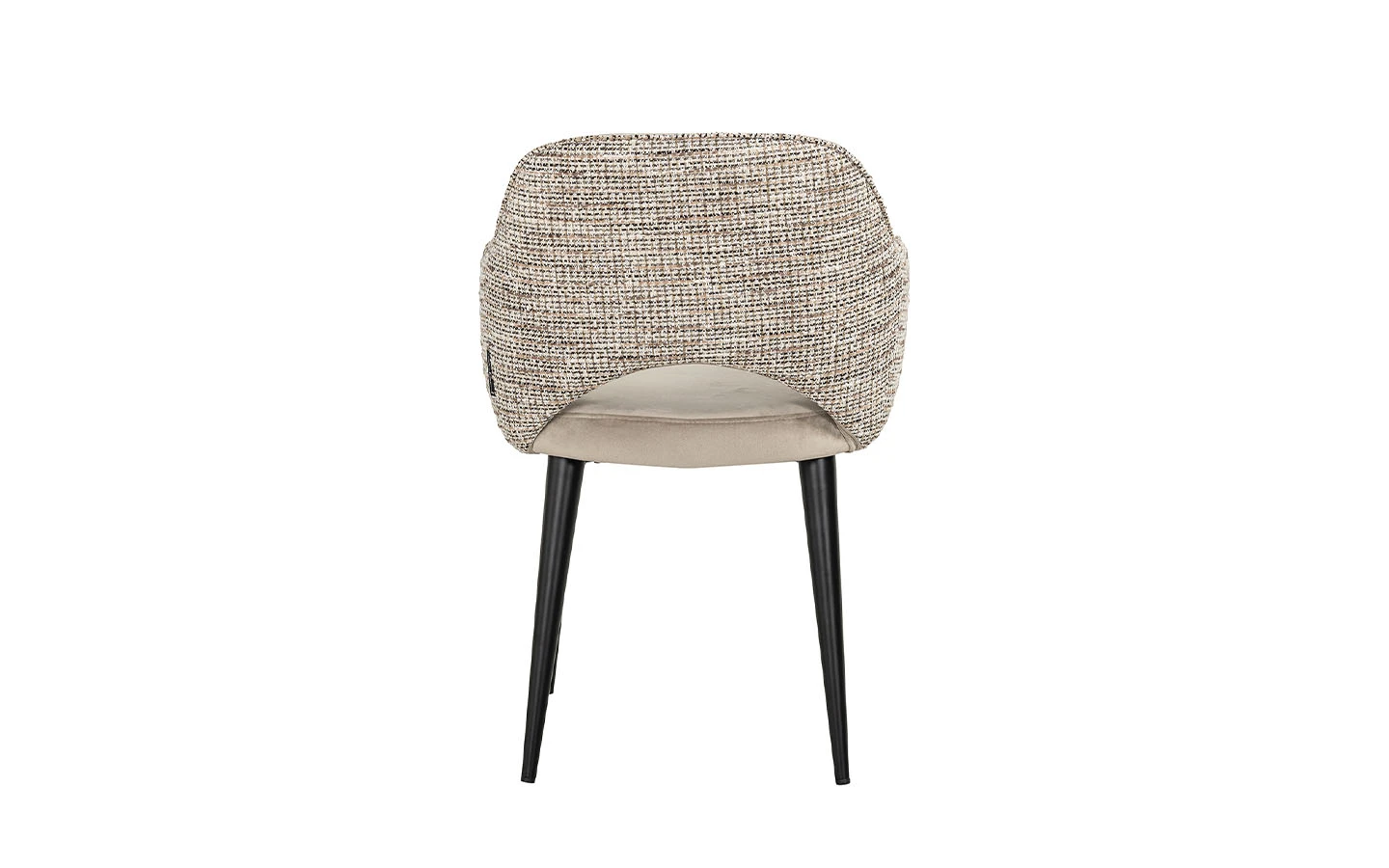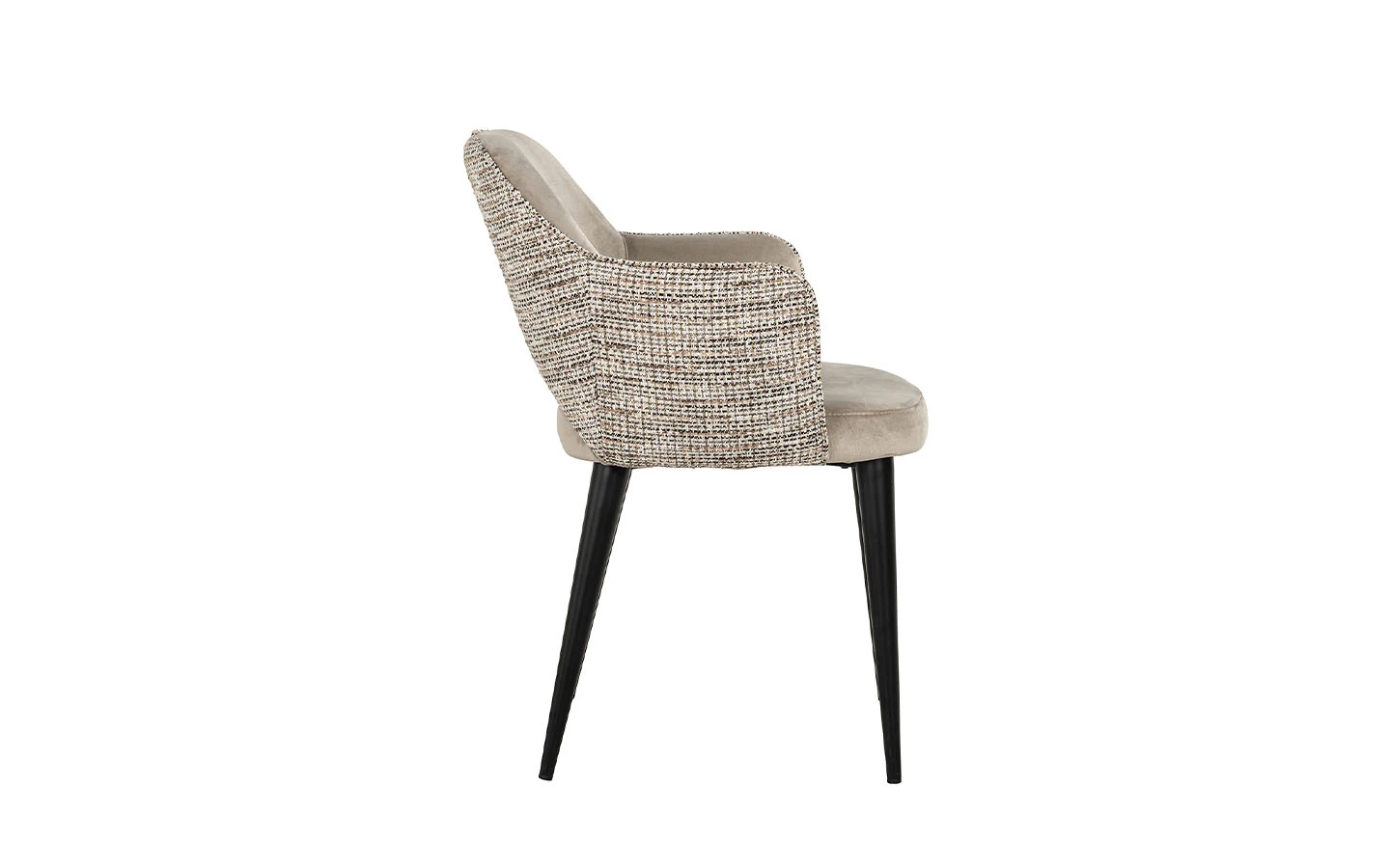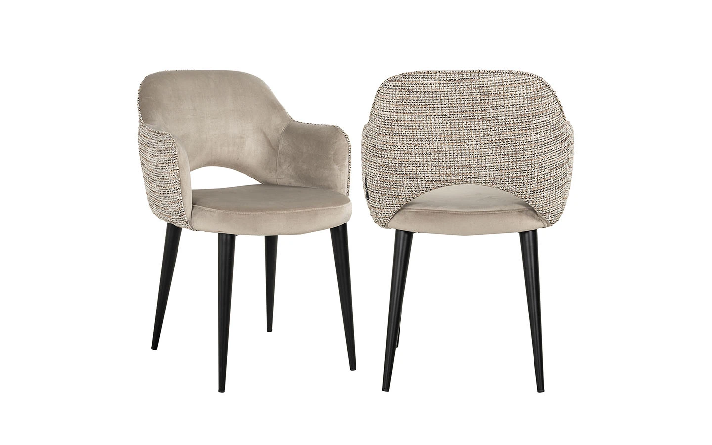 Столът GIOVANNA TRENDY NATURE от Richmond Interiors съчетава съвременна елегантност и комфорт. Характеризира се с удобна седалка и подлакътници за допълнителна релаксация. Вътрешната част е тапицирана с мек плат в цвят Quartz Khaki, а външната – с топъл тон Trendy Nature, което създава изискан контраст. Елегантните черни крака придават модерен акцент и осигуряват стабилност.