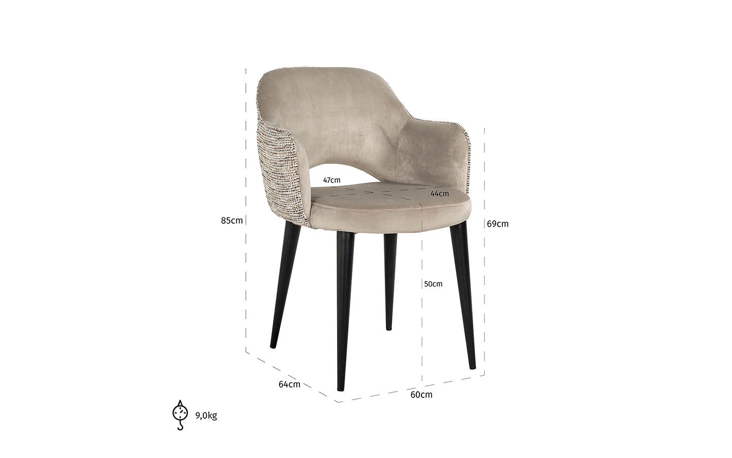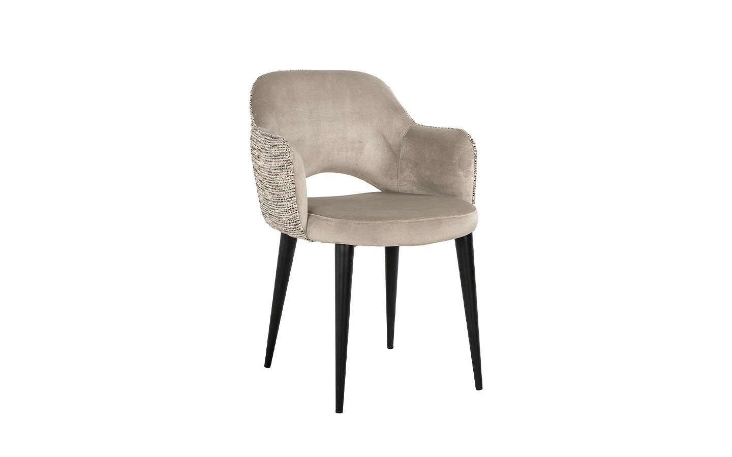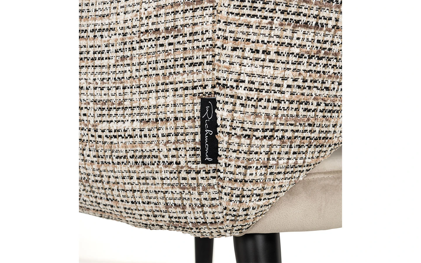 Столът GIOVANNA TRENDY NATURE от Richmond Interiors съчетава съвременна елегантност и комфорт. Характеризира се с удобна седалка и подлакътници за допълнителна релаксация. Вътрешната част е тапицирана с мек плат в цвят Quartz Khaki, а външната – с топъл тон Trendy Nature, което създава изискан контраст. Елегантните черни крака придават модерен акцент и осигуряват стабилност.
