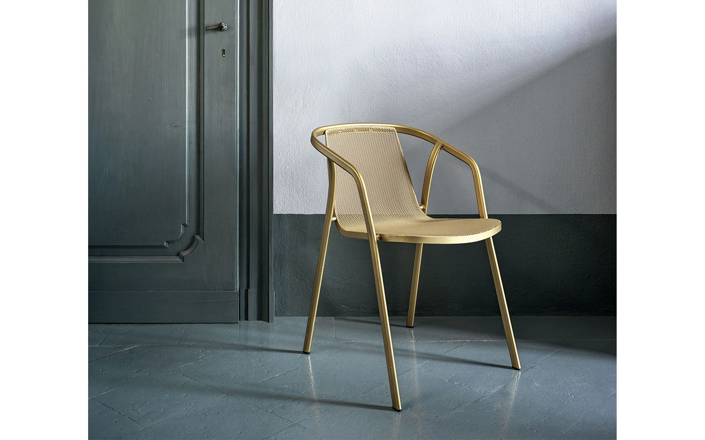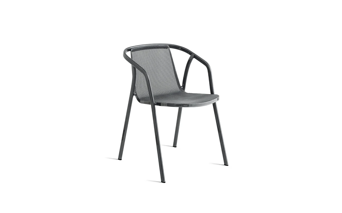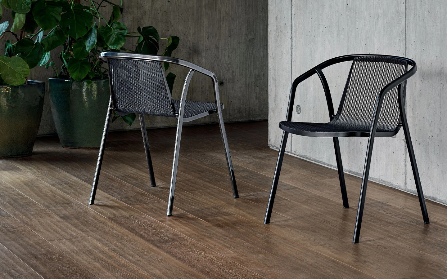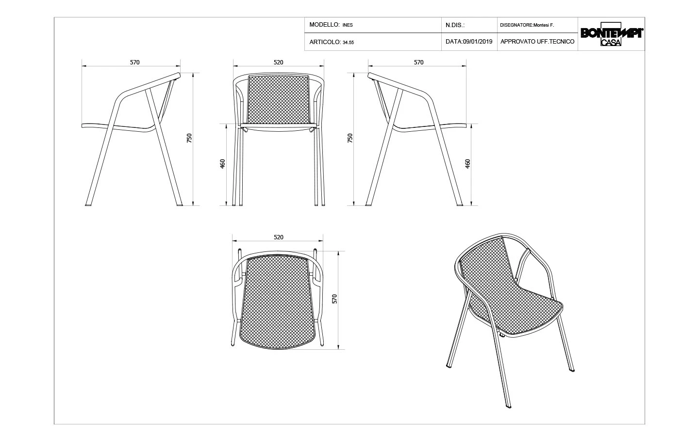 Седалката и облегалката са изработени от метал, което прави стола подходящ за външна употреба. Опционално се предлага възглавница, тапицирана в различни материи и кожи, за допълнителен комфорт. INES е лек и може да се подрежда един върху друг, което улеснява съхранението и преместването му.