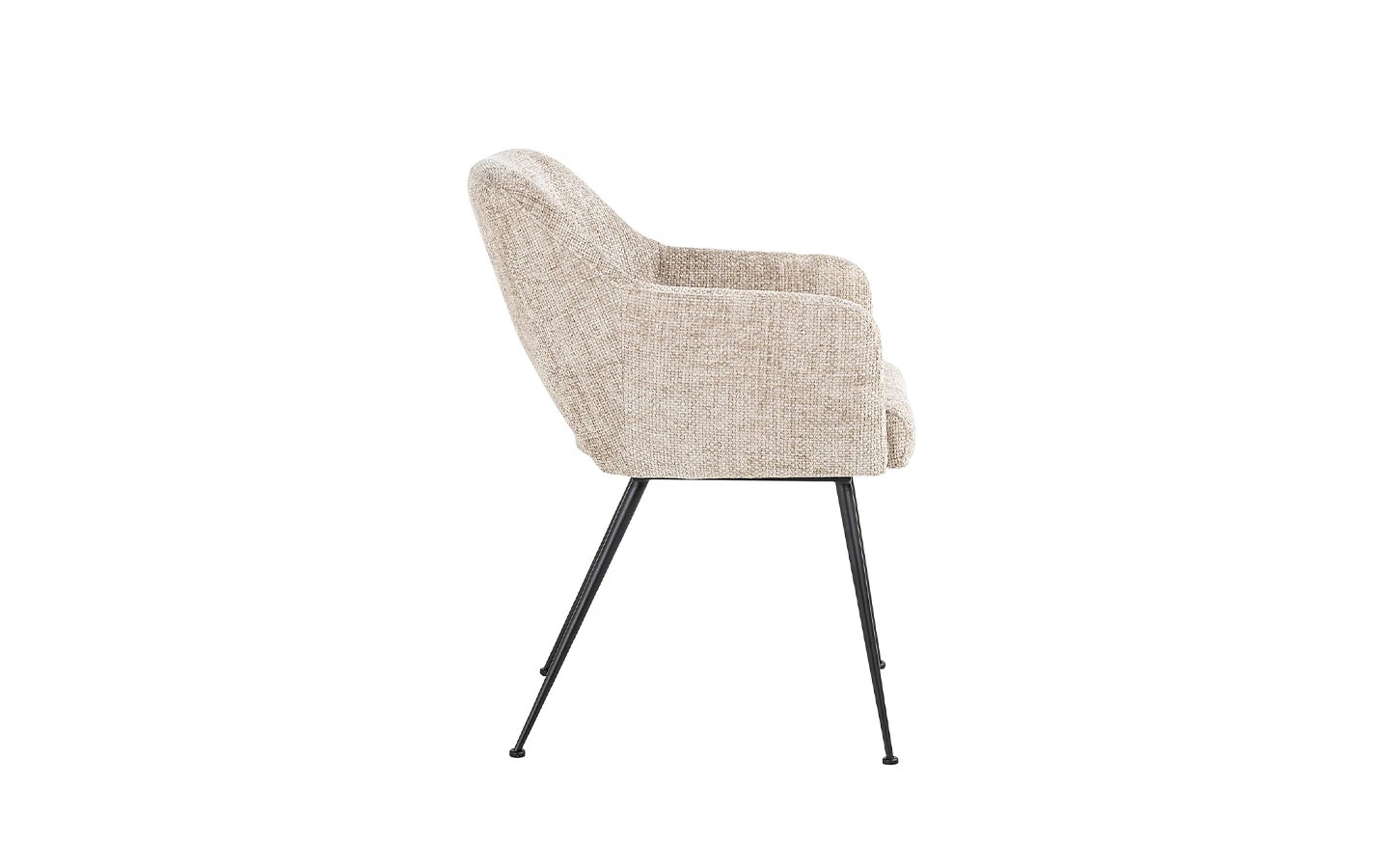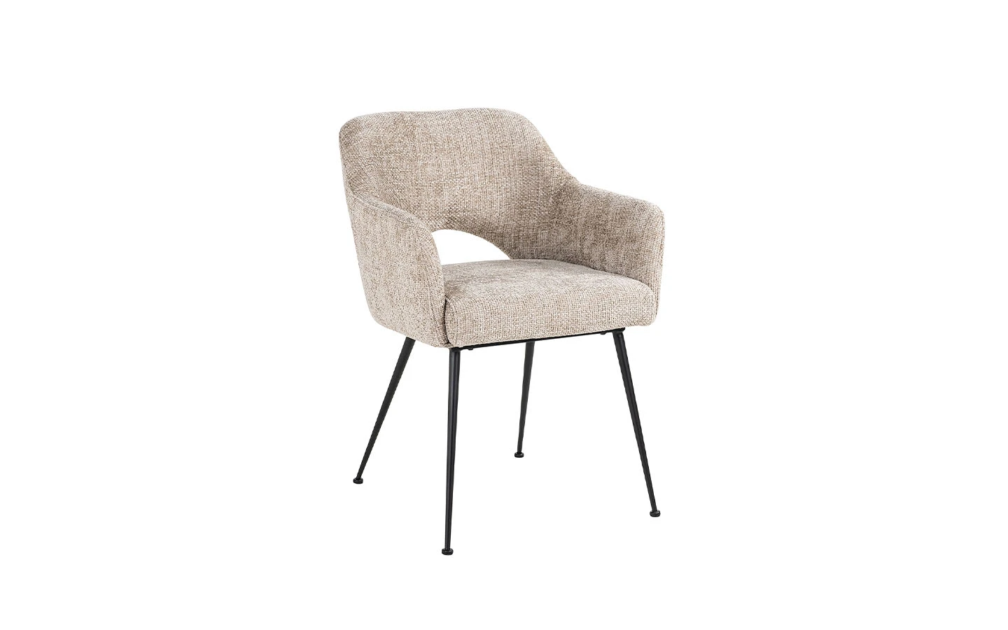 Столът JENTHE DESERT RENEGADE от Richmond Interiors е стилно и комфортно допълнение към всяка трапезария. Тапициран е с висококачествена дамаска в бежов нюанс, която придава елегантен вид и осигурява удобство при сядане. Дизайнът включва характерна облегалка с изрязана част, която добавя модерен акцент, и подлакътници, предоставящи допълнителна опора. Столът е поддържан от четири елегантни черни метални крака, които допринасят за стабилността и съвременния му облик.