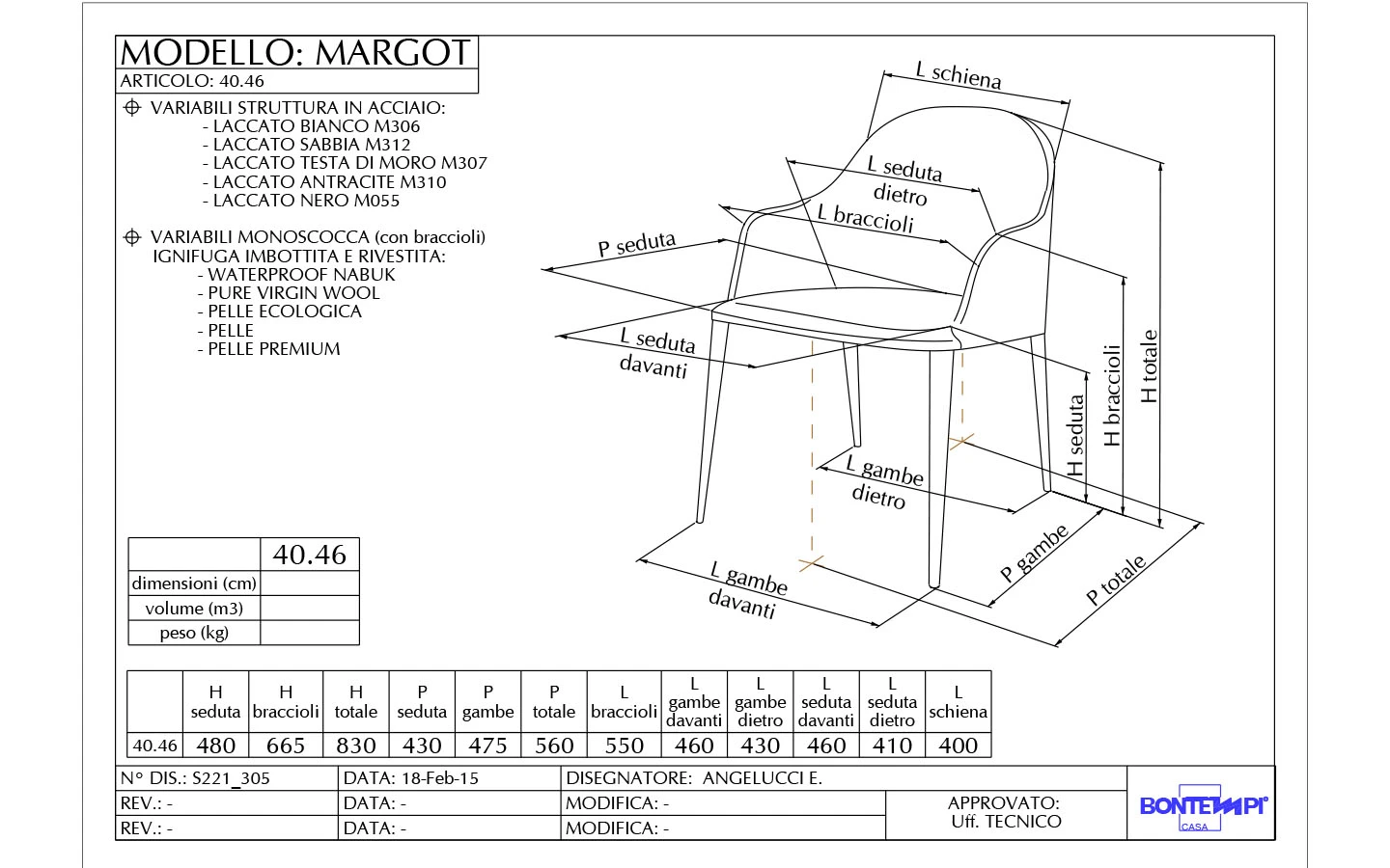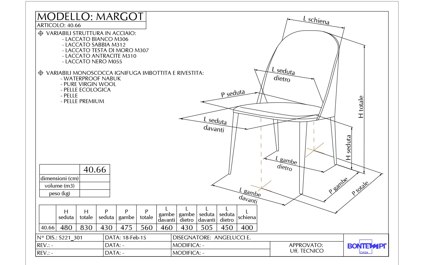 MARGOT е трапезарен стол от колекцията на италианския производител Bontempi. Структурата е изработена от метал – финиш по избор. Италианският трапезарен стол MARGOT може да бъде тапициран в дамаска, еко кожа или естествена кожа – материал и цвят по избор на клиента. Столът се предлага и с подлакътник. Опционално, гърбът на облегалката може да бъде с капитонаж на ромбове. Цената на стола се формира на база на избора на вид тапицерия, финиш на основата и това дали е с или без подлакътник.