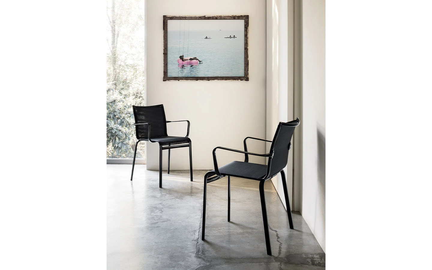 NET е трапезарен стол от колекцията на италианския производител Bontempi. Структурата и основата са изработени от метал – финиш по избор. Италианският трапезарен стол NET може да бъде изработен от мрежа Textplast или Soft Textplast – цвят по избор на клиента. Столът се предлага и с подлакътници. Цената на стола се формира на база на избора на цвят за мрежата.