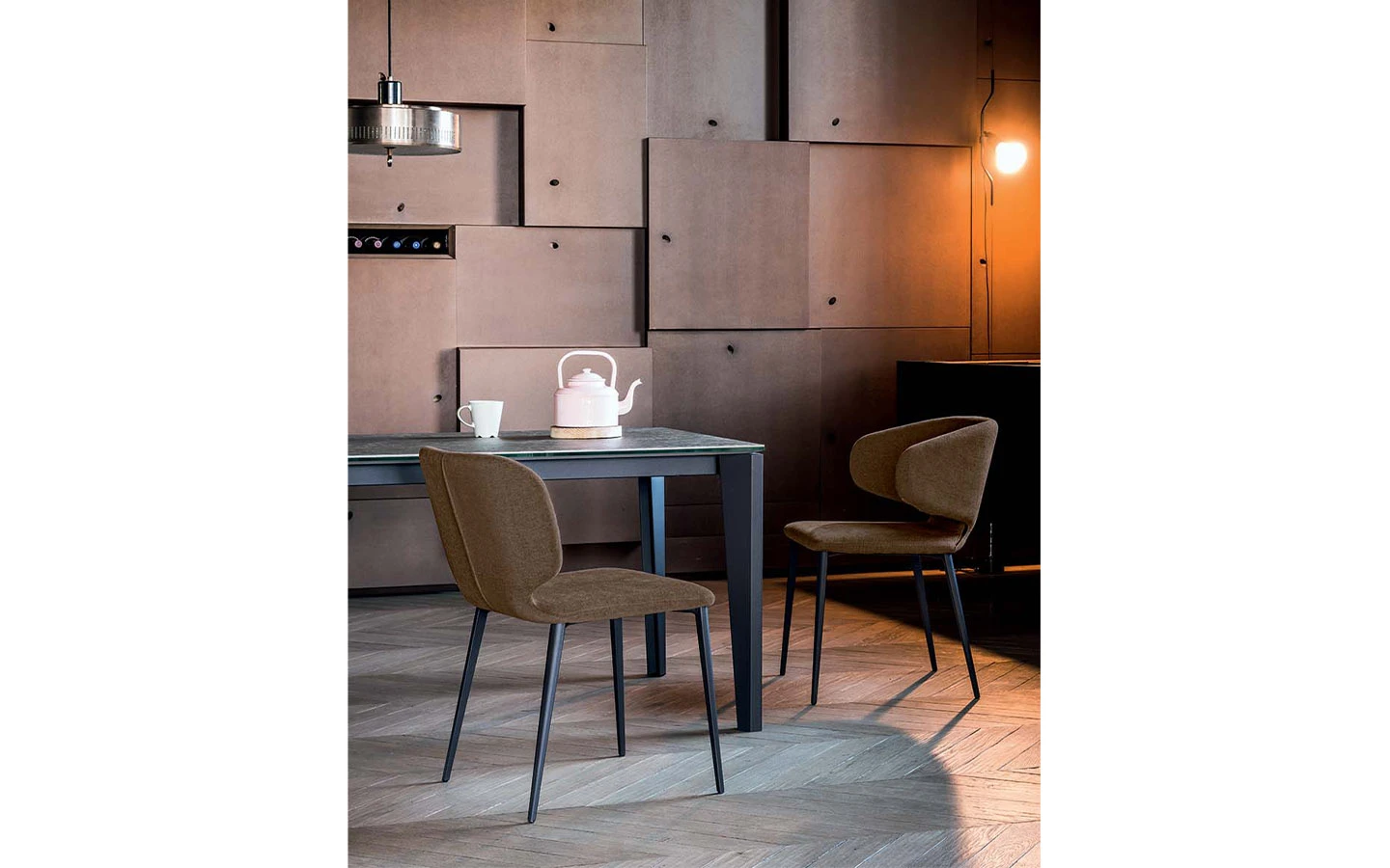Столът WRAP P M TS от MIDJ е част от колекцията Wrap, създадена през 2016 година от дизайнерското студио Balutto Associati. Този модел впечатлява с елегантен и съвременен дизайн, който съчетава стил и практичност. Конструкцията му е с четири крака от лакиран метал, осигуряващи стабилност и изчистен външен вид. Седалката и облегалката са тапицирани с естествена кожа, еко кожа или текстил, което добавя комфорт и възможност за избор според интериора и предпочитанията. WRAP P M TS е подходящ за различни пространства – домове, офиси, ресторанти и обществени зони, където се цени качеството, дизайнът и комфортът.