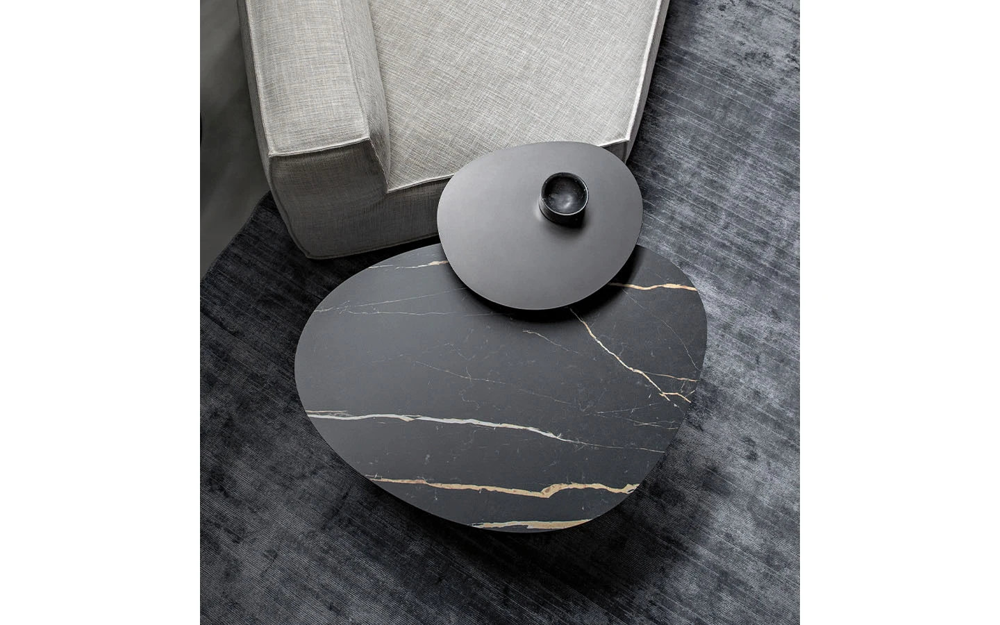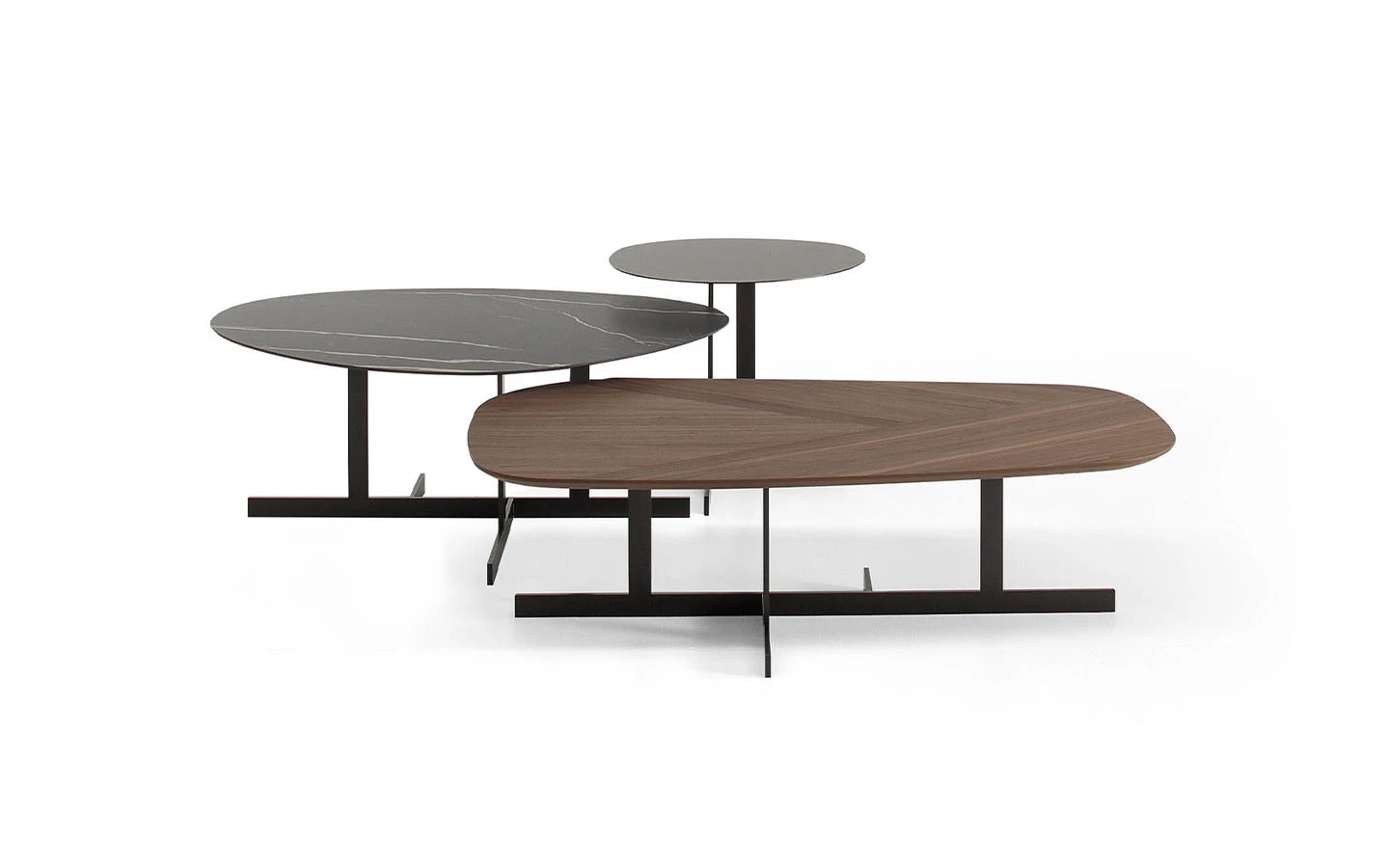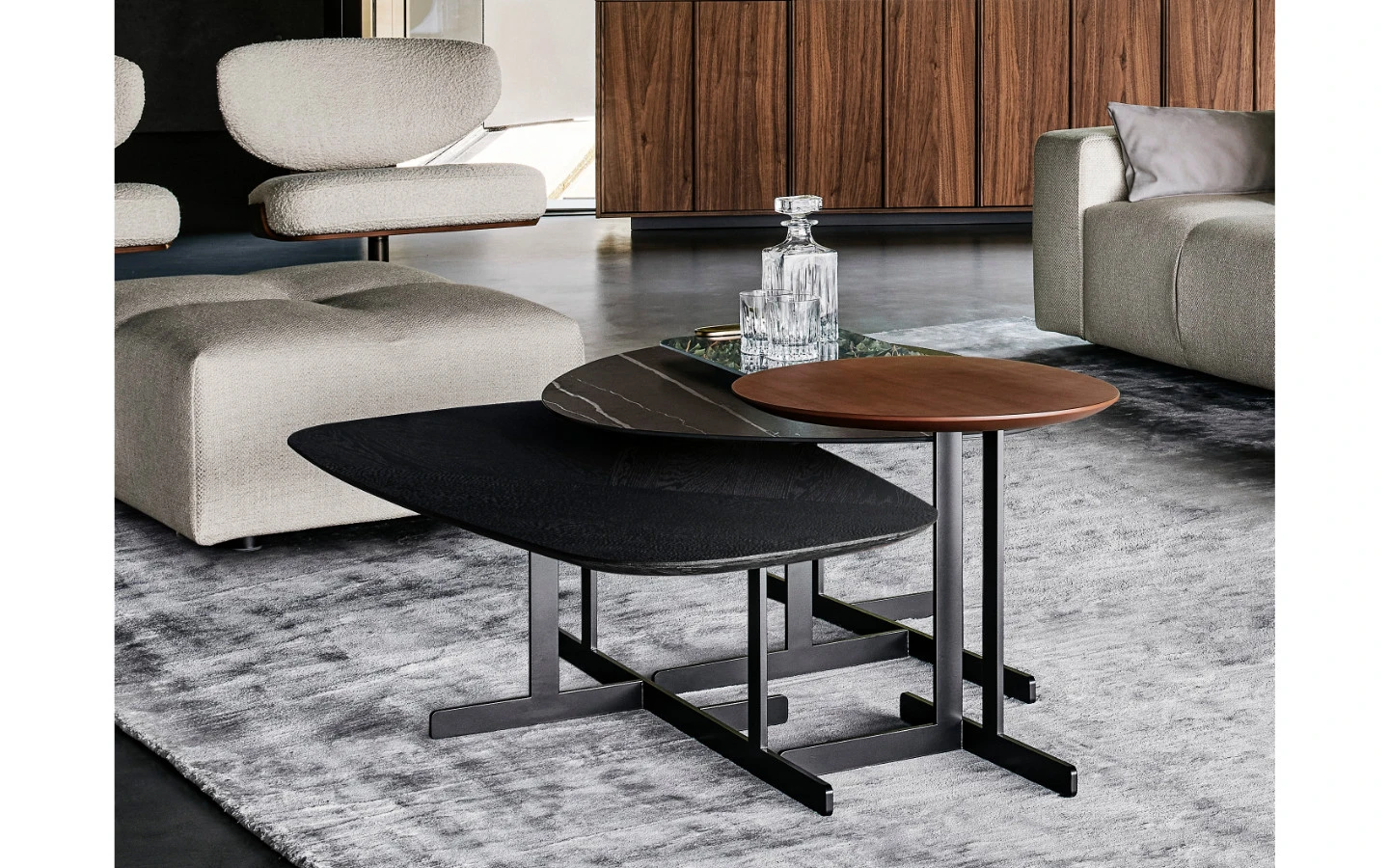 За да създаде тези странични маси KUMO, архитектът Mauro Lipparini се фокусира върху минималистичния дизайн и съчетава смелата геометрична форма на металната опора с извитите контури на плотовете, които се предлагат в различни покрития, създавайки формален контраст, изразен с максимална лекота.