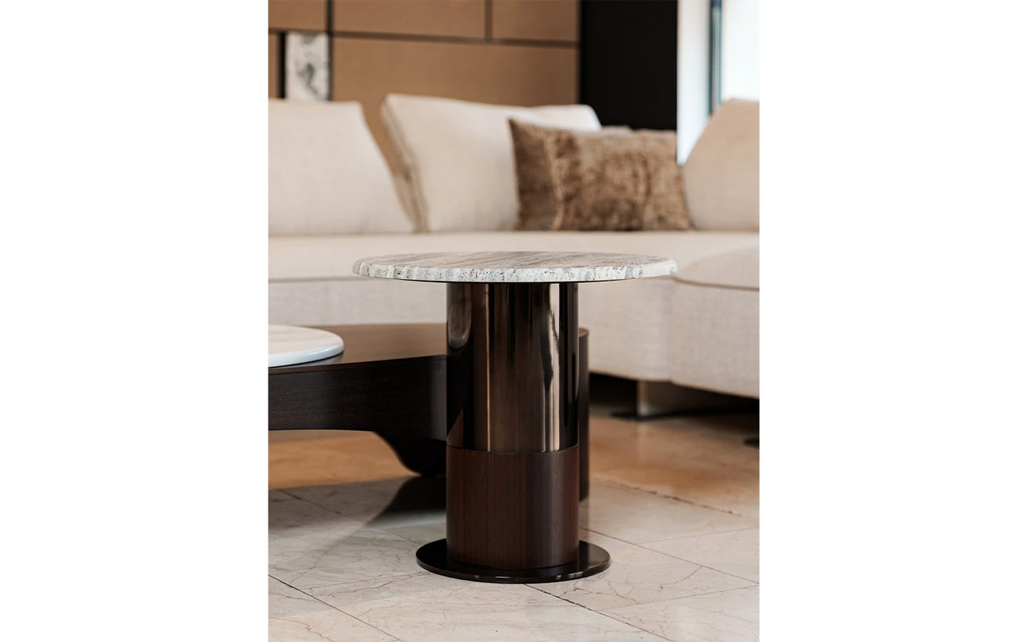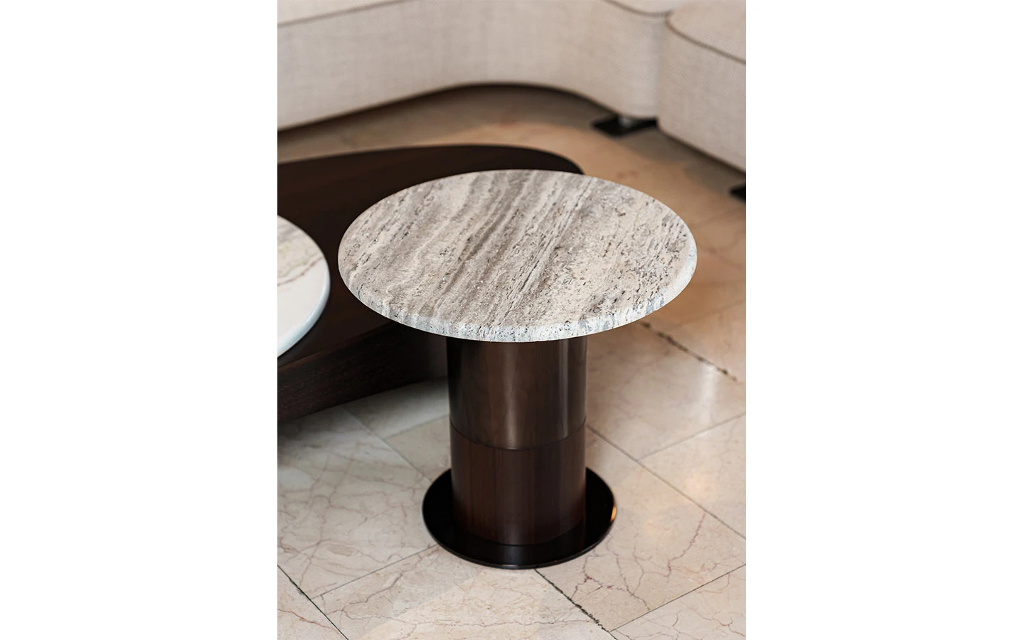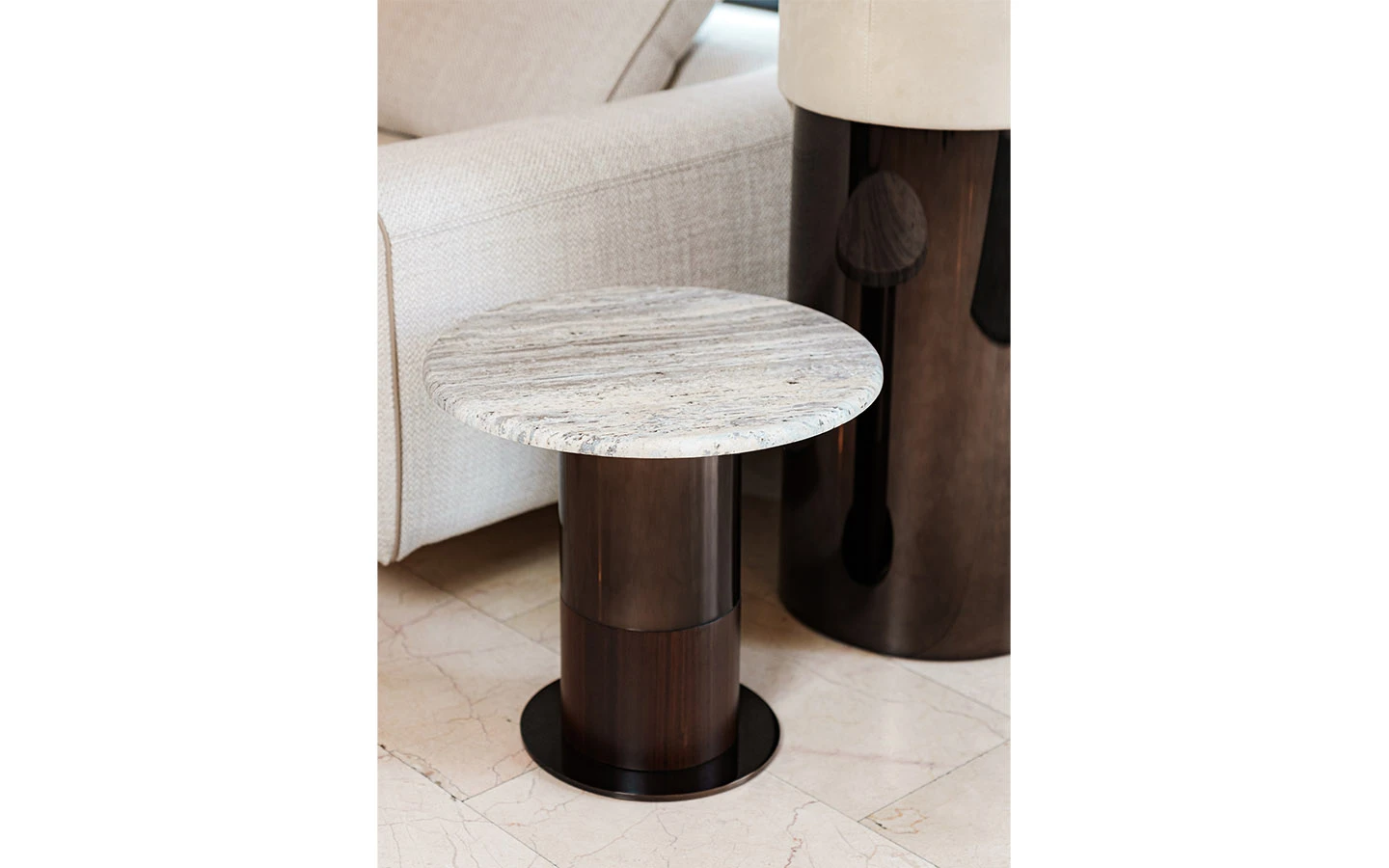 Странична маса LEDA от колекцията на италианския производител LONGHI. Основата е изработена от фурнировано дърво – финиш Matt Eucalyptus, и метал – във финиш Bright Shaded Brown. Плотът е изработен от естествен мрамор Travertino. Страничната маса е с размери см. Ø 50/50H.