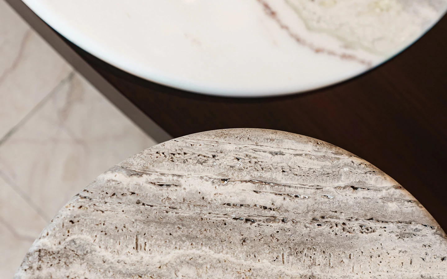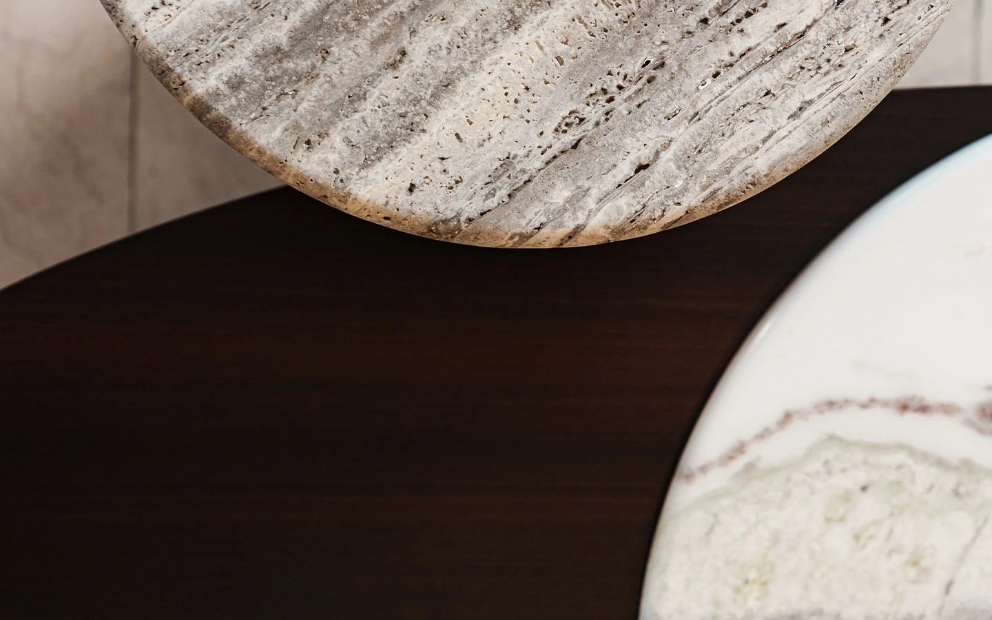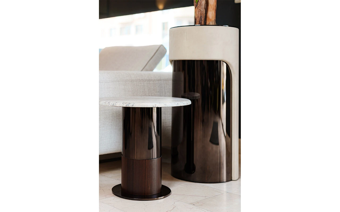 Странична маса LEDA от колекцията на италианския производител LONGHI. Основата е изработена от фурнировано дърво – финиш Matt Eucalyptus, и метал – във финиш Bright Shaded Brown. Плотът е изработен от естествен мрамор Travertino. Страничната маса е с размери см. Ø 50/50H.