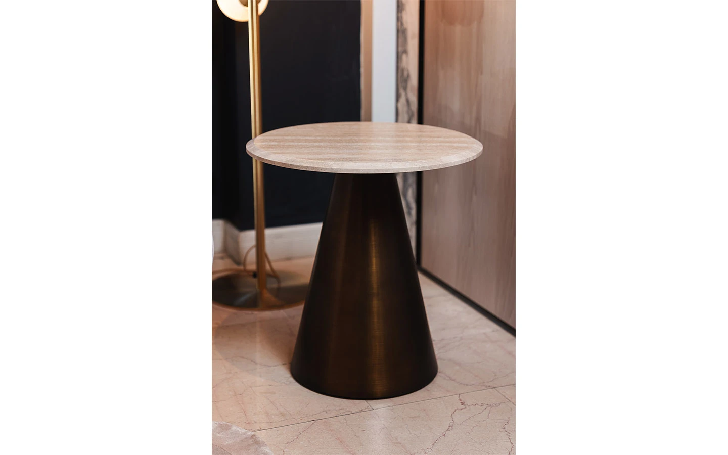 Странична маса MALIBÚ от колекцията на италианския производител Stone International. Плотът е изработен от естествен мрамор Travertino. Основата е изработена от метал – финиш Oxybronze (OXB). Страничната маса е с размери см. Ø 50/58H.