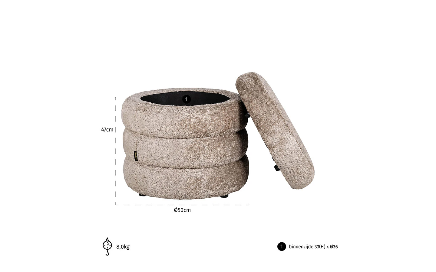 Табуретката ADELE SHEEP NATURE от Richmond Interiors съчетава елегантен дизайн с практично решение за съхранение. Тапицирана с мек плат в неутрален бежов цвят, тя придава топлина и естествено излъчване на всяко помещение. С размери 50 см ширина и дълбочина и 47 см височина, тя е практична както за сядане, така и като поставка за крака или декоративен елемент. Конструкцията ѝ е стабилна и изработена от дърво с пълнеж от полиуретанова пяна. Благодарение на изчистения си силует и неутралната си текстура, табуретката ADELE SHEEP NATURE лесно се съчетава с различни стилове обзавеждане – от скандинавски до модерен минимализъм.