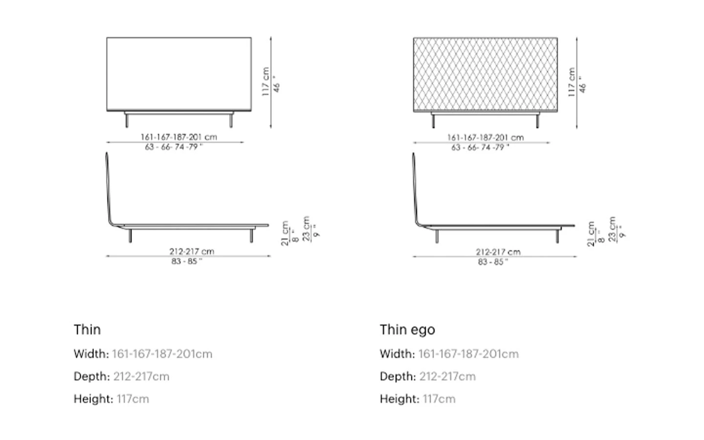 THIN е легло от колекцията на италианския производител Bonaldo. Италианското легло THIN може да бъде тапицирано в дамаска, еко кожа или кожа – материал и цвят по избор на клиента. Метални крака във финиш по избор на клиента. Моделът се предлага с гладка тапицерия или с тапицерия с капитонаж. Цената на леглото се формира на база на избора на вид тапицерия и размер на матрака.