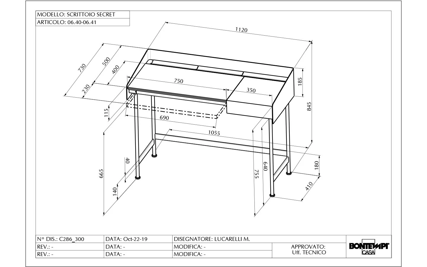 SECRET е италианскa тоалетка от колекцията на италианския производител Bontempi. Структурата на тоалетката е изработена от метал – финиш по избор. Рамката по периферията на тоалетката може да бъде изработена от метал – финиш по избор или естествен гьон – цвят по избор. Плотът може да бъде изработен от фурнировано дърво – финиш по избор на клиента. Част от плота е с отварящо се отделение, което може да бъде изработено от дърво в цвят или керамика. Зад плота има три отделения за съхранение, затварящи се с капак, облечен в естествен гьон. Опционално, тоалетката може да се поръча с чекмедже, изработено от метал в съответстващ финиш със структурата. Цената се определя спрямо избора на размер, материал и финиш на плота и финиш на основата.