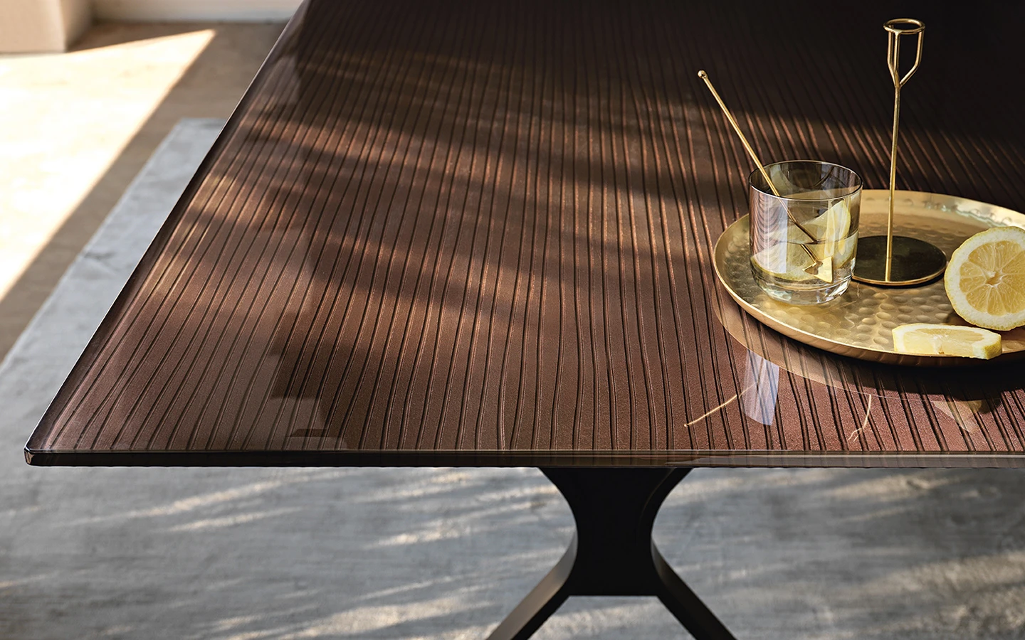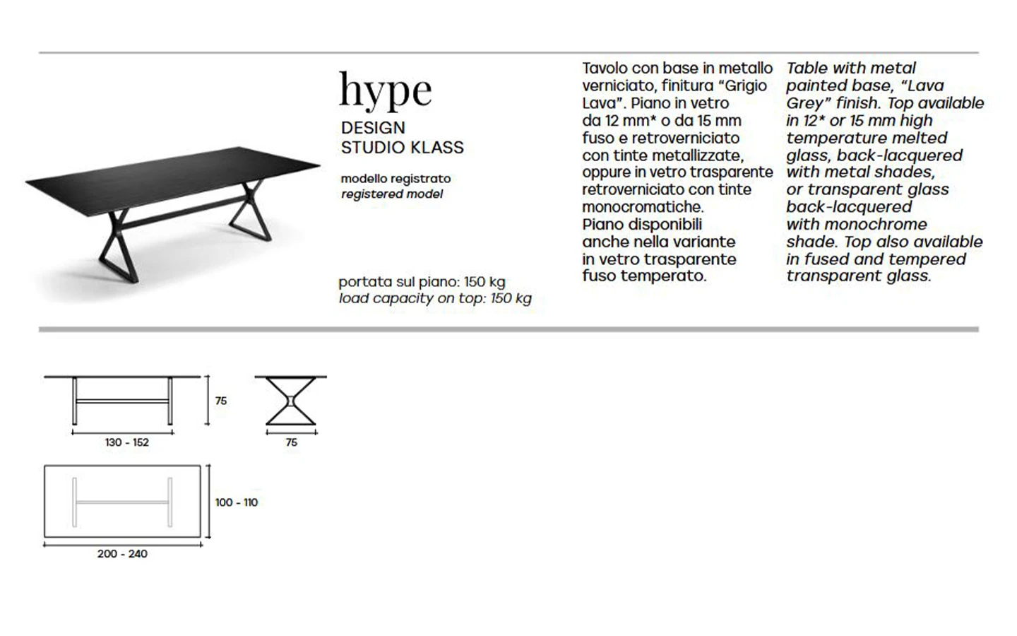 HYPE е италианска трапезарна маса от колекцията на италианския производител FIAM Italia. Плотът на масата е изработен от закалено ръчно стъкло – прозрачно или метализирано във финиш по избор. Основата е изработена от метал – финиш Lava Grey. Цената на масата се формира на база избора на размер и финиш на плота.