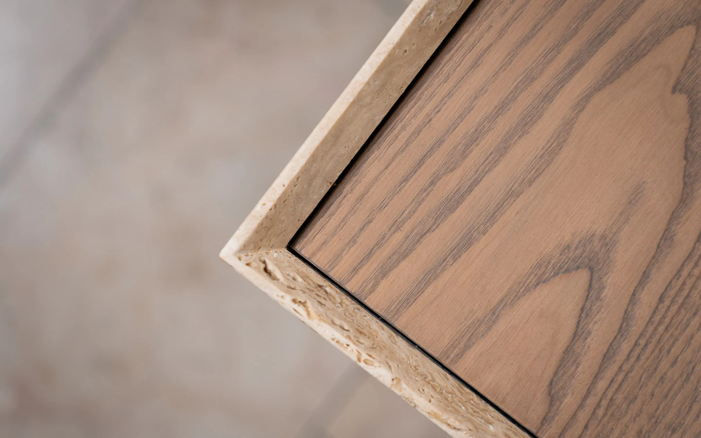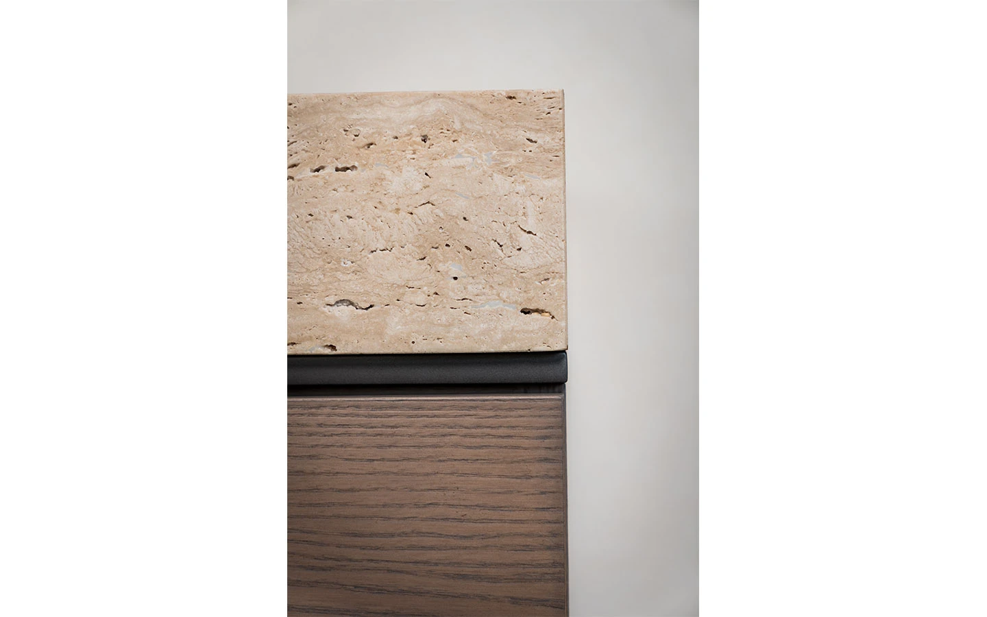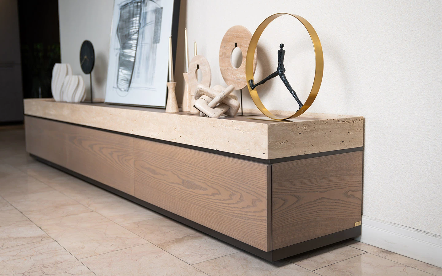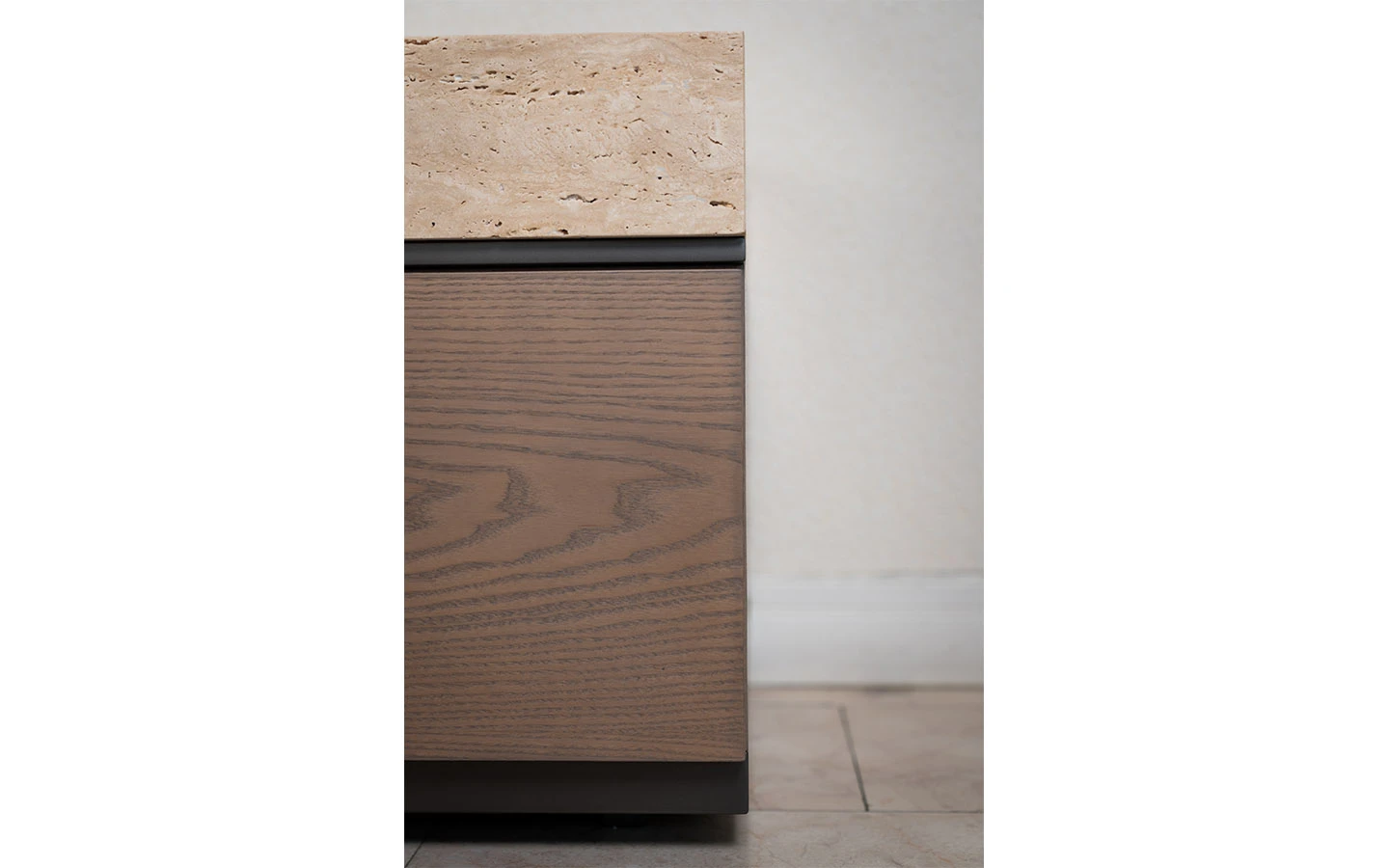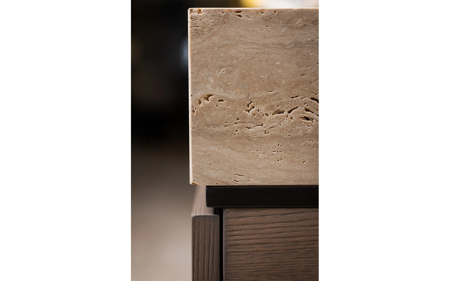 MAYFAIR е италиански шкаф от колекцията на италианския производител Shake Design. Наличният шкаф MAYFAIR е изработен от висококачествена дървена структура, три дървени чекмеджета и дървен плот във финиш T159 NOCCIOLA. Шкафът се отличава с четиристранна рамка от естествен мрамор Travertino Open Pore. Цокъл и елемент под плота във финиш DARK BRONZE.
