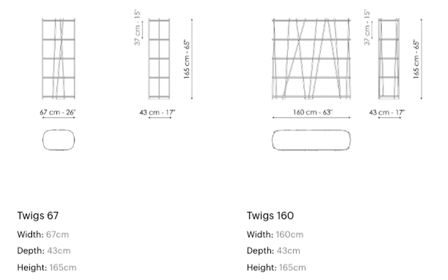 TWIGS е италианска библиотека от колекцията на италианския производител Bonaldo. Метална структура във финиш по избор на клиента. Дървени рафтове в мат лак – в съчетание с цвета на структурата. Цената на библиотеката се формира на база на избора на размер и финиши.