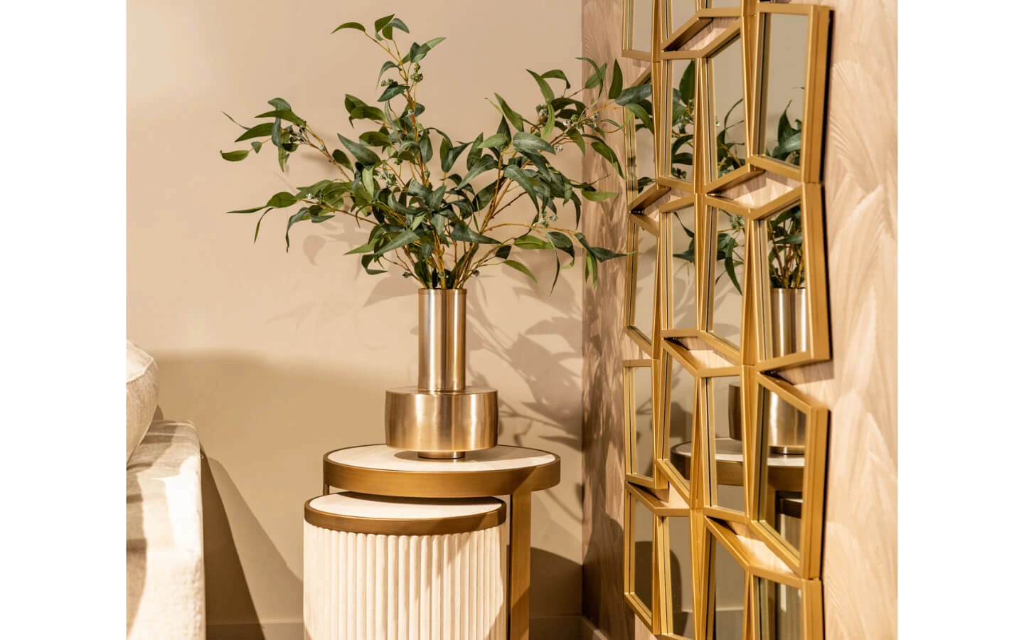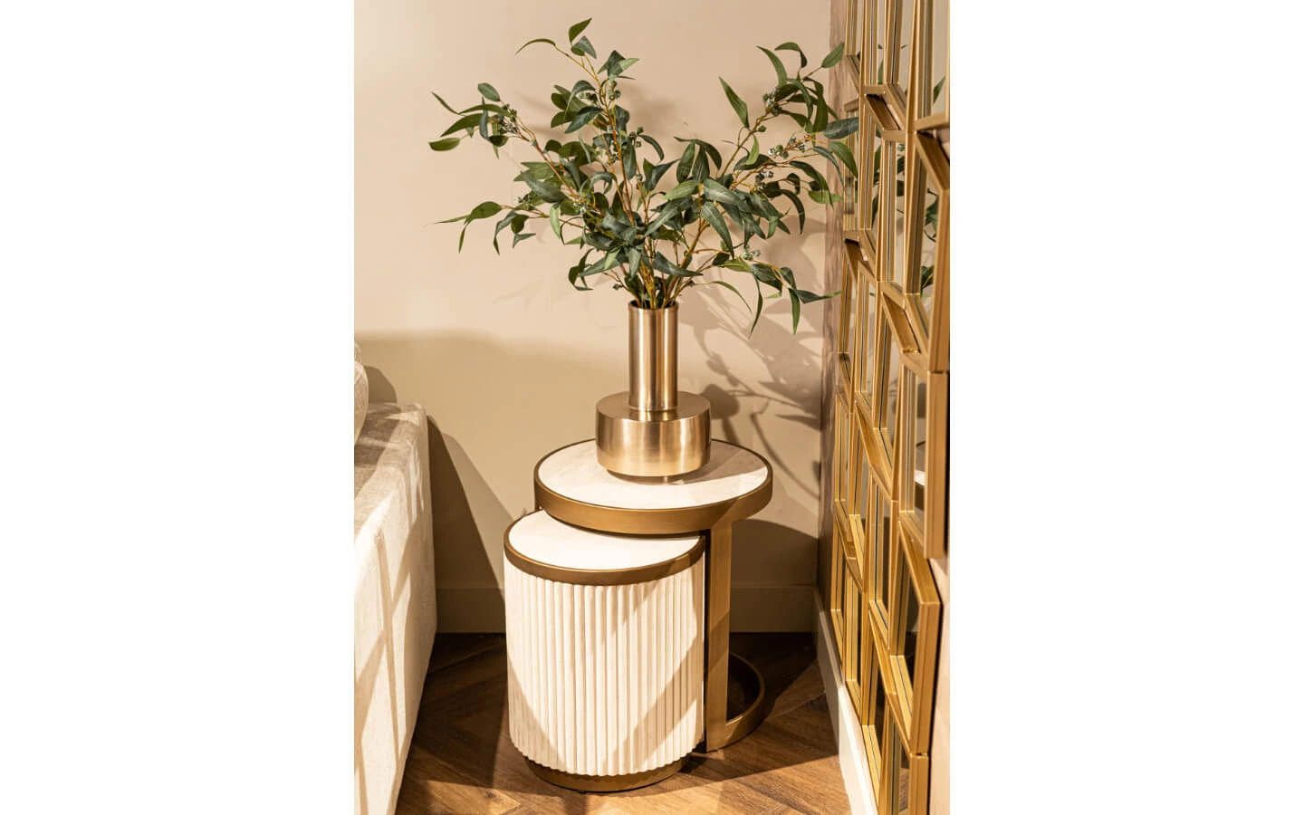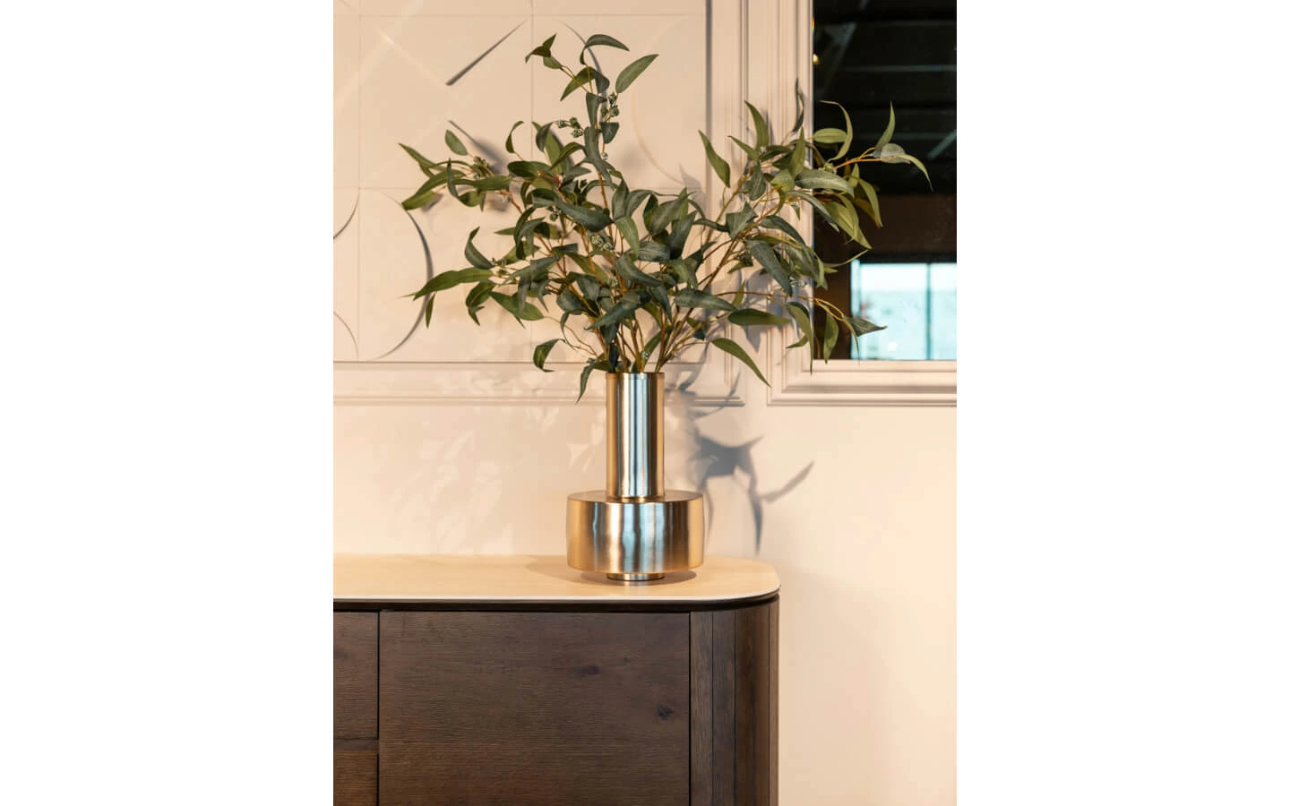 LIO от RICHMOND INTERIORS е стилна декоративна ваза с изразено луксозно присъствие, създадена да бъде акцент в интериора. Изработена е от здрав метал с елегантно златисто покритие, което придава блясък и усещане за изисканост. Формата ѝ е модерна и изчистена, което позволява лесно съчетаване както с модерни, така и с по-класически интериорни решения. VASE LIO изглежда впечатляващо както с аранжировка от цветя, така и използвана самостоятелно като декоративен елемент върху маса, шкаф или конзола. Качествената изработка и благородният завършек я превръщат в дълготрайно и стилно допълнение към всеки дом.