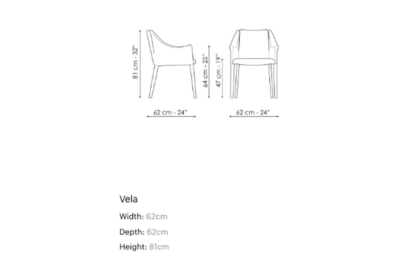 VELA е италиански трапезарен стол от колекцията на италианския производител Bonaldo. Италианският трапезарен стол VELA може да бъде изцяло тапициран в дамаска, еко кожа или естествена кожа – материал и цвят по избор на клиента. Столът се предлага и с метални крака във финиш по избор на клкиента. Цената на стола се формира на база на избора на тапицерия и вид основа.