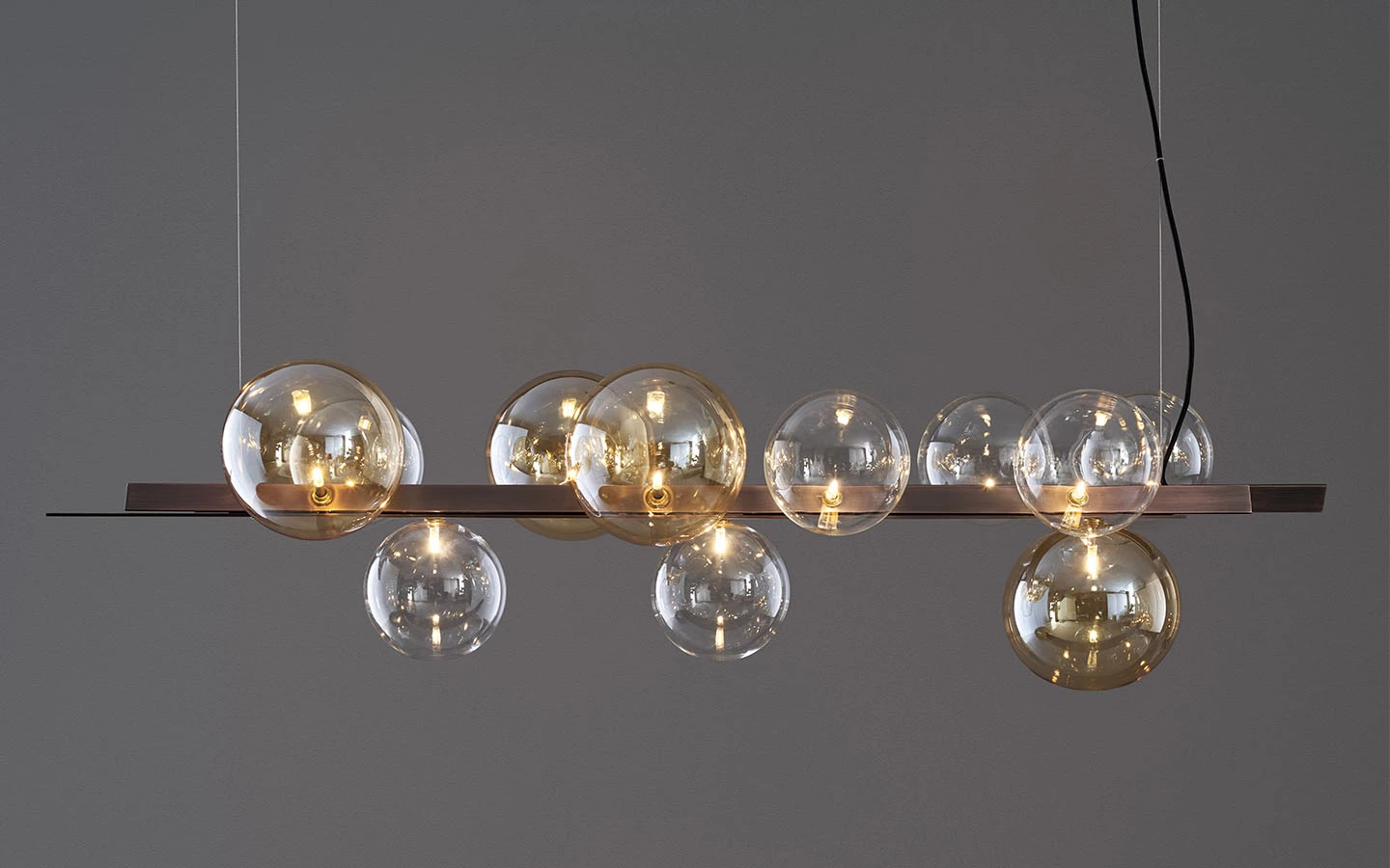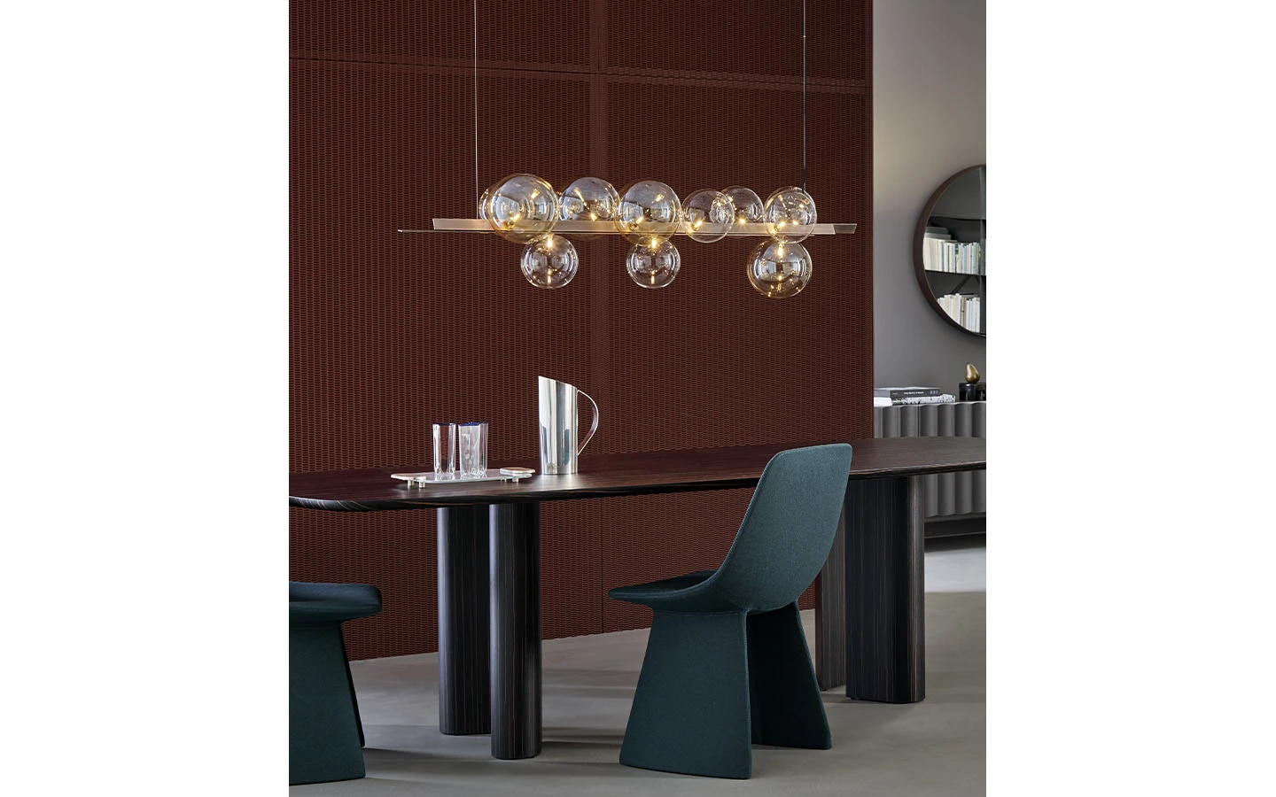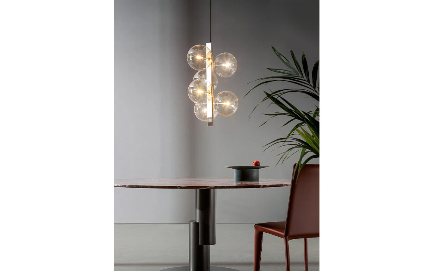 Висящата лампа BON TON, проектирана от Studio Team Design за Bonaldo е изискано осветително тяло. Стъклените глобуси, които оформят абажурите, са разположени в неравномерна подредба, което подчертава тяхната динамична природа. Тези глобуси се предлагат в прозрачно, кехлибарено или опушено стъкло. Лампата се предлага в различни конфигурации, включително с единичен глобус, както и варианти с три, шест или единадесет светлини, осигурявайки гъвкавост за различни интериорни пространства.