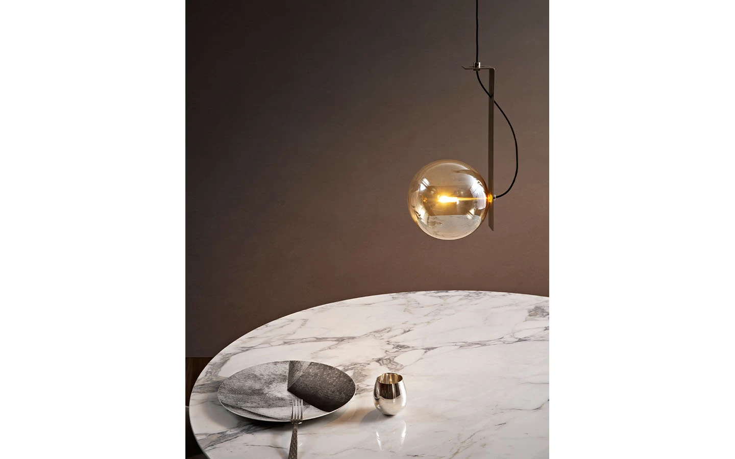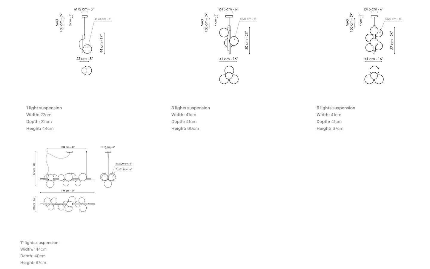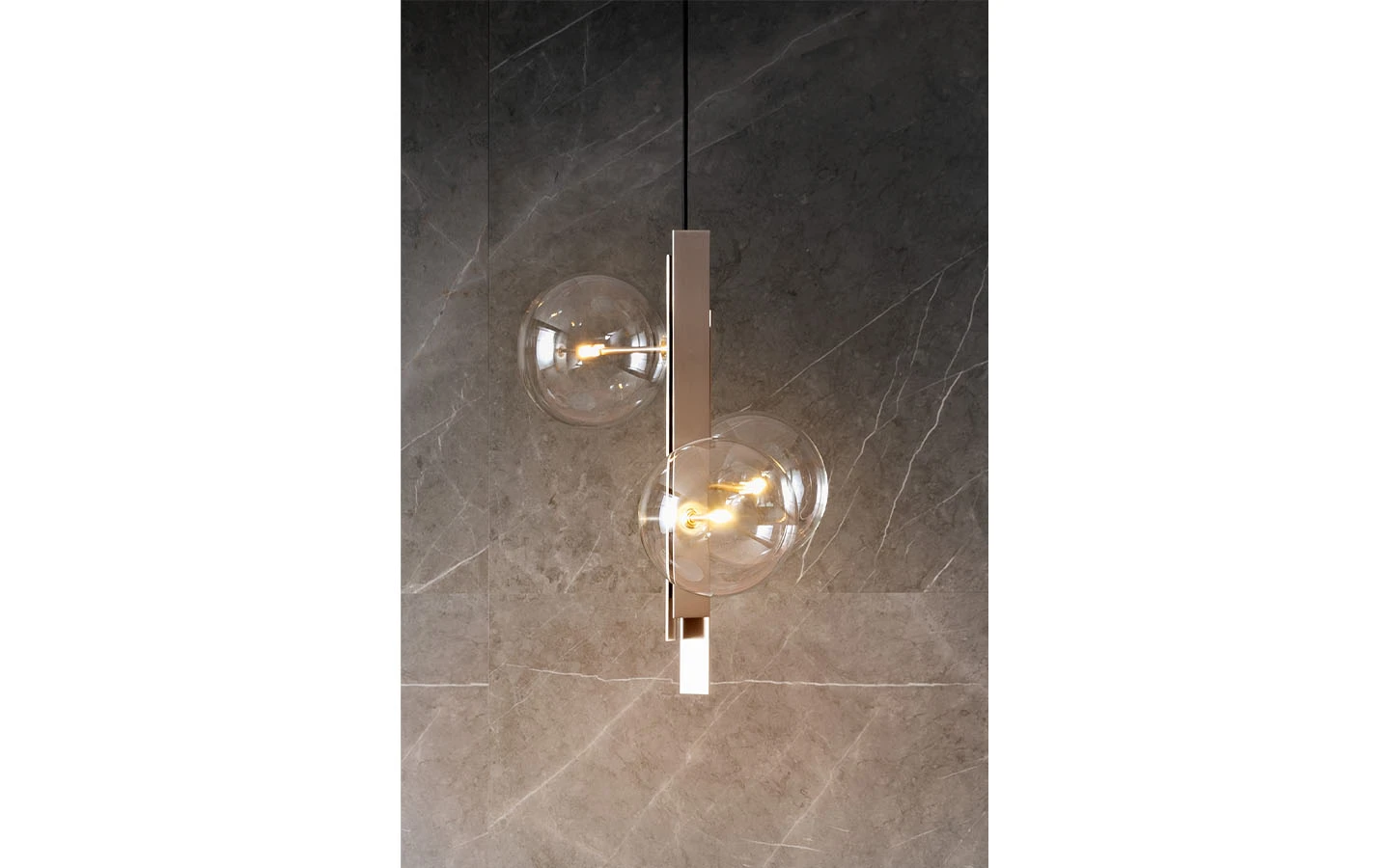 Висящата лампа BON TON, проектирана от Studio Team Design за Bonaldo е изискано осветително тяло. Стъклените глобуси, които оформят абажурите, са разположени в неравномерна подредба, което подчертава тяхната динамична природа. Тези глобуси се предлагат в прозрачно, кехлибарено или опушено стъкло. Лампата се предлага в различни конфигурации, включително с единичен глобус, както и варианти с три, шест или единадесет светлини, осигурявайки гъвкавост за различни интериорни пространства.
