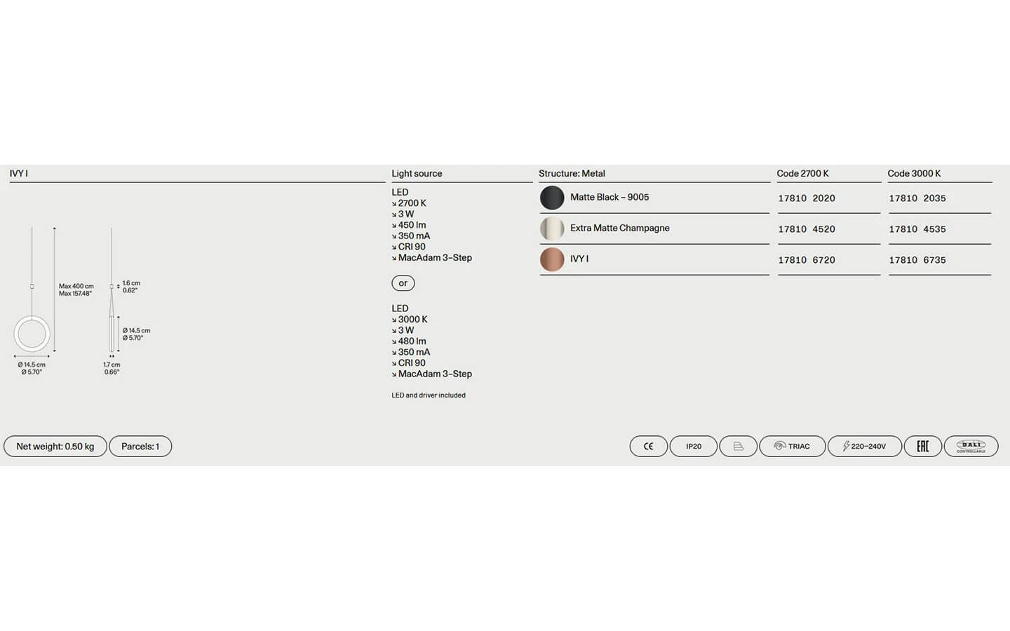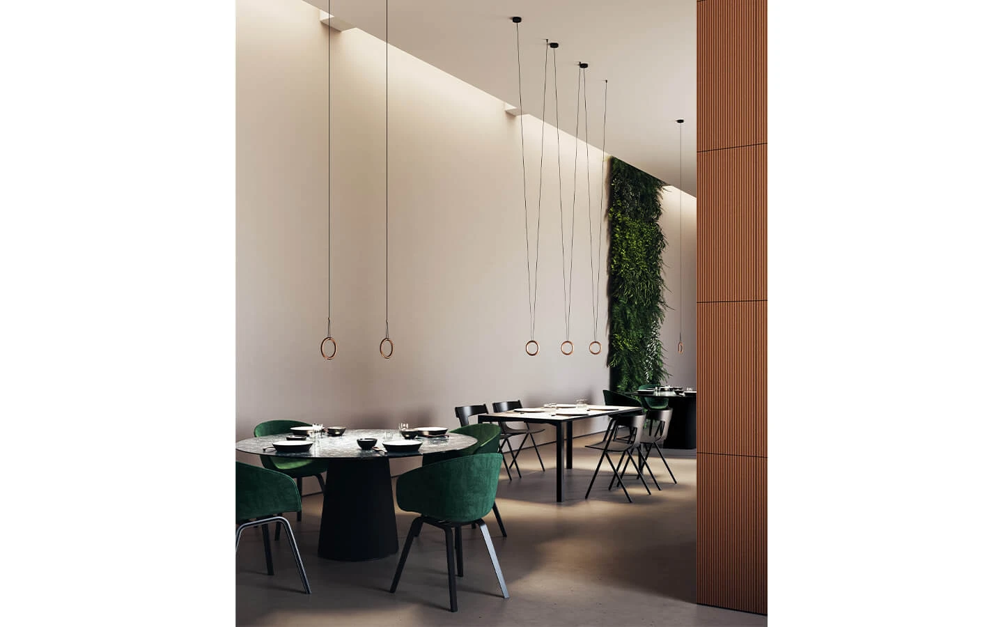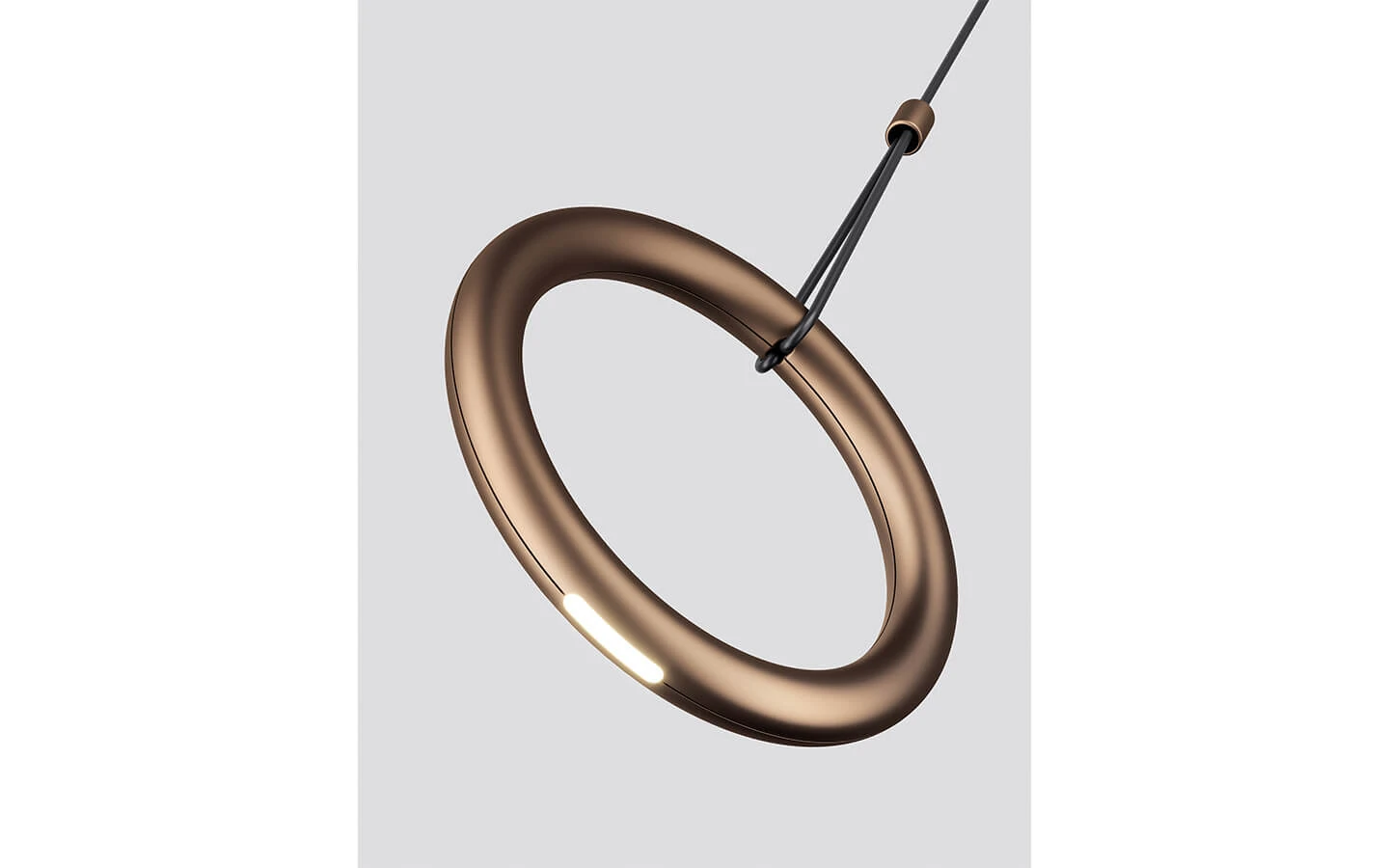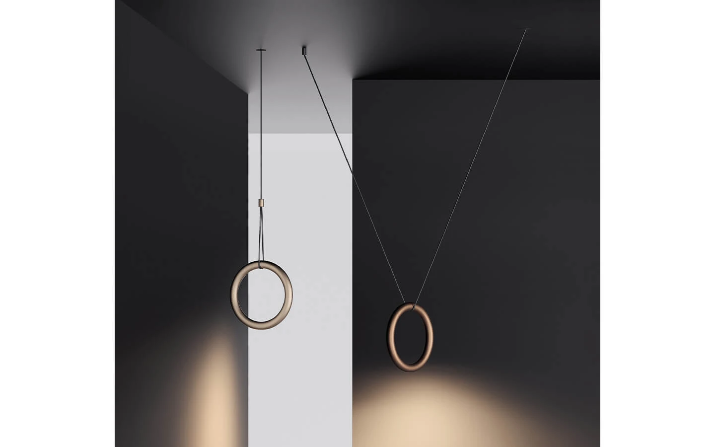 IVY CLUSTER от LODES е изтънчено и минималистично висящо осветително тяло, което превръща светлината в графичен елемент на интериора. Дизайнът е базиран на тънък метален пръстен, окачен на тънък кабел, който захранва интегрирания LED модул. В cluster конфигурация няколко от тези пръстени могат да бъдат окачени от обща розетка на различни височини, създавайки впечатляващи, динамични композиции, които играят с пространството и светлината, подчертавайки архитектурни детайли и зони на интерес. Светлината се излъчва надолу през продълговата прорезна форма на пръстена, осигурявайки равномерно и приятно осветление, което добавя атмосфера и елегантност към модерни жилищни или обществени пространства като дневни, трапезарии, хотели и ресторанти. Този модел съчетава функционалност и декоративна стойност, предлага се в няколко изискани покрития като матово черно, екстра матово шампанско и земни тонове и включва интегрирани LED светлинни източници с висок индекс на цветопредаване.