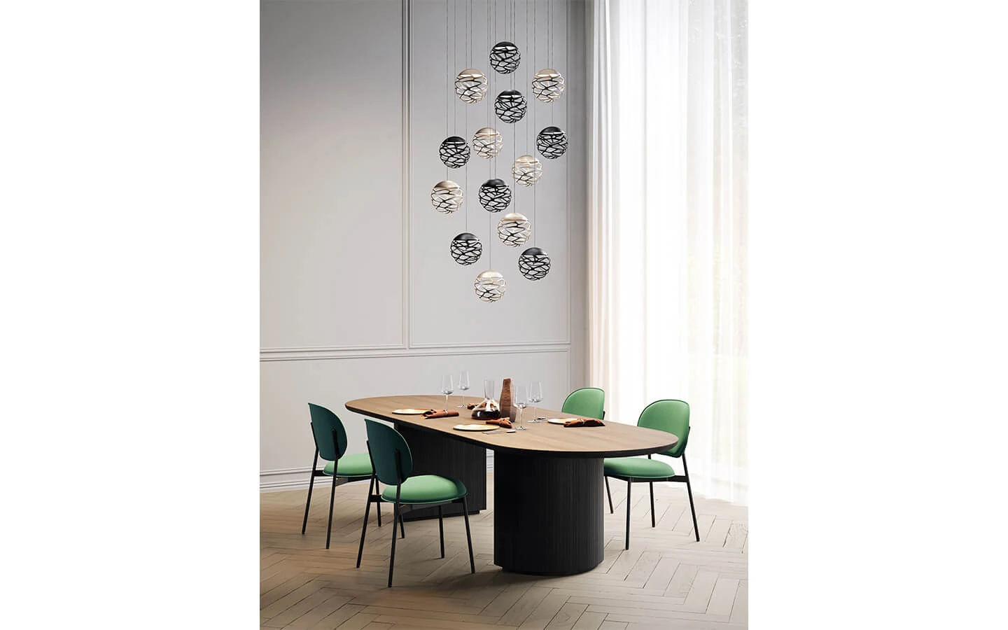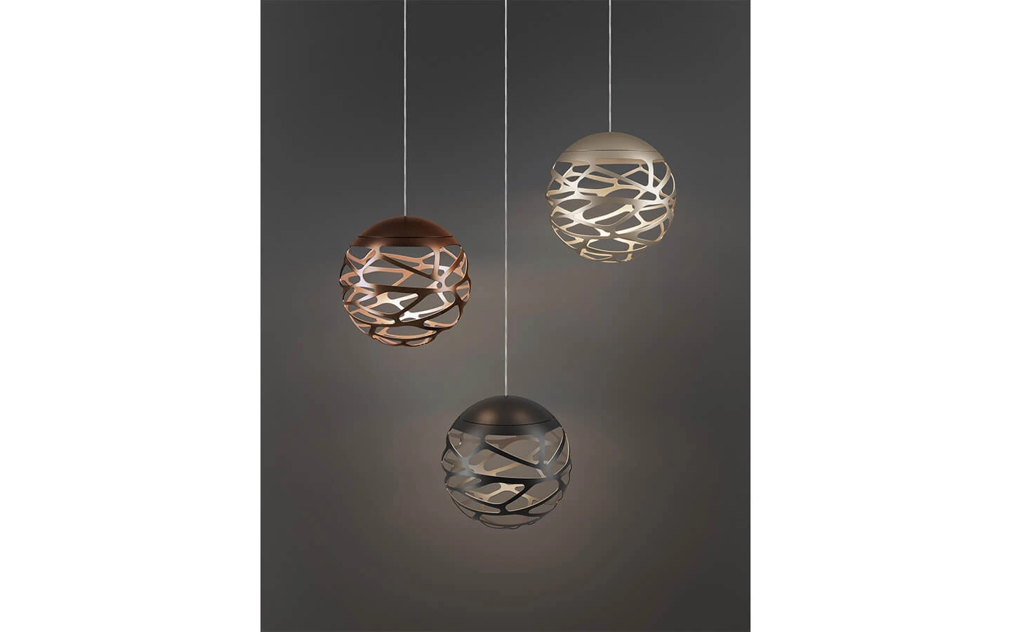 KELLY CLUSTER от LODES е изразително висящо осветително тяло със силно декоративен характер, което превръща светлината в емоционален и визуален акцент. Моделът се отличава със сферична форма от метал, прецизно изрязана с фин орнамент, който напомня естествени мотиви и създава богата игра на светлосенки в пространството. Във версията cluster няколко тела са окачени от обща розетка и разположени на различни височини, което позволява създаване на впечатляващи светлинни инсталации със скулптурно присъствие. KELLY CLUSTER е подходяща както за жилищни интериори – над трапезни маси, в дневни или антре, така и за представителни обществени пространства като ресторанти, хотели и лобита, където осветлението играе ключова роля за атмосферата. Съчетавайки италиански дизайн, висококачествени материали и деликатна светлина, този модел се превръща в централен декоративен елемент във всеки модерен интериор.