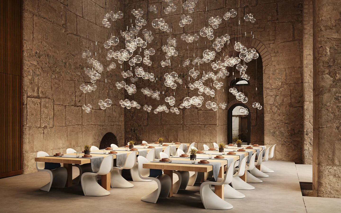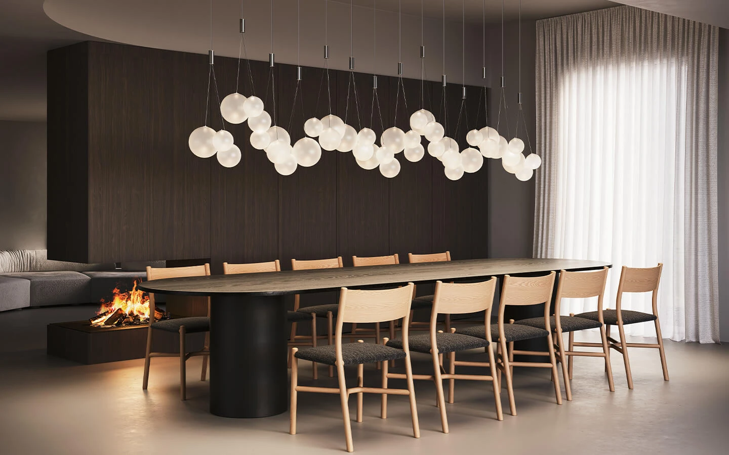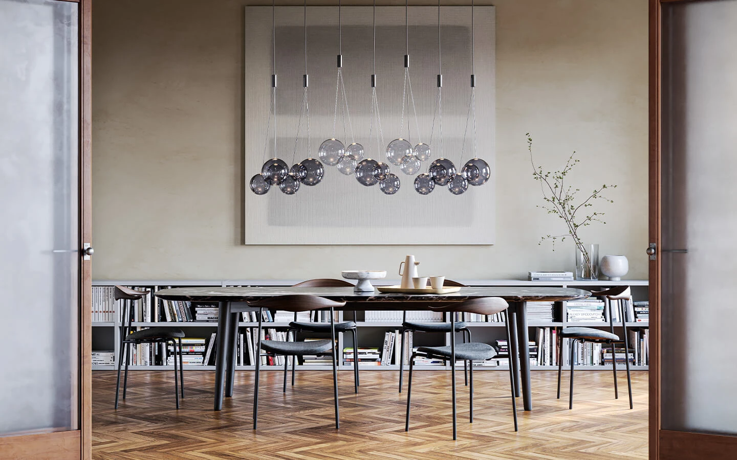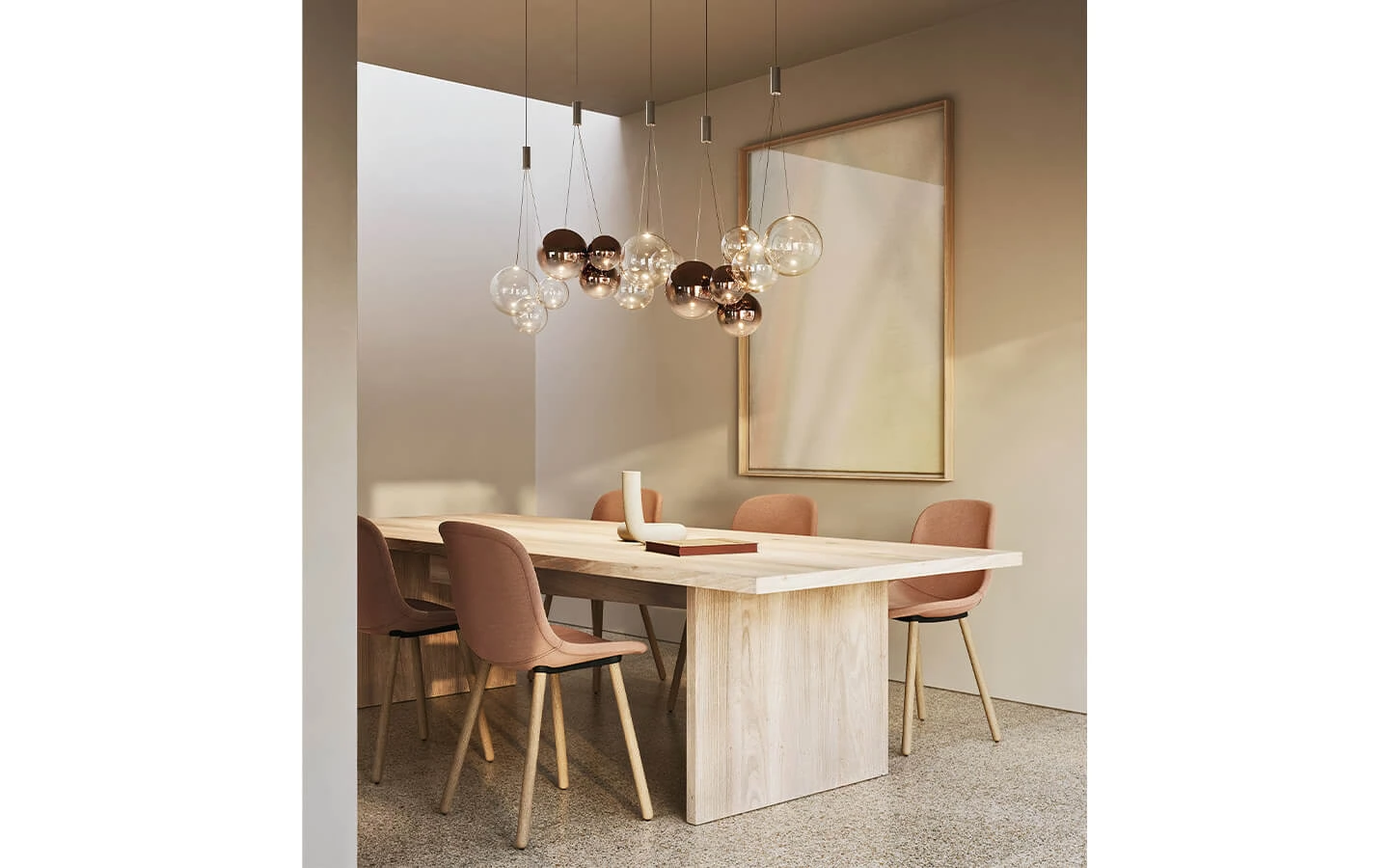 RANDOM от LODES е изразително висящо осветително тяло с артистичен и свободен характер, което превръща светлината в динамична пространствена композиция. Дизайнът се състои от множество сферични елементи от ръчно духано стъкло, окачени на различни височини от обща розетка, като всяка сфера има фини, индивидуални вариации във формата си. Това придава на осветлението органично излъчване и усещане за движение, сякаш светлината е разпръсната в пространството по естествен начин. Светлината е мека, топла и равномерно разпределена, създавайки уютна и обгръщаща атмосфера без резки сенки или отблясъци. RANDOM е подходяща както за жилищни интериори – над трапезни маси, в дневни или антре, така и за представителни обществени пространства като хотели, ресторанти и лобита, където осветлението играе ключова роля за първото впечатление. Съчетавайки ръчно изработено стъкло, съвременна LED технология и силен декоративен израз, този модел се превръща в централен визуален акцент с изразено емоционално присъствие.
