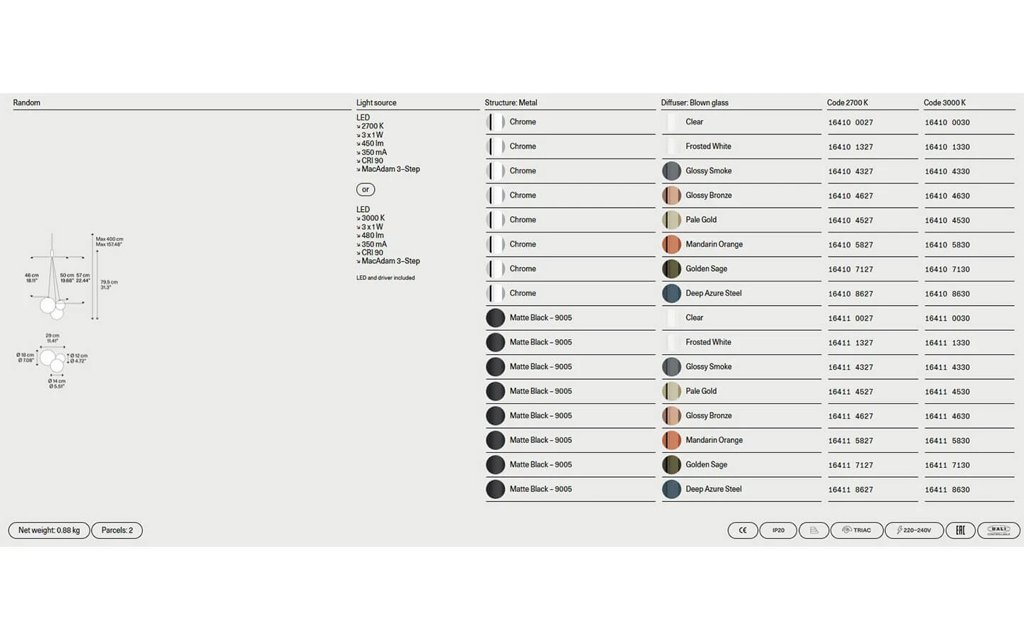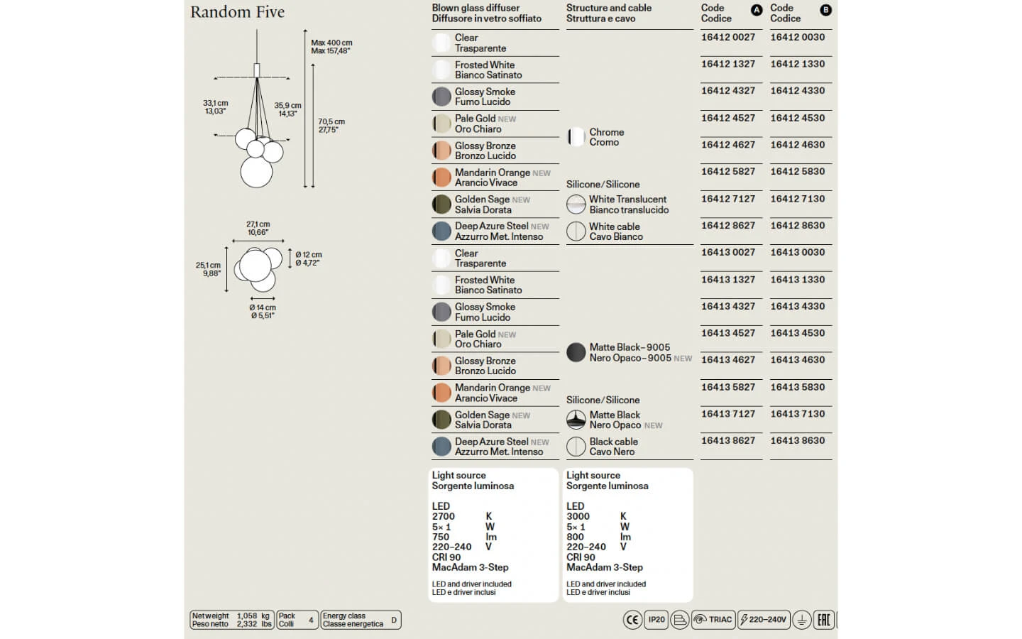 RANDOM е модулно висящо осветително тяло от колекцията на италианския производител LODES. Розетката е изработена от метал – финиш по избор. Структурата е изработена от метал – финиш по избор. Кабелът е изработен от силикон – финиш по избор. Дифузерът е изработен от ръчно духано стъкло – финиш по избор. Цената се определя спрямо избора на конфигурация, размер, вид розетка, финиш на метала при розетката и финиш на стъклото при дифузера.